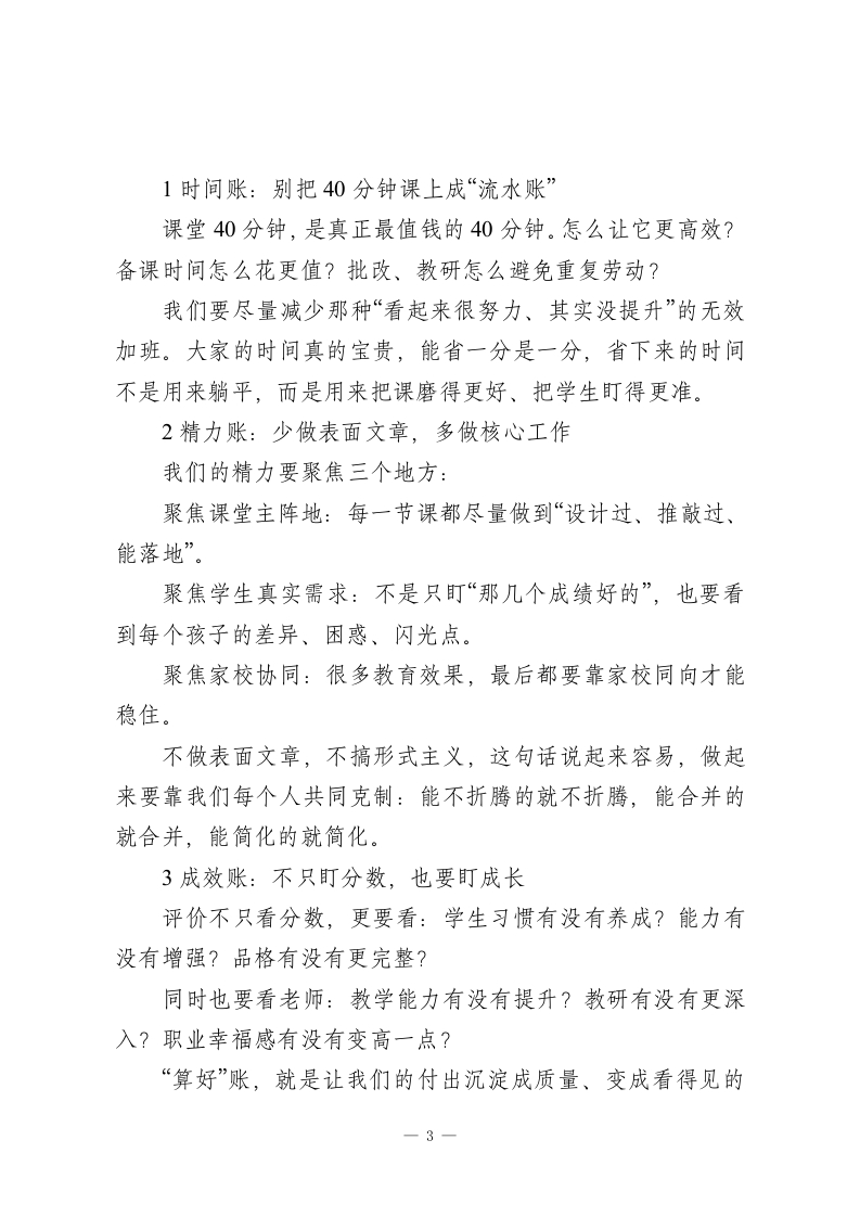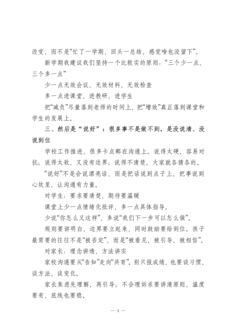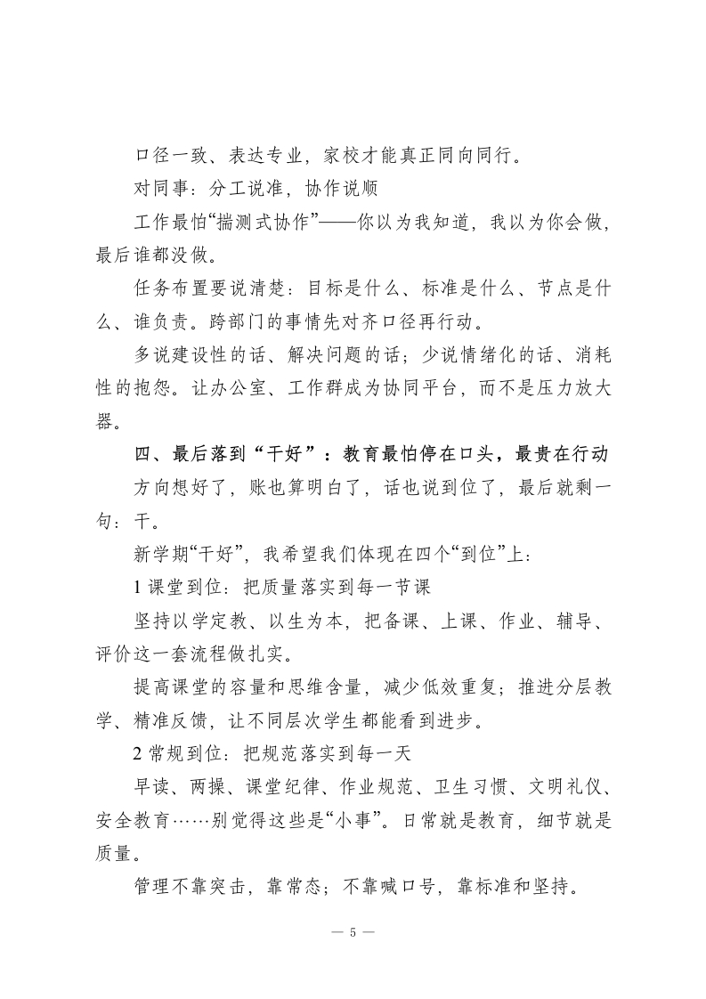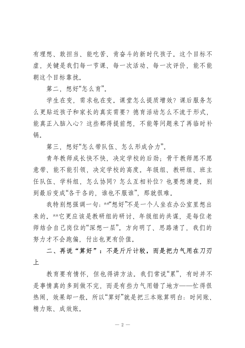 2026春季新学期,校长在全体教师大会上精彩讲话:以“四好”践初心,以实干育新人各位老师:大家上午好!今天把大家请到一起,一方面是新学期的工作部署会,另一方面我更愿意把它当成一次“把心拧到一处”的鼓劲会。说白了,新学期事情多、节奏快,大家都忙,但越忙越需要先把方向和方法想清楚,不然很容易“忙成一团”,回头一看,效果不明显,人还累得不行。教育这件事,说是职业,其实更像一场长期修行。它不靠一时激情,靠的是持续用心、持续用力、持续校准。今天我不想讲太多“高大上”的话,就抓四个很朴素、但特别管用的关键词跟大家聊聊:想好、算好、说好、干好。四个字不复杂,但里面就是我们把学校办好、把孩子带好的核心逻辑。一、先把“想好”放在前面:方向不清,后面全是折腾我们做教育不是盲目赶路,得知道自己要把孩子带到哪里去。“想好”主要想三件事:往哪走、怎么走、谁来一起走。第一,想好“培养什么样的学生”。要对标教育方针、新课标要求,也要结合我们学校的实际和特色。我们希望孩子最终长成什么样?我觉得可以更直白一点:不是只会做题的人,而是德智体美劳全面发展的少年;是1