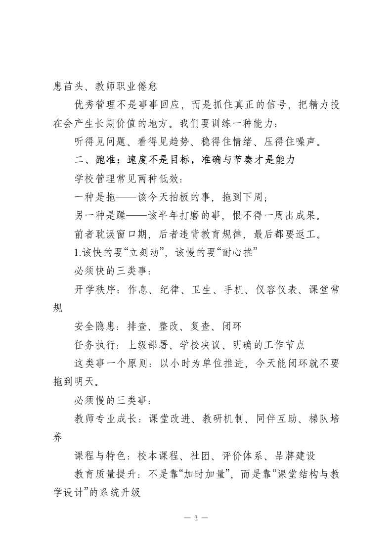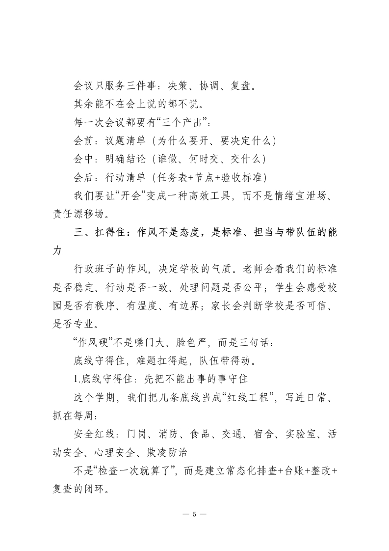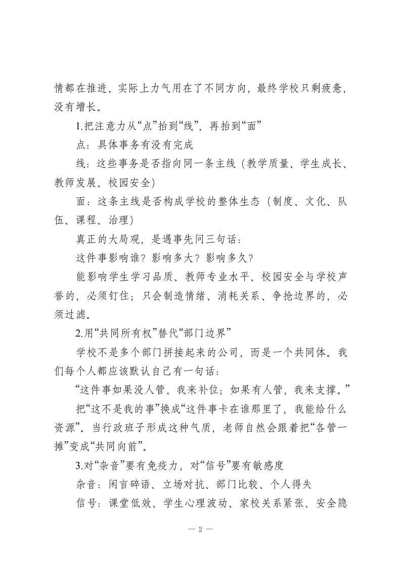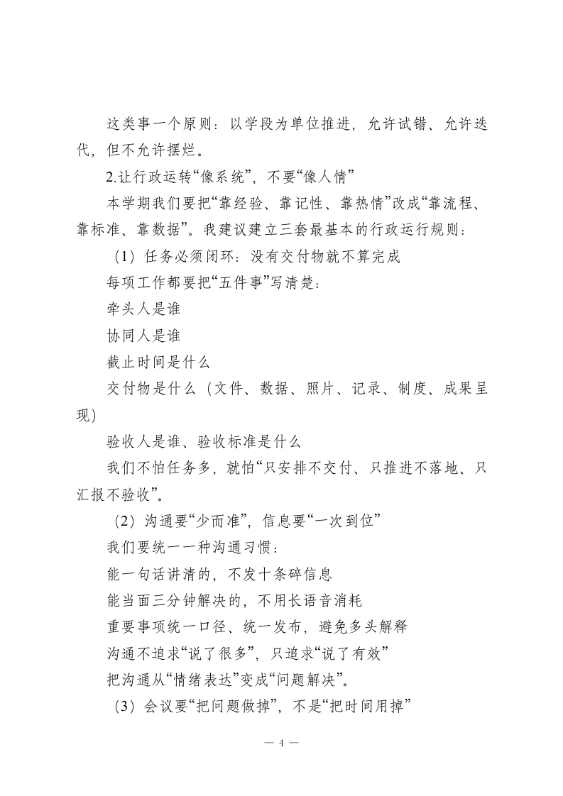 2026春季新学期第一次行政班子会,校长讲话:用格局破局,以效率提速,靠质量立校(1)各位行政同仁:上午好!新学期的第一场行政班子会,不是“把人叫齐”的例会,而是一场“把心叫回来的”对齐会:把节奏对齐、把标准对齐、把责任对齐、把方向对齐。开学像把一艘船推出港口一一风向、航道、速度、纪律,哪一项没对准,后面就会用加倍的力气去补救。学校的管理看起来总是繁杂:一间办公室的整洁、一堂课的状态、一条安全通道的通畅、一个学生的情绪变化…都不像“惊天动地的大事”,但它们决定了学校的底盘是否稳、教育的质量是否真、师生的获得感是否实。我们常说“学校无小事”,不是因为学校爱管闲事,而是因为每一件小事都可能是某个孩子人生的重要变量。今天我想换一种讲法:我们行政团队这个学期要把学校带到更好的方向,关键不在于“做更多”,而在于“做对、做稳、做成”。我用三个关键词来概括一“看远、跑准、扛得住”。每个关键词背后,都有一套可以落地的管理动作。一、看远:不仅看见工作,更要看见方向与系统行政干部最怕的不是忙,而是“忙而不知所忙”。表面上事1