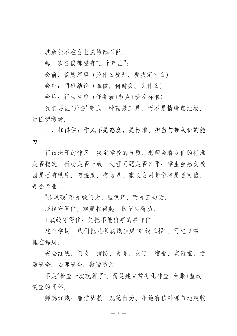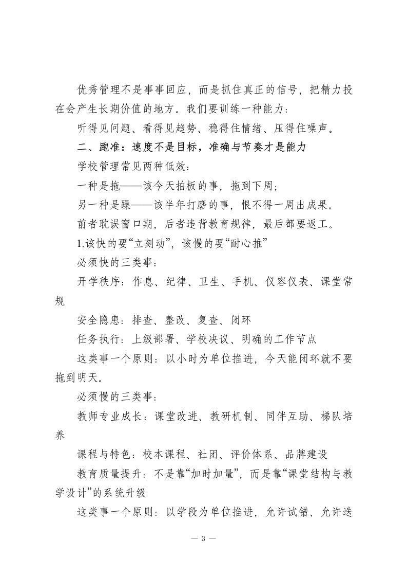 2026春季新学期第一次行政班子会,校长讲话:用格局破局,以效率提速,靠质量立校各位行政同仁,上午好!新学期的第一场行政班子会,不是“把人叫齐”的例会,而是一场“把心叫回来的”对齐会:把节奏对齐、把标准对齐、把责任对齐、把方向对齐。开学像把一艘船推出港口一一风向、航道、速度、纪律,哪一项没对准,后面就会用加倍的力气去补救。学校的管理看起来总是繁杂:一间办公室的整洁、一堂课的状态、一条安全通道的通畅、一个学生的情绪变化…都不像“惊天动地的大事”,但它们决定了学校的底盘是否稳、教育的质量是否真、师生的获得感是否实。我们常说“学校无小事”,不是因为学校爱管闲事,而是因为每一件小事都可能是某个孩子人生的重要变量。今天我想换一种讲法:我们行政团队这个学期要把学校带到更好的方向,关键不在于“做更多”,而在于“做对、做稳、做成”。我用三个关键词来概括一“看远、跑准、扛得住”。每个关键词背后,都有一套可以落地的管理动作。一、看远:不仅看见工作,更要看见方向与系统行政干部最怕的不是忙,而是“忙而不知所忙”。表面上事情都在推进,实际上力气用在了不同方向,最终学校只剩疲惫,1