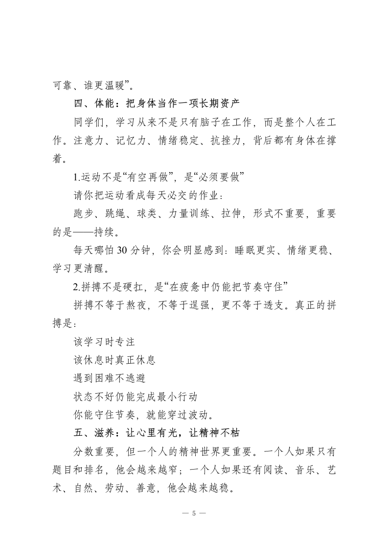 2026春学期开学典礼,校长致辞:三守三求赴新程,不负春光不负己!(1)老师们、同学们:上午好!如果把一个学期比作一段旅程,那么开学这一天,就是我们重新整装、校准方向、检查行囊的时刻。有人带着兴奋,有人带着紧张,有人还没从假期的节奏里完全回来一一这些都很正常。重要的是,从此刻起,我们要把自己重新交还给“成长”这件事:把时间交还给学习,把注意力交还给当下,把身体交还给运动,把品格交还给自律,把好奇心交还给探索。今天我不讲宏大口号,也不堆热血鸡汤。我想给大家一份“开学使用说明书”:六个关键词,像六颗按钮,按下去,日常就会发生变化;坚持下去,一个学期就会被重新拉开差距。它们分别是一定向、专注、边界、体能、滋养、探索。一、定向:把“想要”变成“可做到”很多同学并不缺目标,缺的是把目标变成路线图的能力。目标如果只是挂在心里,它只会在情绪好时发光;只有把它写进日程、拆进任务、落进行动,它才会真正推动你往前走。1.先做一件事:给自己一个“北极星”别急着列十个愿望,先选一个最重要的:本学期最想突破的学科是什么?最想提升的能力是什么?(表达、写作、计算、阅读、专1