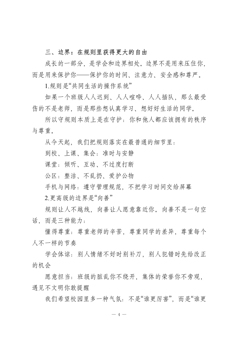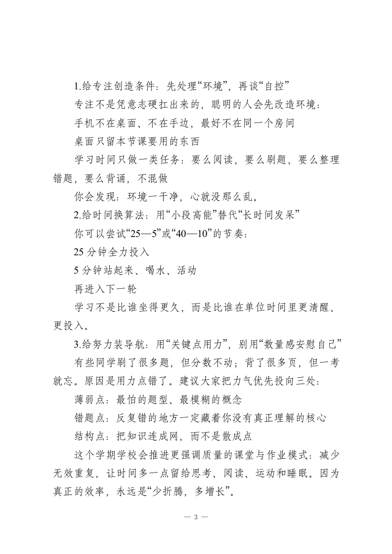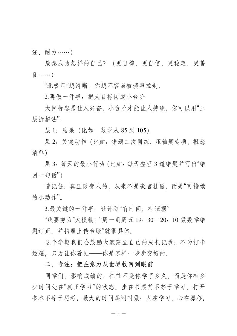 2026春学期开学典礼,校长致辞:三守三求赴新程,不负春光不负己!老师们、同学们:上午好!如果把一个学期比作一段旅程,那么开学这一天,就是我们重新整装、校准方向、检查行囊的时刻。有人带着兴奋,有人带着紧张,有人还没从假期的节奏里完全回来一一这些都很正常。重要的是,从此刻起,我们要把自己重新交还给“成长”这件事:把时间交还给学习,把注意力交还给当下,把身体交还给运动,把品格交还给自律,把好奇心交还给探索。今天我不讲宏大口号,也不堆热血鸡汤。我想给大家一份“开学使用说明书”:六个关键词,像六颗按钮,按下去,日常就会发生变化;坚持下去,一个学期就会被重新拉开差距。它们分别是一定向、专注、边界、体能、滋养、探索。一、定向:把“想要”变成“可做到”很多同学并不缺目标,缺的是把目标变成路线图的能力。目标如果只是挂在心里,它只会在情绪好时发光;只有把它写进日程、拆进任务、落进行动,它才会真正推动你往前走。1.先做一件事:给自己一个“北极星”别急着列十个愿望,先选一个最重要的:本学期最想突破的学科是什么?最想提升的能力是什么?(表达、写作、计算、阅读、专一1
