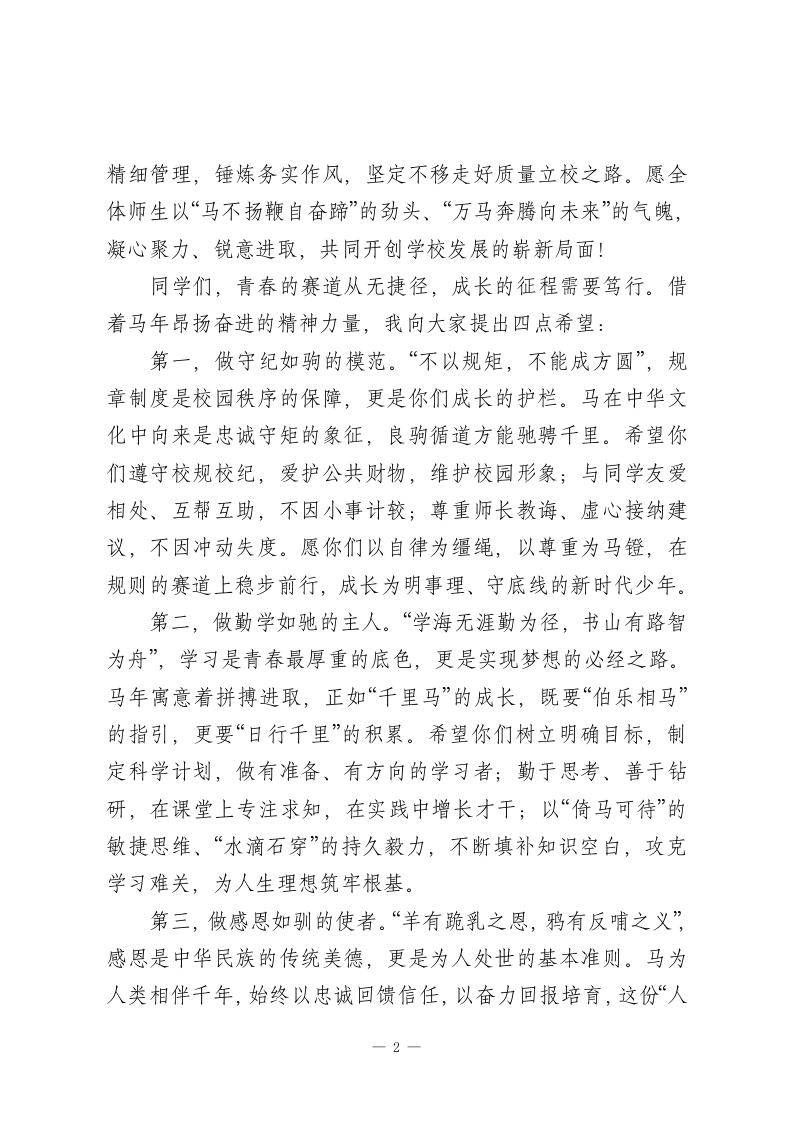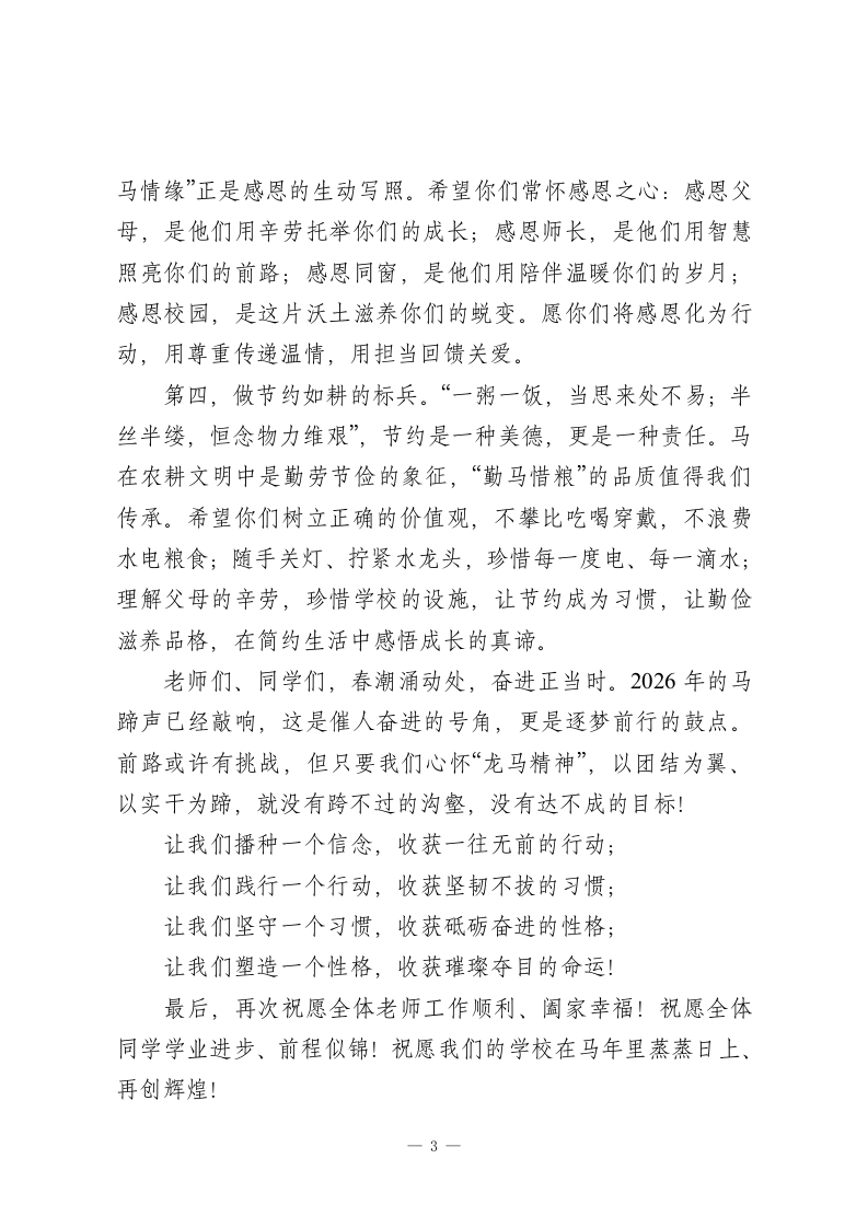 2026马年春季学期开学典礼,校长精彩发言:马年新学期,加油向未来尊敬的老师们、亲爱的同学们:大家早上好!骏马蹄疾踏春归,春风送暖启新程。在这万物复苏、生机盎然的美好时节,我们告别了平安祥和的寒假,怀揣着对新年的期许、对成长的渴望,重返熟悉的校园,共同开启2026丙午马年的新学期篇章。在此,我谨代表学校,向全体师生致以最亲切的问候和最诚挚的祝福!祝老师们工作顺遂、桃李芬芳,如良驹献力般耕耘不辍;祝同学们学业精进、健康成长,似骏马驰聘般不负韶华!回望过去一年,是学校高质量发展的关键之年,更是全体师生同心筑梦、硕果盈枝的奋进之年。教学改革持续深化,分层教学落地见效,课堂效率稳步提升;基础设施日趋完善,校容校貌焕然一新,育人环境更加优美;一批优秀师生在省市县各类评比中崭露头角、载誉而归,用实力书写了学校的荣光。这些成绩的取得,离不开老师们“俯首甘为孺子牛”的坚守与“不用扬鞭自奋蹄”的自觉,离不开同学们“书山有路勤为径”的执着与“少年自有凌云志”的豪情。你们辛苦了!春启新程,势不可挡;马年逐梦,未来可期。“一年之计在于春,一生之计在于勤”,新的学期,学校将继续以立德树人为根本,聚焦教育、教学、教研三大核心,深化教学改革,强化1