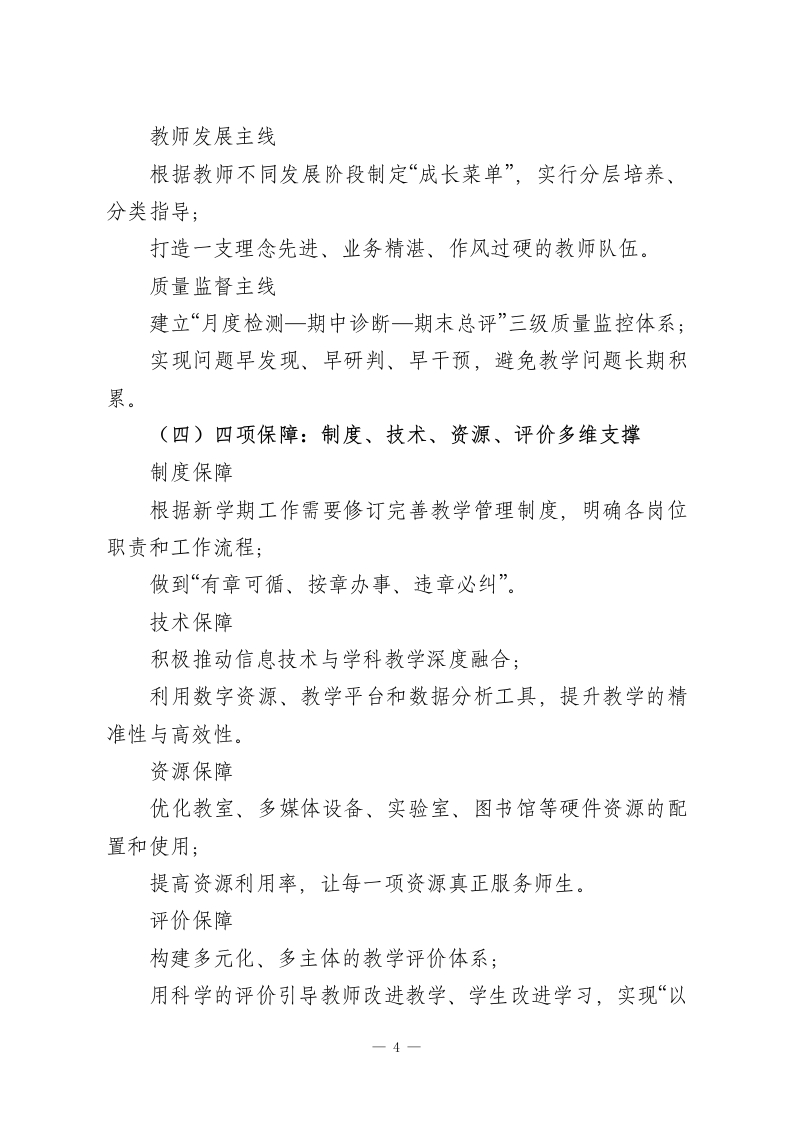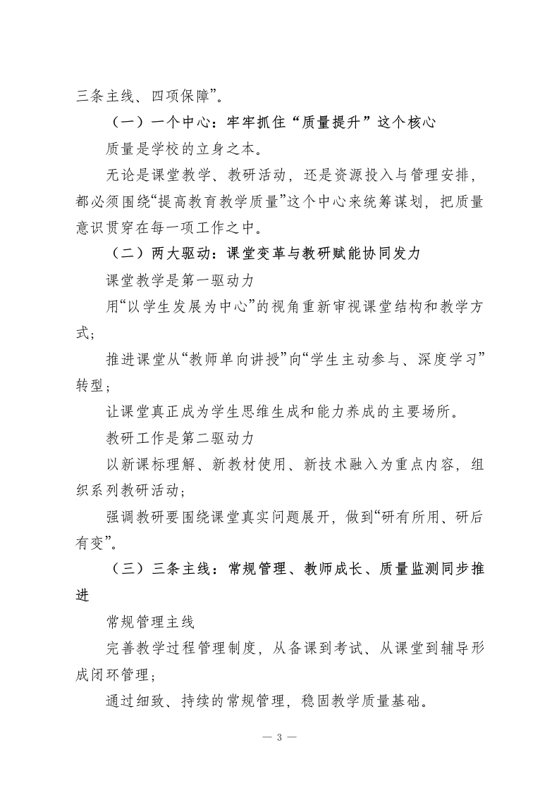2026年春季学期学校教学工作计划:一个中心、两大驱动、三条主线、四项保障!一、指导思想本学期,学校教学工作将继续以党的教育方针为根本遵循,全面落实立德树人这一根本任务,以新课程标准为主要依据,牢牢把握课堂这一育人的主阵地,把提升教学质量视为学校发展的生命线。在具体工作导向上,将坚持“三个要”的基本思路:向课堂要效率一把每一节课上实、上细、上出成效;向教研要深度—通过集体智慧破解教学难题;向管理要质量一用科学规范的管理保驾护航。在此基础上,持续推进教学改革,完善教学管理机制,激发教师工作活力,促进学生德智体美劳全面发展,稳步提升学校整体教学水平。二、工作总目标新学期的教学工作,将紧紧围绕“规范、高效、创新、突破”四个关键词安排和推进,确保有看得见的变化和实实在在的成效。(一)教学常规更加规范对备课、上课、作业批改、课后辅导、考试评价等环节细化标准;实现“事事有依据、人人有要求、过程有检查、结果有反馈”,确保教学常规流程顺畅、执行到位,不留管理盲区。1