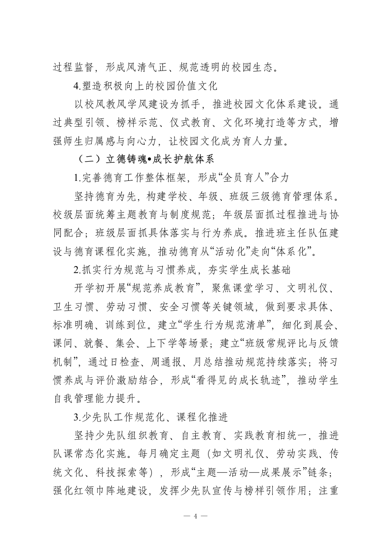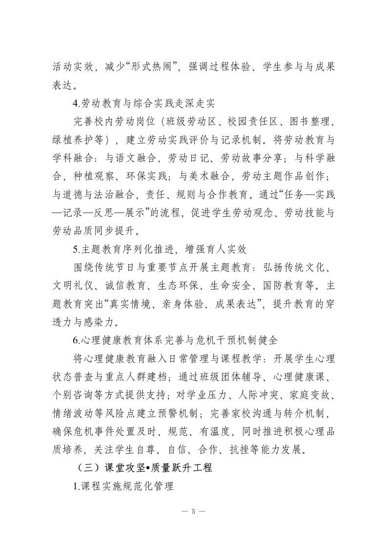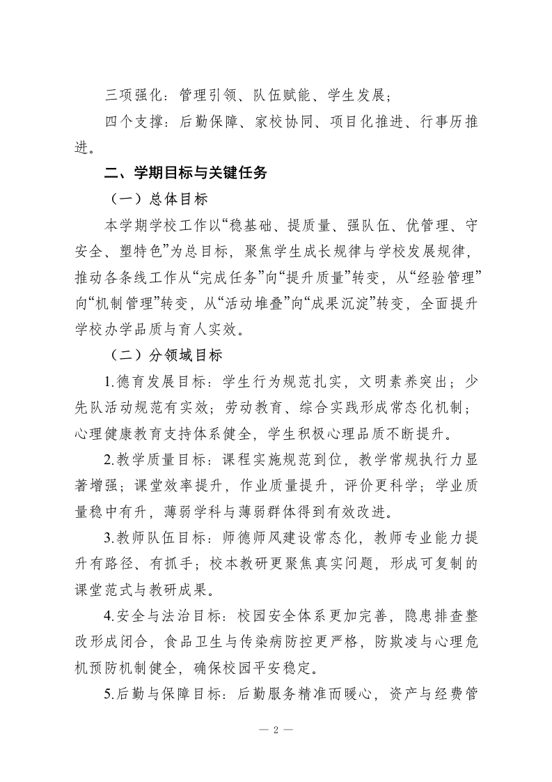 2026年春季学校全面工作计划:骏马踏春启新篇奋蹄致远育未来一、指导思想与总体要求2026年春季学期,学校坚持以立德树人为根本任务,全面贯彻党和国家的教育方针,落实课程方案和新课程标准要求,紧扣新时代教育质量发展导向,统筹推进教学、德育、教师队伍、后勤保障、家校协同与校园文化建设。坚持以学生全面发展为中心,以课堂教学提质为关键,以规范化、精细化管理为保障,以数字化赋能与资源整合为支撑,持续完善学校管理、育人和质量提升体系,努力实现“管理规范、课堂高效、德育扎实、队伍专业、校园安全、特色鲜明”的学期发展目标。总体原则是:坚持政治引领、价值引领与质量引领相统一;坚持目标管理、过程管理与结果评价相衔接;坚持全员育人、全程育人、全方位育人;坚持守住安全底线,提升服务保障水平,凝聚家校共育合力,推动学校工作提升。总体思路是:坚持“一个中心、两条主线、三项强化、四个支撑”。一个中心:课堂教学提质增效。以课程实施、教学常规、课堂改进、作业评价、质量监测为主抓手,推动课堂从“教得完”走向“学得会、学得深”;两条主线:立德树人与安全稳定,德育体系、少先队、劳动实践、心理健康贯穿全程。校园安全、食品安全、法治教育、应急演练守牢底线;一1
