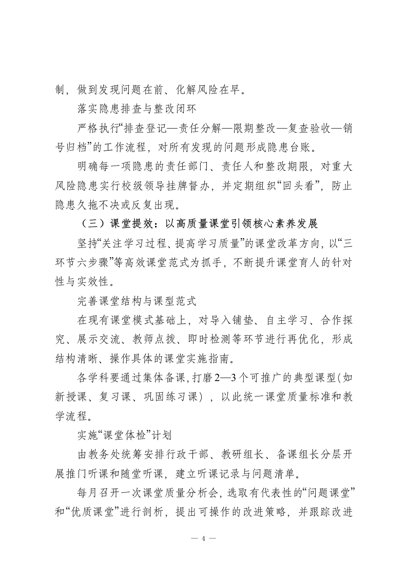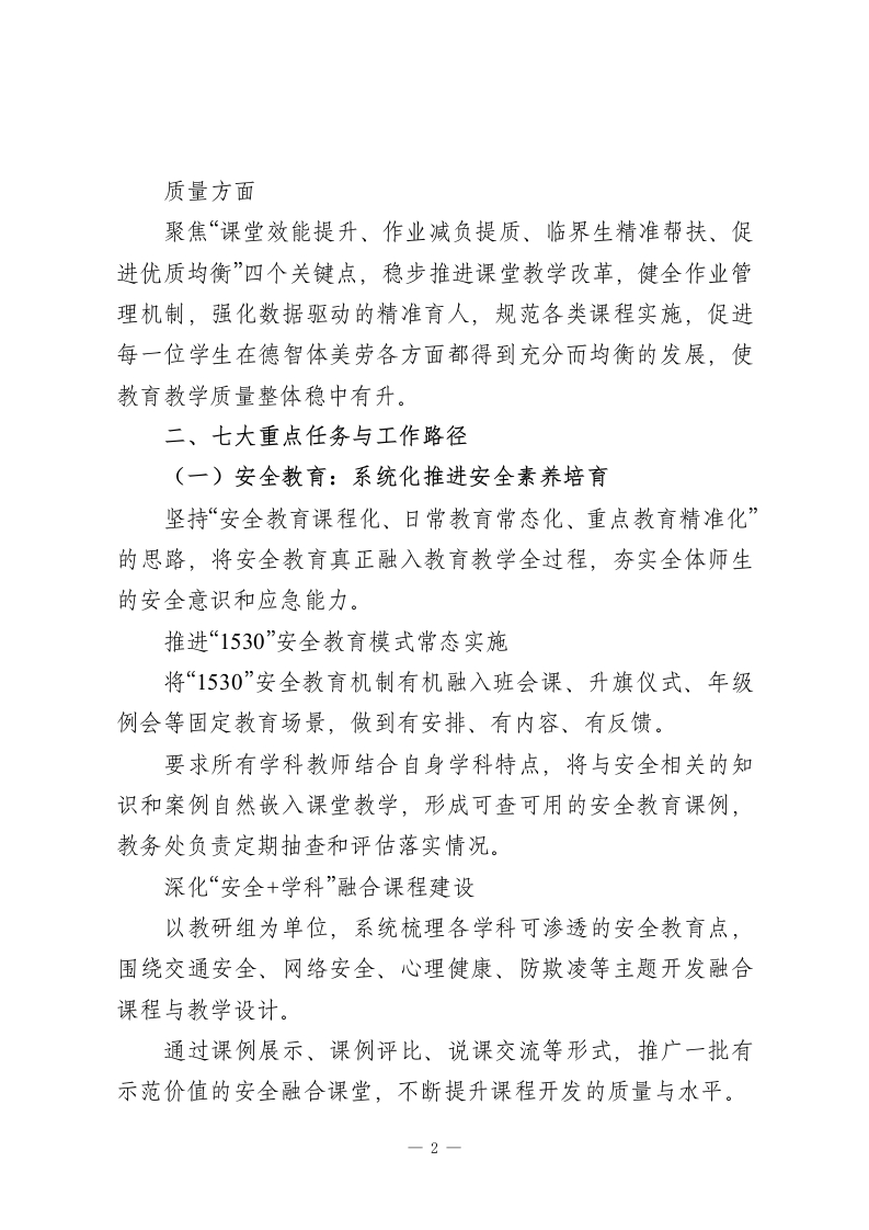 初中新学期发展规划:两个核心、七个重点、三个突破!为全面贯彻党的教育方针,积极响应义务教育优质均衡发展的总体要求,我校在系统梳理上学期成绩与不足的基础上,将“安全”与“质量”作为新学期一切工作的着力点和落脚点。紧扣立德树人这一根本任务,坚持“守住底线、提升质量、做实内涵、推动发展”的基本思路,聚焦问题、推进改革、强化实效,通过有针对性的举措和闭环管理,努力构建安全稳定、质量过硬、内涵丰富的办学新局面,推动学校由外延式发展转向高质量、内涵式发展,不断提升办学品质和育人水平,为区域义务教育高质量发展持续赋能。一、总体工作主线:安全托底,质量引领本学期,学校所有工作都要紧紧围绕“安全护航发展、质量彰显内涵”这一主线展开,将安全管理与教育教学质量提升贯穿到办学活动的各个环节和全过程,做到安全意识常在、质量追求不止。安全方面坚持“全员参与、全过程把关、全方位覆盖”的安全工作原则,建立和完善系统化、标准化、长效化的安全管理体系。通过夯实各层级主体责任、加强隐患排查整治,力争实现校园内零重大安全事故、零责任事件,持续营造平安、和谐、有序的育人环境。一1