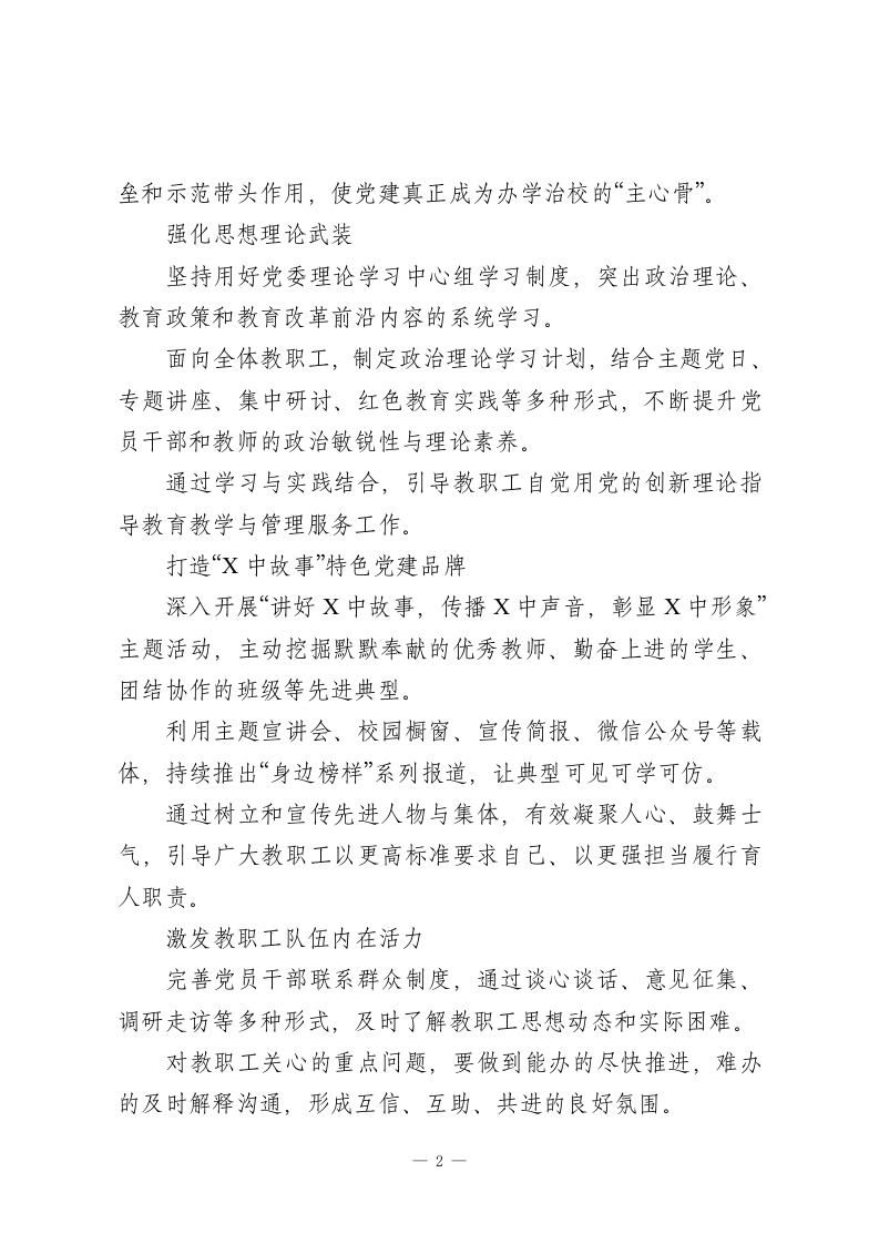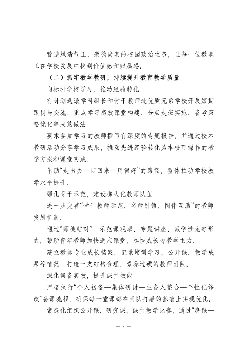 全面又具体!高中新学期重点工作规划(1)一、指导思想与总体目标本学期,学校将全面贯彻党的教育方针,把立德树人作为办学根本任务,紧紧围绕学校当前发展阶段和实际需求,对标高质量发展要求统筹谋划各项工作。在坚持党的全面领导前提下,重点抓好“党建引路、教学提质、管理增效、服务优化”四大板块,整体推进教育教学改革、教师队伍培育、高考备考攻坚、学生全面发展与后勤服务升级。通过聚焦关键问题、突出改革创新、坚持务实担当,努力破解学校发展中的痛点难点,补齐薄弱环节,推动学校发展重心由规模扩张转向内涵建设、由基础提升迈向质量跃升。以此为德智体美劳全面发展的时代新人培养夯实基础,为打造区域优质教育品牌和促进学校教育事业高质量发展提供坚实支撑。二、本学期重点工作任务(一)夯实党建引领,汇聚改革发展合力深化党建与业务工作一体化推进严格执行党建工作责任制,理顺“党政同责、党政协同”的工作机制。将党建工作嵌入教育教学、教研改革、学生管理、高三备考等中心任务,实现部署上同研究、推进上同安排、考核上同评价。引导各党支部在教研组、年级组和处室工作中发挥战斗堡-1
