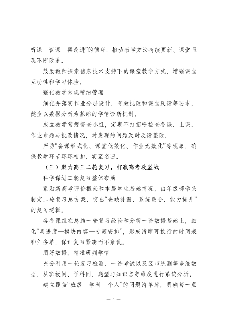 全面又具体!高中新学期重点工作规划一、指导思想与总体目标本学期,学校将全面贯彻党的教育方针,把立德树人作为办学根本任务,紧紧围绕学校当前发展阶段和实际需求,对标高质量发展要求统筹谋划各项工作。在坚持党的全面领导前提下,重点抓好“党建引路、教学提质、管理增效、服务优化”四大板块,整体推进教育教学改革、教师队伍培育、高考备考攻坚、学生全面发展与后勤服务升级。通过聚焦关键问题、突出改革创新、坚持务实担当,努力破解学校发展中的痛点难点,补齐薄弱环节,推动学校发展重心由规模扩张转向内涵建设、由基础提升迈向质量跃升。以此为德智体美劳全面发展的时代新人培养夯实基础,为打造区域优质教育品牌和促进学校教育事业高质量发展提供坚实支撑。二、本学期重点工作任务(一)夯实党建引领,汇聚改革发展合力深化党建与业务工作一体化推进严格执行党建工作责任制,理顺“党政同责、党政协同”的工作机制。将党建工作嵌入教育教学、教研改革、学生管理、高三备考等中心任务,实现部署上同研究、推进上同安排、考核上同评价。引导各党支部在教研组、年级组和处室工作中发挥战斗堡-1