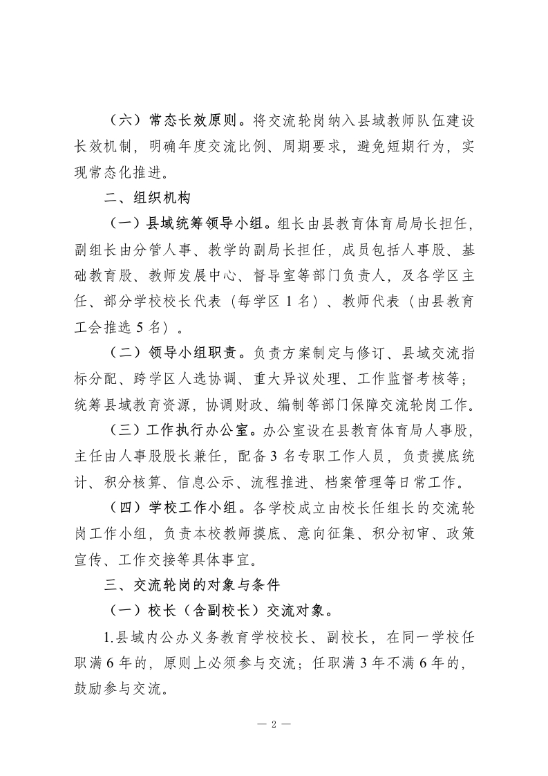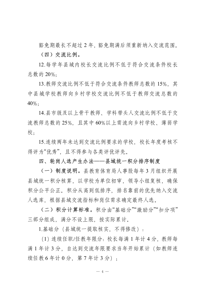 县域义务教育学校校长教师交流轮岗工作实施方案(2026年修订)为深入贯彻《中华人民共和国义务教育法》《关于推进县域义务教育优质均衡发展的意见》等文件精神,破解城乡教育资源失衡难题,优化教师队伍结构,提升县域教育整体质量,结合我县教育实际,特修订本方案。一、工作原则(一)统筹规划原则。由县教育体育局统筹制定县域交流轮岗规划,结合城乡学校布局、学科缺口、师资结构等因素,科学分配交流指标,避免校际自主交流的盲目性。(二)公开公正原则。交流岗位、选拔标准、积分规则、人选结果等全程公开,通过县教育体育局官网、学校公示栏等渠道公示,接受教职工、家长及社会监督,杜绝暗箱操作。(三)积分量化原则。建立县域统一的积分体系,以客观数据为核心,量化教师轮岗资格与优先级,减少人为干预,确保“轮有依据、转有标准”。(四)均衡提质原则。优先向乡村学校、薄弱学校调配骨干教师、紧缺学科教师,推动优质教育资源下沉,促进城乡、校际教育质量均衡提升。(五)以人为本原则。充分考虑教师家庭实际、专业发展需求,合理确定交流形式、期限与去向,保障教师合法权益,激发参与积极性。一1