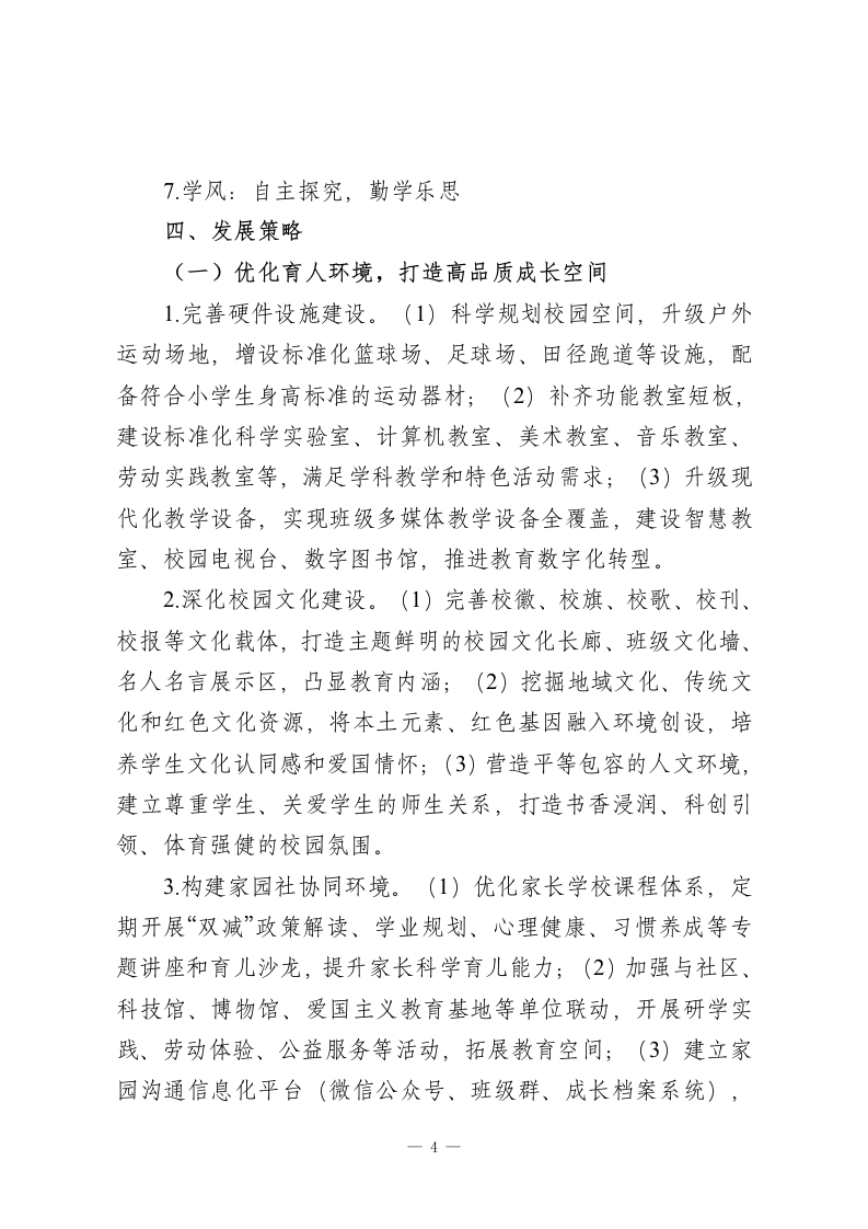 小学“十五五”发展规划(2026-2030)一、指导思想以习近平新时代中国特色社会主义思想为指导,全面贯彻党的教育方针,落实《义务教育课程标准》要求,坚持“五育并举,素养导向,全面发展”的办学理念,遵循小学教育发展规律和学生身心成长特点,依法治校、以德立校、质量强校、特色兴校,聚焦核心素养培育,深化课程教学改革,落实“双减”政策要求,强化家园社协同育人,内强素质、外树形象,努力打造普惠优质、特色鲜明的现代化小学。二、现状分析(一)发展优势1.管理体系日趋完善。实行校长负责制下的分层管理,建立了较为健全的规章制度,班子成员以身作则、分工明确,中层干部履职尽责,教师团队凝聚力强,形成了民主和谐、务实进取的管理氛围,各项工作规范有序推进。2.德育体系初步构建。坚持把立德树人放在首位,遵循小学生品德形成规律,以理想信念教育、习惯养成教育、爱国主义教育为核心,围绕“文明有礼、诚信友善、爱国爱校”等主题开展系列活动,学生良好行为习惯初步养成,积极向上的校风逐步形成。3校园文化底蕴初显。以“书香化、育人化、特色化”为核心,打造了阅读文化、科技文化、体育文化等特色载体,通过校园一1