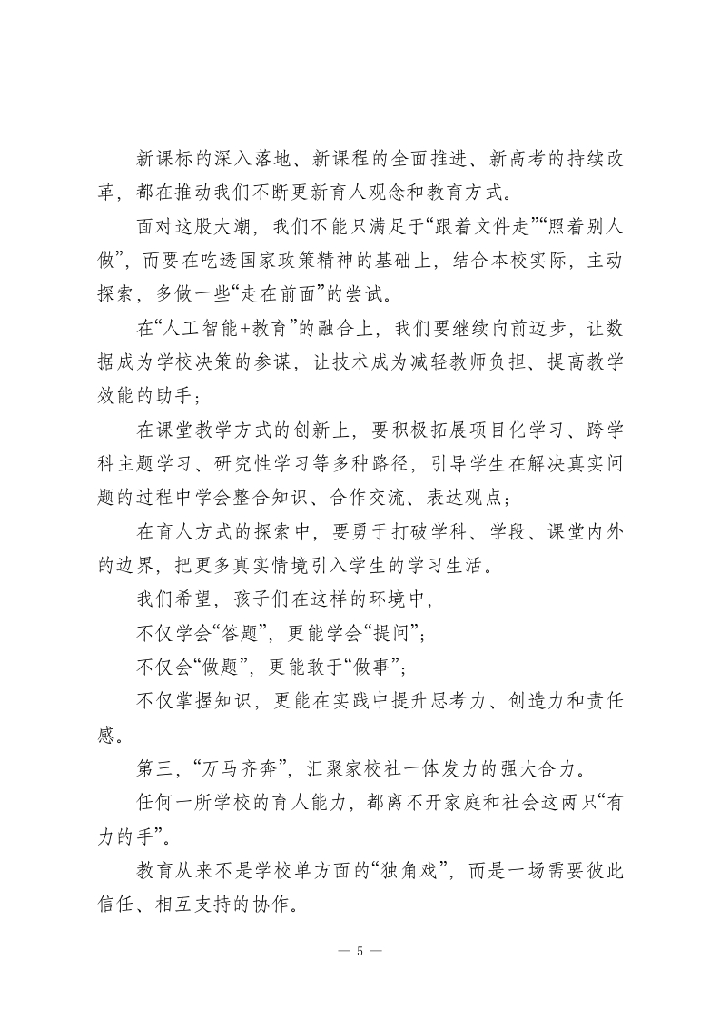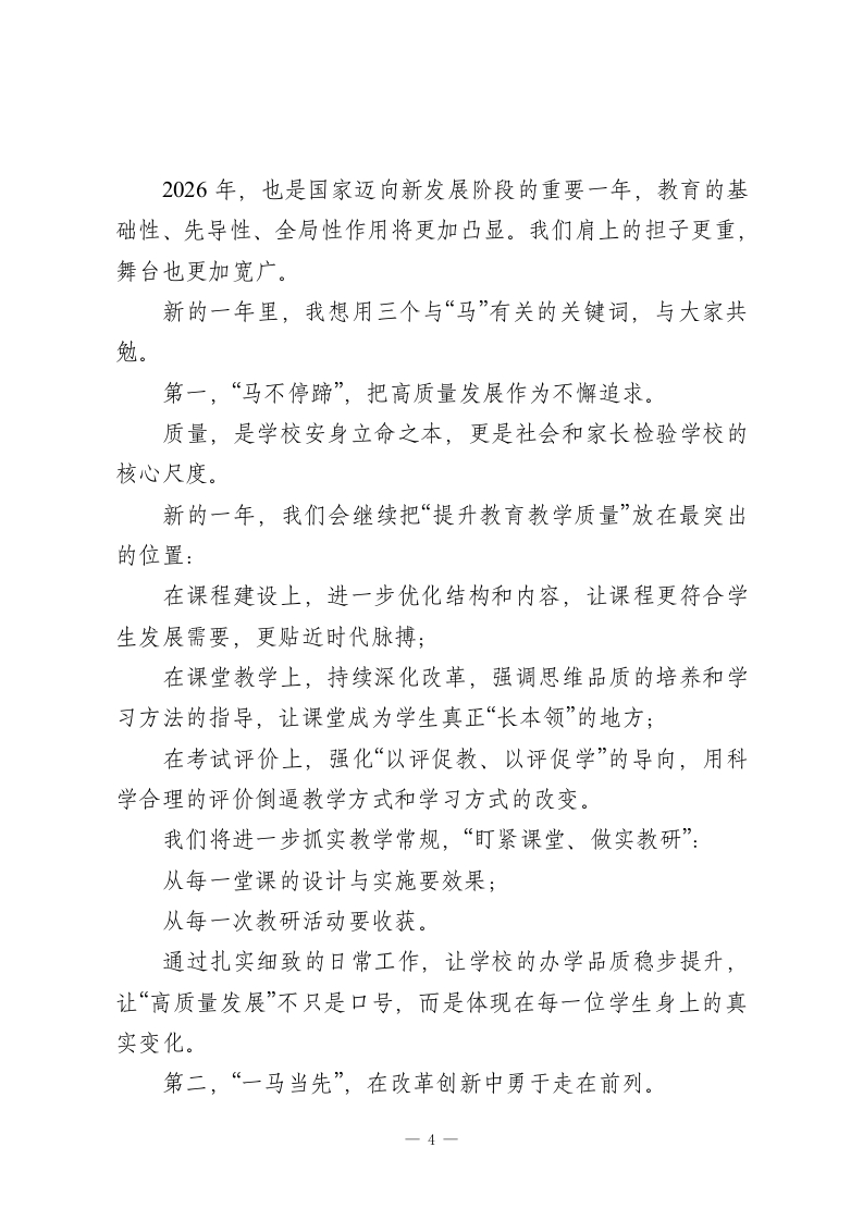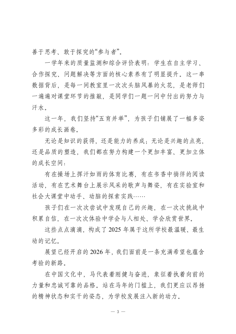 校长2026年新春致辞:以马不停蹄的姿态,锚定高质量发展!尊敬的各位领导、各位家长,亲爱的老师们、同学们,以及长期关注支持学校的社会各界朋友:大家新年好!时序轮替,春意渐近。当乙已蛇年的记忆尚在心头回荡,丙午马年的晨曦已经跃上天际。在这万家团圆、辞旧迎新的美好时刻,我谨代表全校师生员工,向长期以来关心、支持学校发展的各级领导和社会各界同仁,表示由衷的感谢和崇高的敬意!向一年到头兢兢业业的全体教职工和默默付出的家属们致以诚挚的问候!也向朝气蓬勃、努力向上的同学们送上新春的美好祝福!衷心祝愿大家在新的一年里:身心康健,阖家平安;事业顺遂,前程似锦;在马年行稳致远,万事称意!回首刚刚走过的2025年,这对国家而言,是教育强国建设全面提速的一年;对学校而言,是内涵发展、提质增效的一年。这一年,我们始终把“为党育人、为国育才”牢牢记在心里,把教书育人的每一件“小事”当作关系国家未来的大事,在日复一日的忙碌中,交出了一份属于这一代教育人自己的答卷。这一年,我们把“立德树人”这四个字写得更加厚重。1