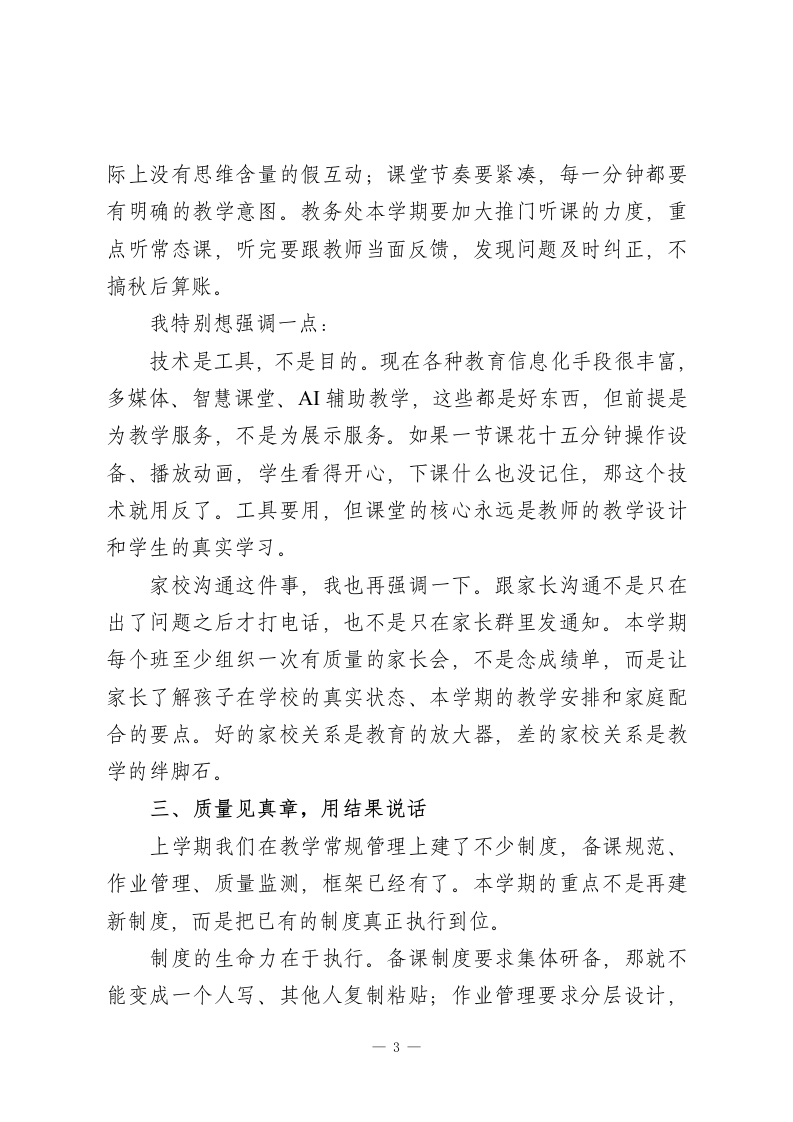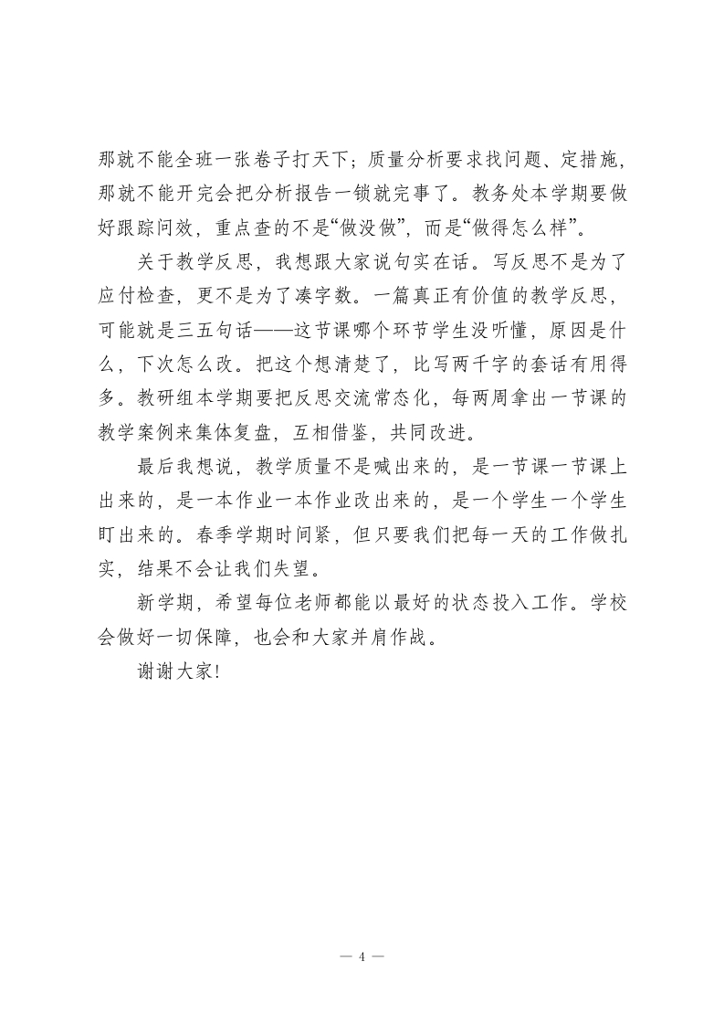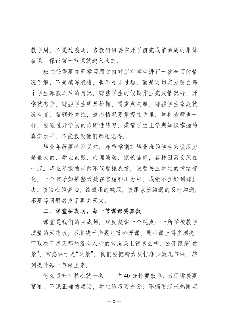 校长在2026年春季新学期教学工作会议上的讲话:开学即开跑,课堂拼真功,质量见真章各位老师,同志们:大家好!寒尽春来,万象更新。今天召开2026年春季学期教学工作会议,既是收心会,又是动员会。会议时间不长,但是我想把几个重要的问题给大家讲清楚。上一学期期未质量检测的数据大家都已经看到了,整体上稳中有进,部分学科、部分年级的成绩有所提高,这是全体教师共同努力的结果。但是我们也要正视存在的问题一一从数据上看,学科之间的发展还不够平衡,有些班级的薄弱学科短板还比较明显,课堂教学的有效性还有待提高。成绩说明方向是对的,问题提醒我们要加快步伐、踏踏实实。春季学期的一个重要特征就是时间短。去掉各种考试、节假日、活动安排之后,真正可以用来上课的时间就很少了。时间紧任务重,不能慢慢来也不能让机器空转。今天我以三句话来和大家讨论本学期教学工作的核心要求,开学即开跑、课堂拼真功、质量见真章。一、开学即开跑,一天都不能等春季学期不能拖延了。寒假之后,学生学习的状态需要一个恢复期,但是我们的教学节奏不能因此变慢。开学第一周是一1
