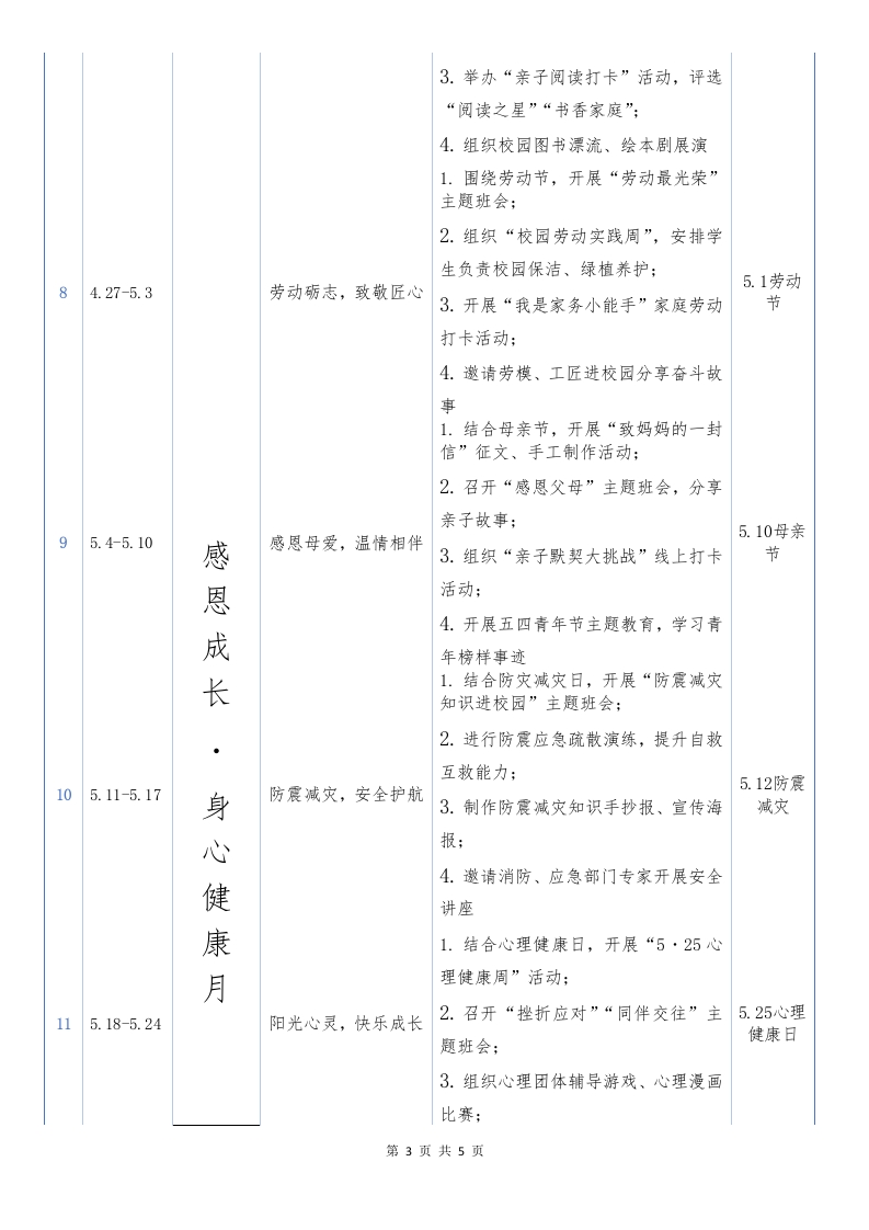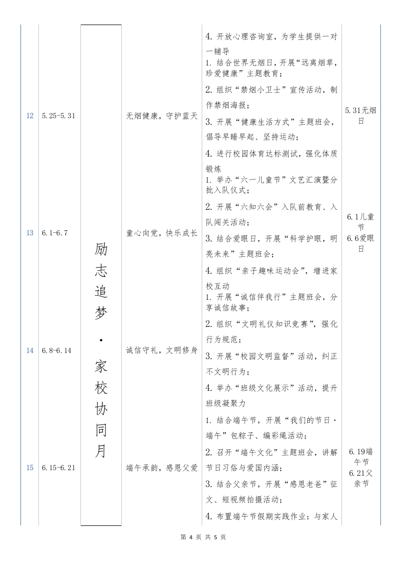 “骏马春风驰正道,万象更新育栋梁”2025-2026年第二学期德育主题教有活动安排表次时间活动及内容备注月主题周主题内容1.学生注册入学,提交寒假德育实践作业(劳动体验、传统文化研学等):2.开展“开学第一课一一安全伴我预行”主题教育,涵盖校园安全、交通备3.2-3.8策马扬鞭启新篇安全、防欺凌教育:上2天周3.召开班主任工作会议,部署新学期春德育重点;4.开展“班级公约共创”活动,强化启行为习惯养成新1.召开“我为家乡添点绿”主题班会,普及植树节知识;程2.组织校园绿植养护行动,各班认领“责任林”:3.12植树13.9-3.15植绿护绿,共绘春景3.开展“环保创意手工”比赛,利用节习废旧材料制作绿植盆栽:4.发布“家庭植树倡议”,鼓励亲子惯共同参与植树活动奠1.开展“二月二·龙抬头”传统文化基主题班会,讲解节日渊源与习俗:2.组织“绘龙鳞·祈祥瑞”手工活动月3.20龙头龙抬头启福,文化传(剪纸、绘画):节23.16-3.22承3.22世界3.开展“文明礼仪我先行”行为规范水日强化周,红领巾监督岗正式上岗:4.进行队列队形训练,为后续比赛做准备节水护水,守护家园1.结合世界水日,开展“节约用水,3.23世界33.23-3.29从点滴做起”主题教育:气象日第1页共5页