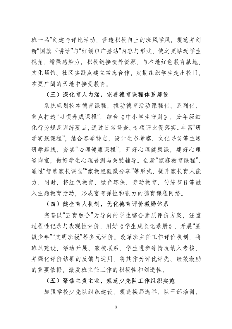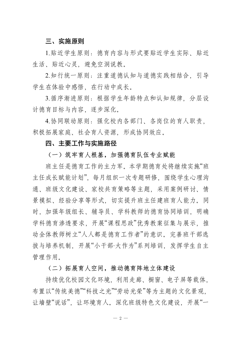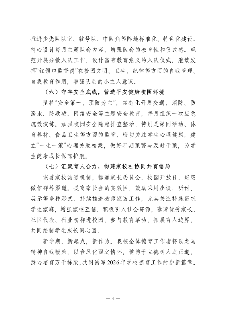 2025-2026年第二学期学校德育工作计划:骏马春风驰正道,万象更新育栋梁一、指导思想风起于青萍之末,浪成于微澜之间。新学期,我校德育工作将乘马年奋进之势,借万象更新之机,继续秉持“德育为先、全面育人”的根本宗旨,坚持以学生成长为中心,以习惯养成为基础,以活动体验为载体,以协同育人为支撑,系统推进德育工作深入开展。我们将着力构建“全员参与、全程渗透、全方位展开”的德育实施体系,注重在细微处育人,于活动中塑魂,努力培养品德端正、身心健康、全面发展的新时代少年。二、工作目标1打造一支理念新、能力强、有温度的德育工作队伍,提升班主任、辅导员及学科教师的育人意识和实操能力。2.构建形式多样、内涵丰富的德育活动体系,增强德育工作的吸引力、感染力和实效性。3健全学校、家庭、社会“三位一体”协同育人机制,形成育人合力,营造良好成长生态。4.完善学生综合素质评价与德育工作考评机制,发挥评价的导向、激励与改进功能。5.扎实推进少先队组织建设与活动规范化,强化少先队员的组织归属感和使命感。6.筑牢校园安全防线,深化心理健康教育,保障学生身心健康成长。