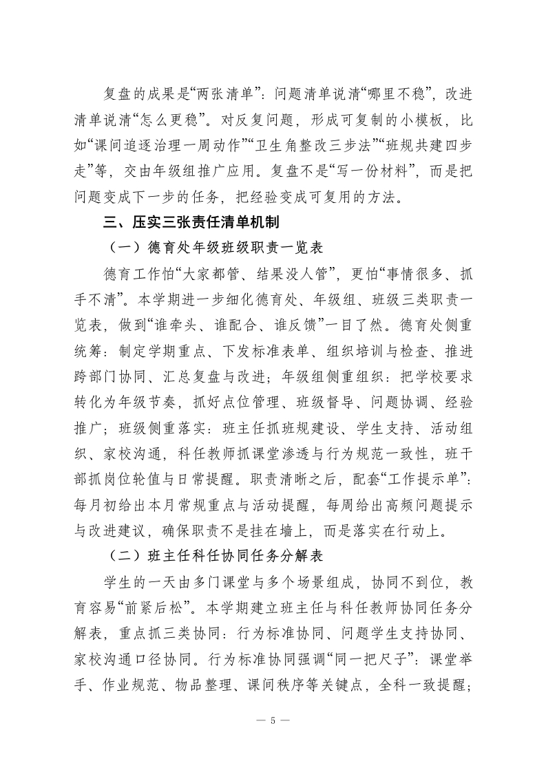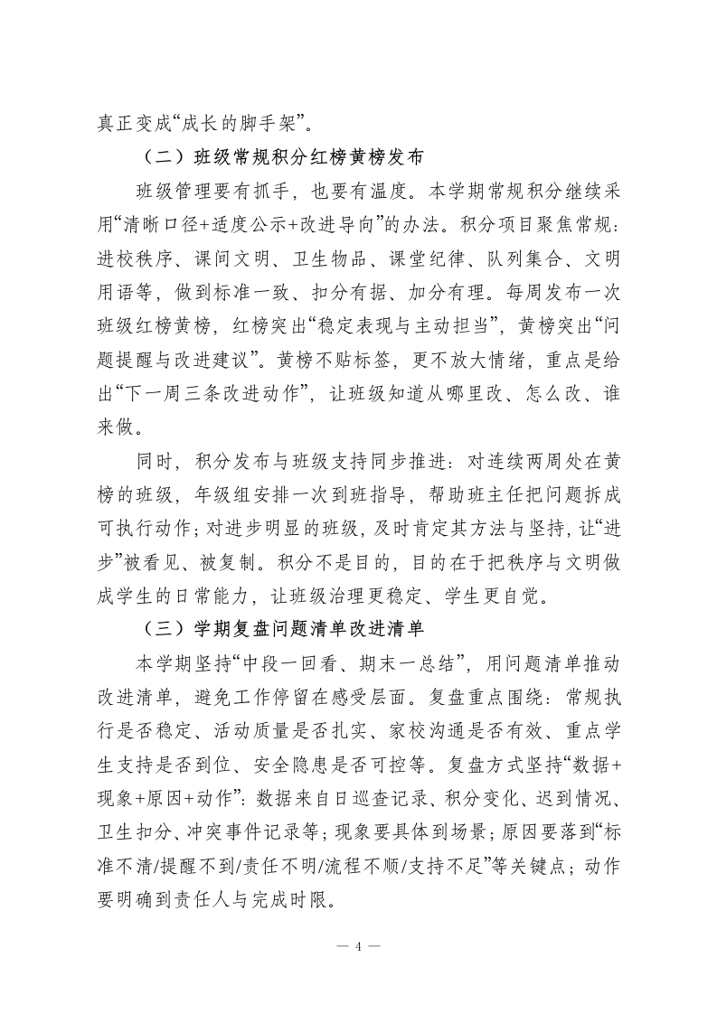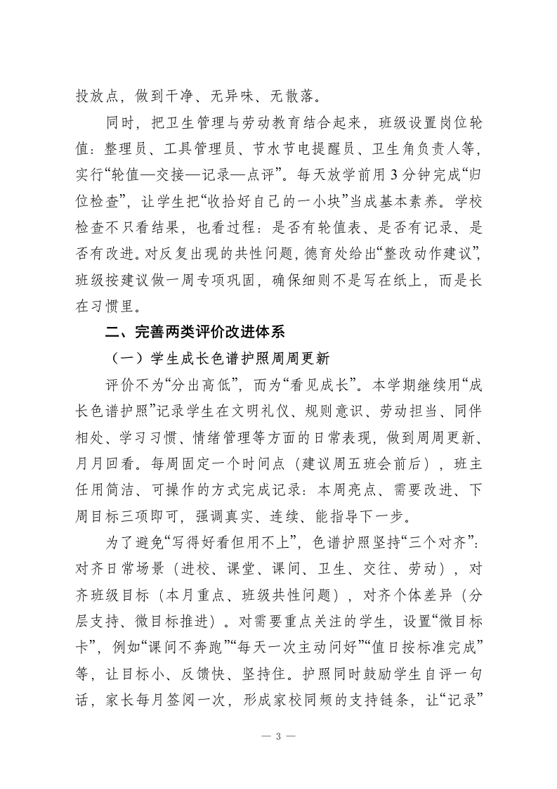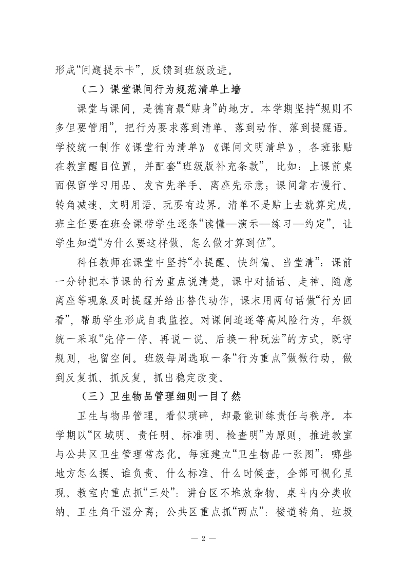 2025一2026学年第二学期德育工作计划一策马扬鞭奋进时,骐骥驰骋谱新篇本学期德育工作坚持把“学生的一天”当作主阵地,把“看得见的变化”当作硬目标,把“可执行、可检查、可复盘”当作基本方法。围绕进校、课堂、课间、卫生、交往、劳动、家校沟通等高频场景,持续推进常规标准化、责任清单化、流程闭环化、活动样板化、评价可视化、保障体系化。通过一周一提醒、一月一主题、阶段性复盘的节奏,让规则更清晰、习惯更稳定、班级更有温度、学生更会自我管理。一、建好一套常规标准体系(一)进校秩序标准图表到班级内进校秩序管得住,学生一天的状态才稳得住。本学期突出“流程前置、标准上墙、提醒到点”,把早到校、雨天拥挤、队列松散等容易反复的问题,做成人人看得懂、班班用得上的“进校标准图表”。学校统一下发“进校三步图”(排队一问好一入班)、“楼梯行走提示图”(靠右一慢行一不抢)、“到班就位流程图”(放包一整理一晨读准备),班主任在开学第一周集中训练,做到先示范、再演练、再固化。同时,落实“点位有人、时段有人、提醒有人”:校门口、楼梯口、走廊转角等设置固定护导点位,采取“教师提醒+学生文明岗协助”的方式,重点抓“追逐、插队、喧哗、逆行”等问题。对早到学生,班级设立“静心到班”规则:先整理、再阅读、后交流,让早晨进班就进入学习节奏。每周由年级组抽查一次队列与到班状态,德育处月度汇总共性问题,1