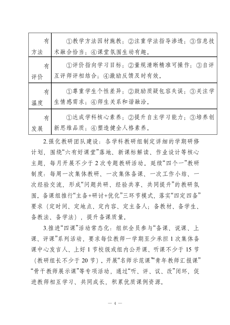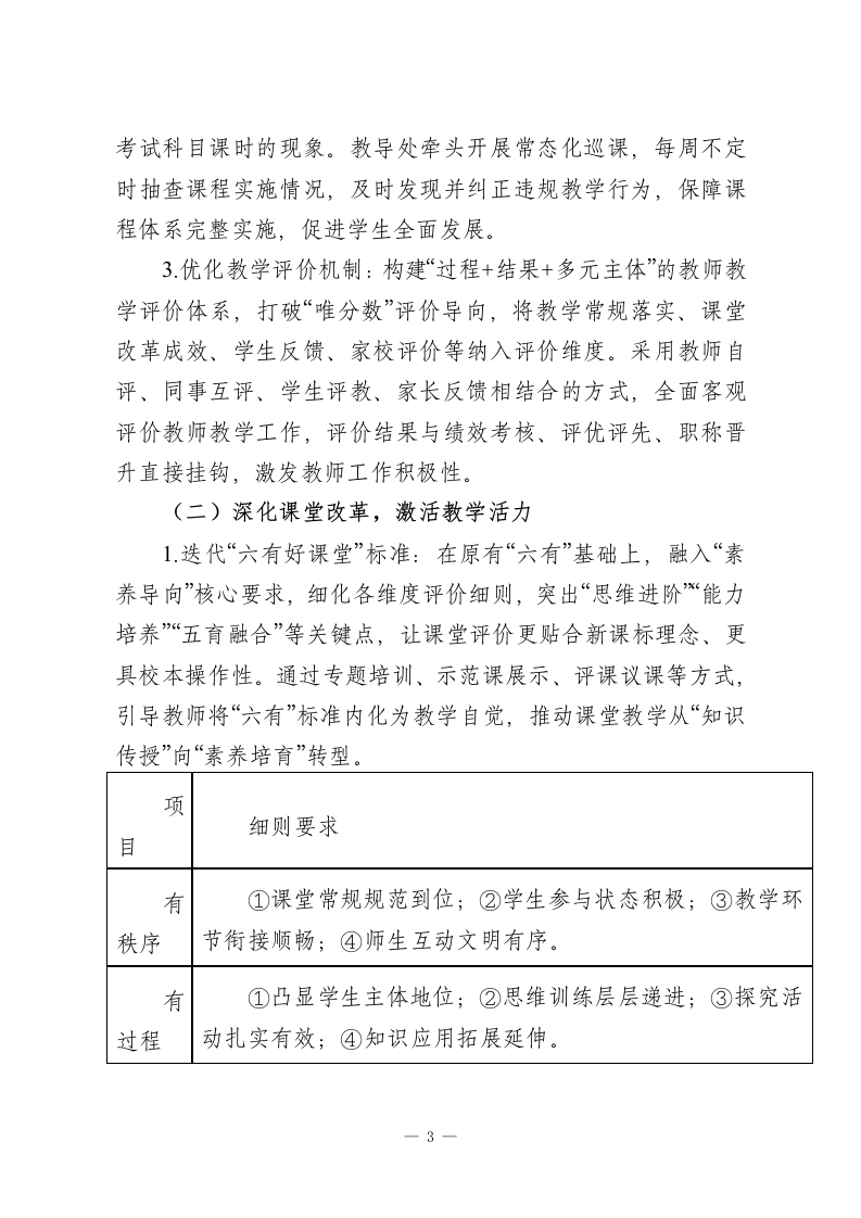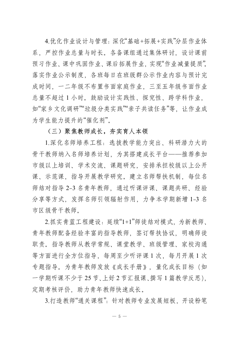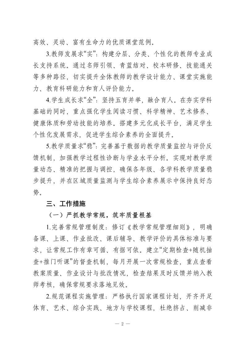2025-2026学年第二学期教导处工作计划:龙骧虎步启新程,精研深耕续华章有梦不觉天涯远,沧笙踏歌再向前。新学期,教导处紧扣新时代教育发展脉搏,以《教育强国建设规划纲要》为根本遵循,全面落实2022版新课标要求,延续“学生中心、素养导向、五育融合”的核心理念,深化“双减”背景下的教学改革,聚焦教学常规、课堂创新、教师成长与学生发展四大维度,精准发力、务实笃行,全力推动学校教育教学质量再上新台阶,为学生终身发展赋能。一、指导思想以习近平新时代中国特色社会主义思想为引领,全面贯彻党的教育方针,锚定立德树人根本任务,以2022版新课标为行动纲领,立足学校办学实际与学生成长规律,深化课堂教学改革,强化教学过程管理,优化课程实施路径,提升教师专业素养,促进学生核心素养全面发展,构建“规范有序、创新高效、五育融合”的教育教学新格局,助力教育现代化高质量发展。二、工作目标1.教学管理求“精”:建立健全覆盖教学全过程、全要素的精细化、制度化、规范化管理体系,实现教学常规检查反馈的常态、精准与高效,确保教学秩序井然,教学行为规范。2.课堂教学求“效”:持续深化以核心素养培育为目标的课堂教学改革,全面实施与优化“六有好课堂”校本标准,显著提高课堂教学的目标达成度、学生参与度和思维发展度,打造一批1