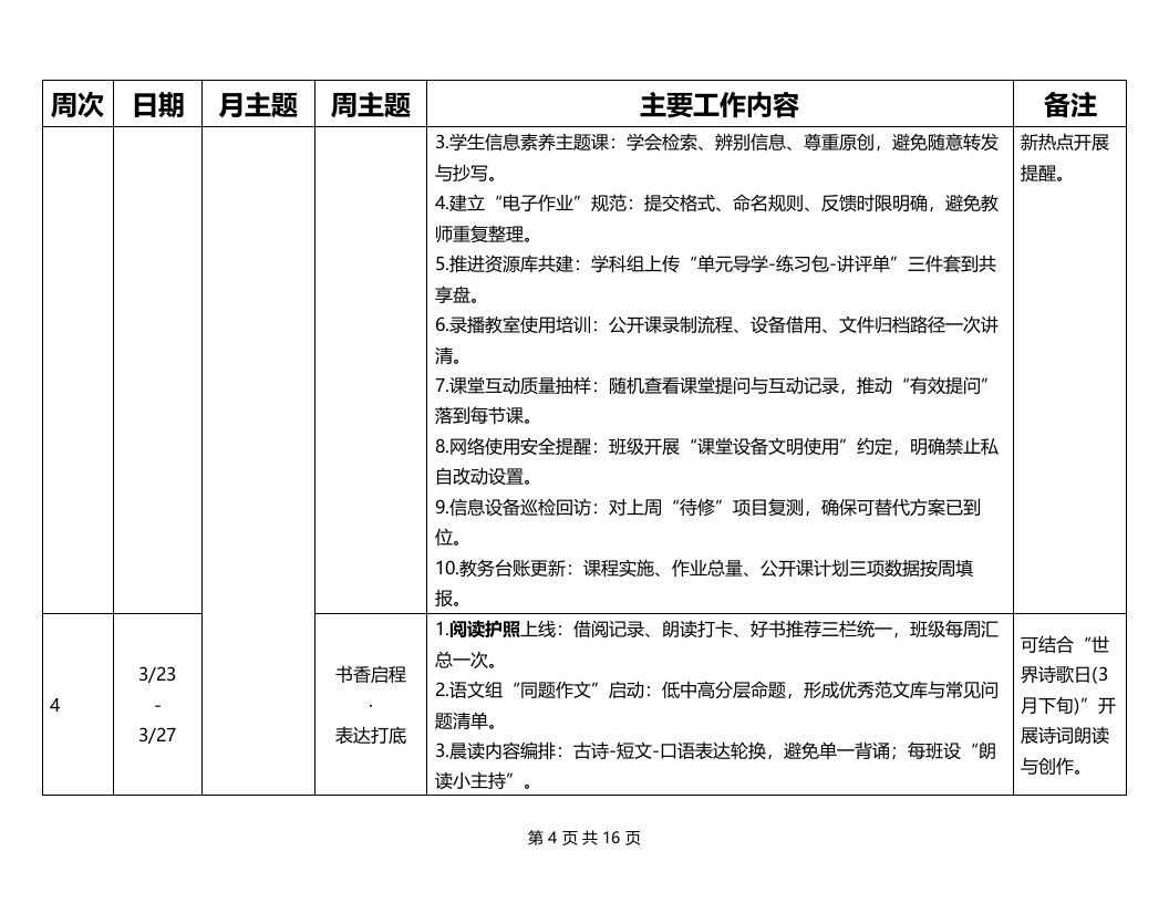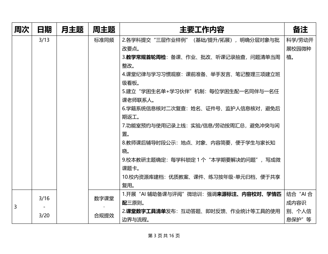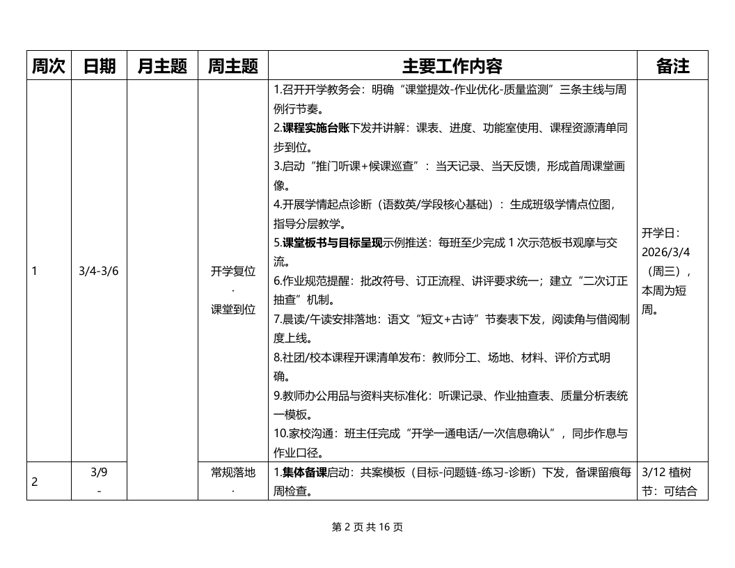 2026年春季学期教导处工作安排表周次日期月主题周主题主要工作内容备注1.课程表与作息表一次性定稿并张贴到班级后墙(含功能室周表、代课表、值周课表)。2教材教辅与学具清点到班、签收留痕;同步发放校本读本/阅读护照。3召开教研组长与备课组长碰头会:确定本学期教研节奏、公开课序列、资料归档口径。4.教学常规清单发布(备课、上课、作业、批改、辅导、检测、资料)与检查节点。5教学设备与平台巡检:智慧黑板/绿播/网络点位逐间测试,形成“可用程三月开局准备开学前两天待修-替代”台账。开学前3/2-3/3教务集中准6学籍与编班核对:转入转出、插班信息当日闭环,班主任确认并签收。规范提质系统到位备。7组织”新课标关键点+课堂提效”微培训:每位教师提交1份“本周就能用”的改进卡。8建立“学期教务日历”:月度检查、阶段检测、家长开放课、社团展示等节点对挤。9.作业管理预案:总量周报口径、分层样例(A/B/C)、错题整理要求统一。10功能室安全与器材点验:实验、信息、劳动、体育器材逐项清点,补充与借用流程明确。第1页共16页