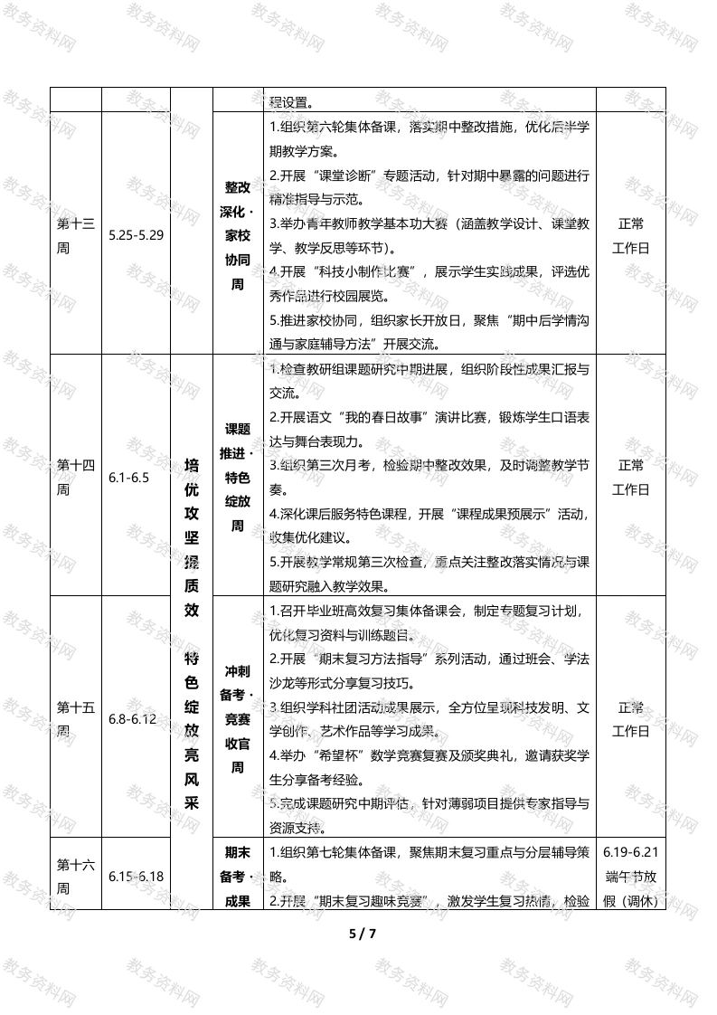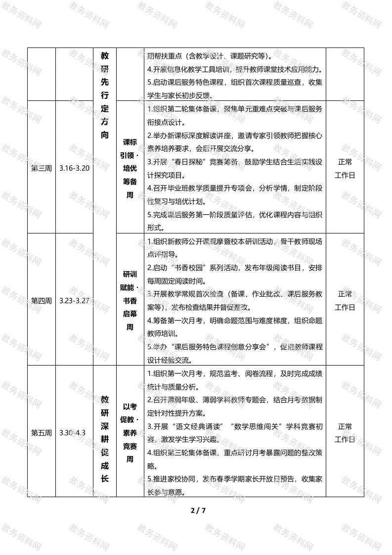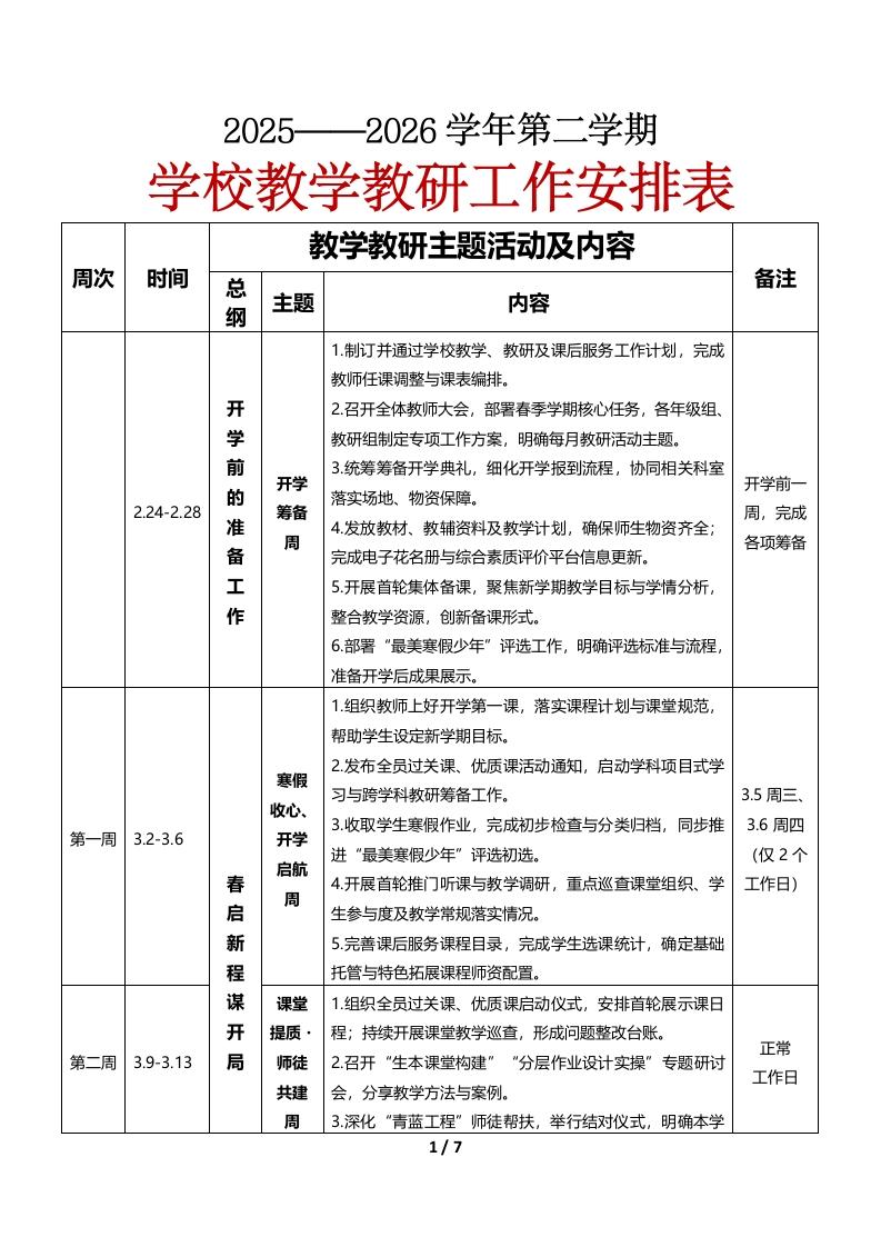2025—2026学年第二学期学校教学教研工作安排表教学教研主题活动及内容周次时间总备注主题内容1.制订并通过学校教学、教研及课后服务工作计划,完成教师任课调整与课表编排。开2召开全体教师大会,部署春季学期核心任务,各年级组、学前教研组制定专项工作方案,明确每月教研活动主题。3.统筹筹备开学典礼,细化开学报到流程,协同相关科室开学开学前一落实场地、物资保障。2.24-2.28准筹备周,完成4.发放教材、教辅资料及教学计划,确保师生物资齐全;备周各项筹备完成电子花名册与综合素质评价平台信息更新。5.开展首轮集体备课,聚焦新学期教学目标与学情分析,作整合教学资源,创新备课形式。6部署“最美寒假少年”评选工作,明确评选标准与流程,准备开学后成果展示。1.组织教师上好开学第一课,落实课程计划与课堂规范,帮助学生设定新学期目标。2发布全员过关课、优质课活动通知,启动学科项目式学寒假习与跨学科教研筹备工作。3.5周三、收心3.收取学生寒假作业,完成初步检查与分类归档,同步推3.6周四第一周3.2-3.6开学进“最美寒假少年”评选初选。(仅2个启航春4.开展首轮推门听课与教学调研,重点巡查课堂组织、学工作日)周启生参与度及教学常规落实情况。新5.完善课后服务课程目录,完成学生选课统计,确定基础程托管与特色拓展课程师资配置。课堂1组织全员过关课、优质课启动仪式,安排首轮展示课日开提质·程;持续开展课堂教学巡查,形成问题整改台账。第二周3.9-3.13局正常师徒2召开“生本课堂构建”“分层作业设计实操”专题研讨工作日共建会,分享教学方法与案例。周3深化“青蓝工程”师徒帮扶,举行结对仪式,明确本学1/7