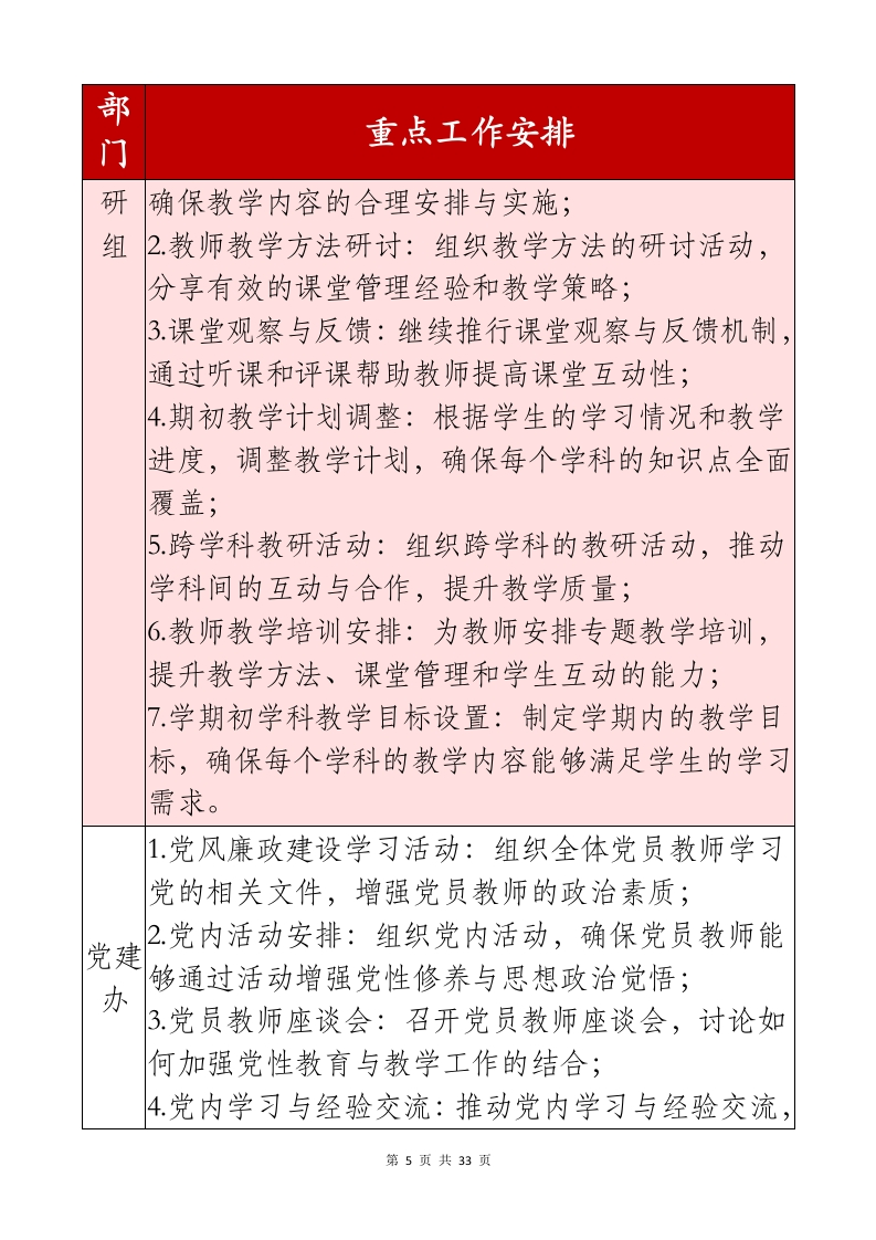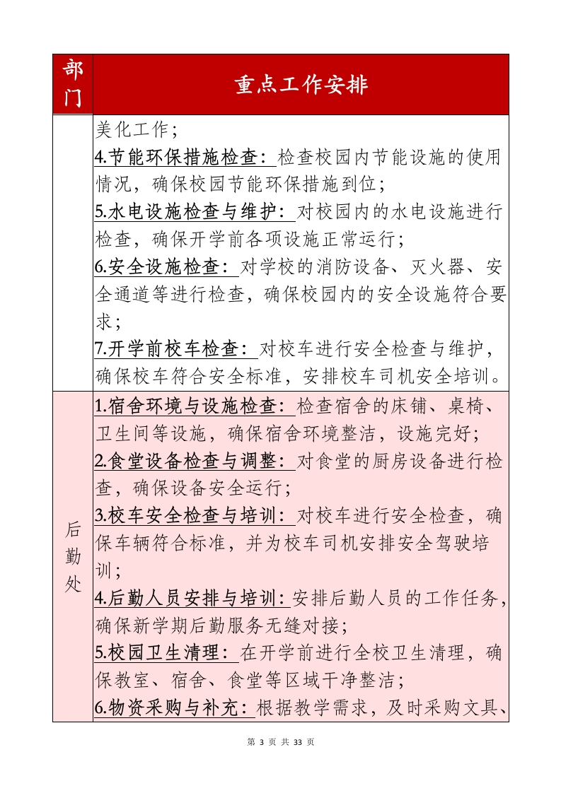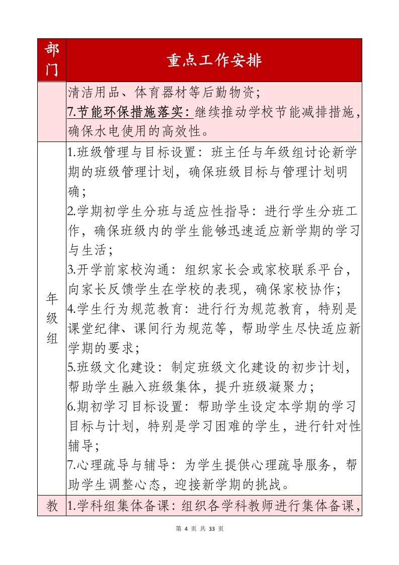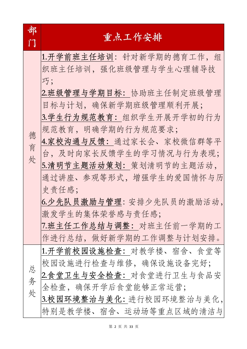 2026年春季学校全面工作安排表(按照月份整理2026.3月-2026.7月)(教导处+德育处+总务+安全+年级组+教研组+D建+工会)月主题:蓄势待发,迎接新学期部门重点工作安排1.开学初教学准备:组织教师备课,准备教学资料与教材,确保新学期教学活动顺利启动;2开学前教师培训:组织教师培训,特别是新教材使用、教学方法创新及课堂管理等方面的内容;3.学期教学目标设置:明确每学科本学期的教学目标与重点,确保教学进度合理安排;教保导4教学计划审核:审核各学科的教学计划,确处内容的合理性与可行性;5.教学设施检查:确保教学楼、实验室等设施设备完好,特别是多媒体教学设备的正常运行;6期初学生测评与分班:进行学生的期初评估,确保班级分配与学生能力匹配;7开学典礼准备:协助组织开学典礼,确保活动的顺利进行,安排主持人、流程、学生代表等。第1页共33页