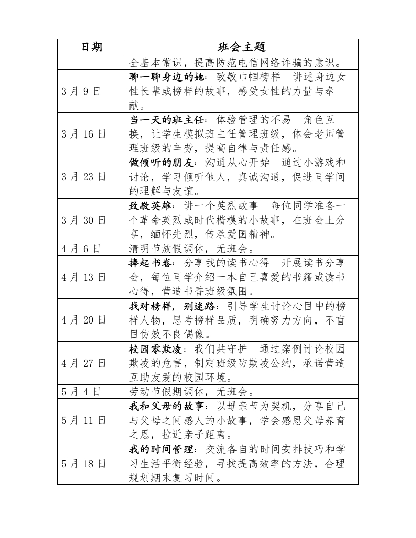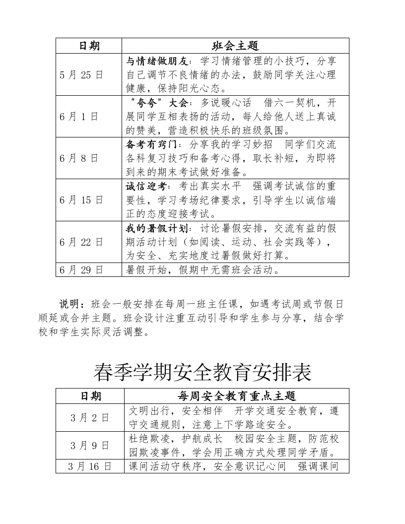 2026年春季主题升旗仪式安排表(附,黑板报安排表、班会安排表、安全教育安排表)日期(周一)升旗仪式主题备注3月9日花开三月别样红,巾帼逐梦绽芳华3月16日播种绿色满园春,生态文明润校园3月23日节水惜水润万物,爱水护水利千秋3月30日清明追思先烈魂,薪火相传勇担当4月13日书香盈袖启智识,读书筑梦育英才4月20日砥砺奋进备期中,勤学苦练创佳绩4月27日劳动筑梦谱华章,汗水浇灌新希望5月11日孝亲感恩传美德,寸草春晖报深情5月18日环保节能齐行动,绿色生活惠万家5月25日心若向阳无惧伤,阳光心态伴成长6月1日童心追梦天地阔,快乐成长谱新篇6月8日刻苦钻研迎期末,沉着应考争佳绩6月15日粽叶飘香传千载,爱国诗魂永流芳6月22日暑期安全记心间,健康快乐每一天说明:升旗仪式每周一早晨举行。如遇法定节假日或调休顺延,当周升旗仪式暂停一次。