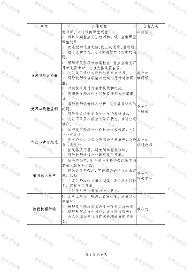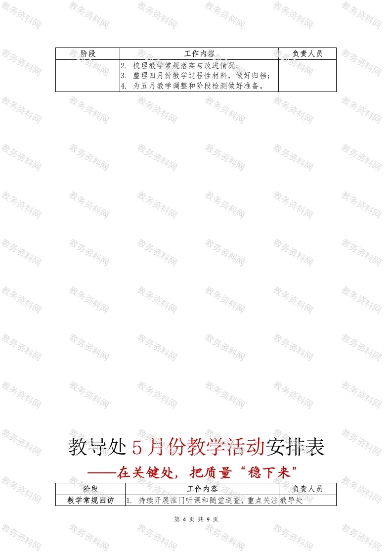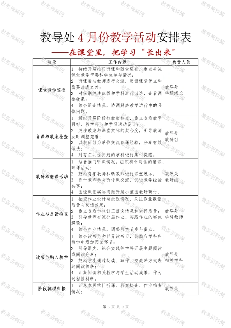 教导处3月份教学活动安排表在细节处,把秩序“立起来”阶段工作内容负责人员1.完成学校教学、教研等相关安排,统筹新学期教学运行:2.调整并公布教师任课安排与课程表,确保课堂教学正常开展:开学准备教导处3.召开教师会议,布置学期教学工作,各年级组各学科同步完善教学计划:教研组长4.核对学生花名册及班级信息,做好基础数据统计:5.组织开展本学期第一次集体备课活动。1.安排教师检查并反馈寒假作业完成情况:2.配合学校整体安排,落实“开学第一课”相关教学任务:教学起步3.关注课堂教学秩序,开展随堂巡查与课堂观教导处察;年级组长4.下发本学期听评课、课堂展示等活动安排;5.召开教学工作交流会,明确阶段性教学要求。1.组织推门听课,了解各学科课堂教学实际情况;2.各学科组结合课堂实践开展课例研讨:课堂调研3.召开相关年级教师会议,交流教学进度与学情教导处情况:教研组4.围绕课堂教学开展校本培训或经验交流:5.开展阶段性教学常规检查,重点查看备课与课堂落实情况。1.组织第二轮集体备课,聚焦教学重难点和课堂问题;教研推进2.安排骨干教师听评青年教师课堂,促进教学教导处流:骨干教师3.开展课堂教学工具或平台应用交流活动:4.结合课堂实际,交流作业设计与讲评经验。1.启动教师结对帮扶活动,明确帮扶要求与推进方式:2.抽查作业设计与批改情况,组织交流改进做教师发展法:教导处3.召开部分年级教学情况交流会,研讨教学改进教研组措施;4.结合学科特点,组织开展学生学科活动或实践第1页共9页