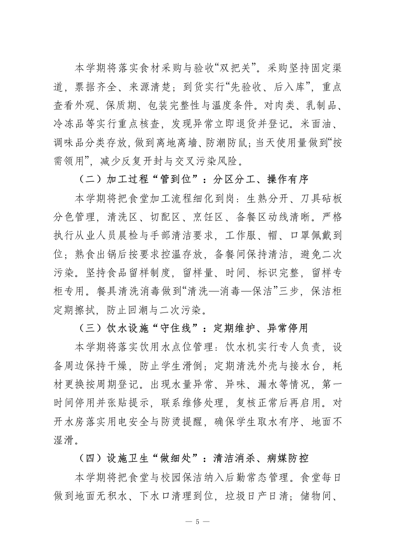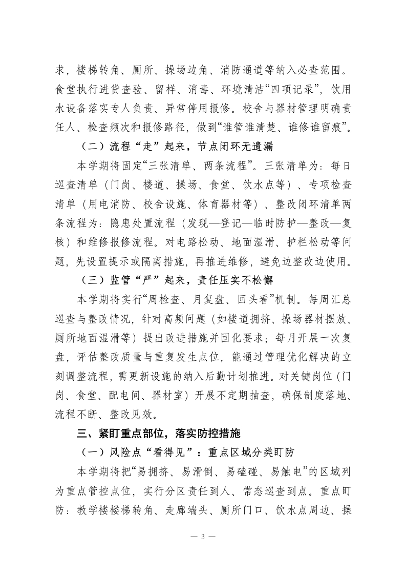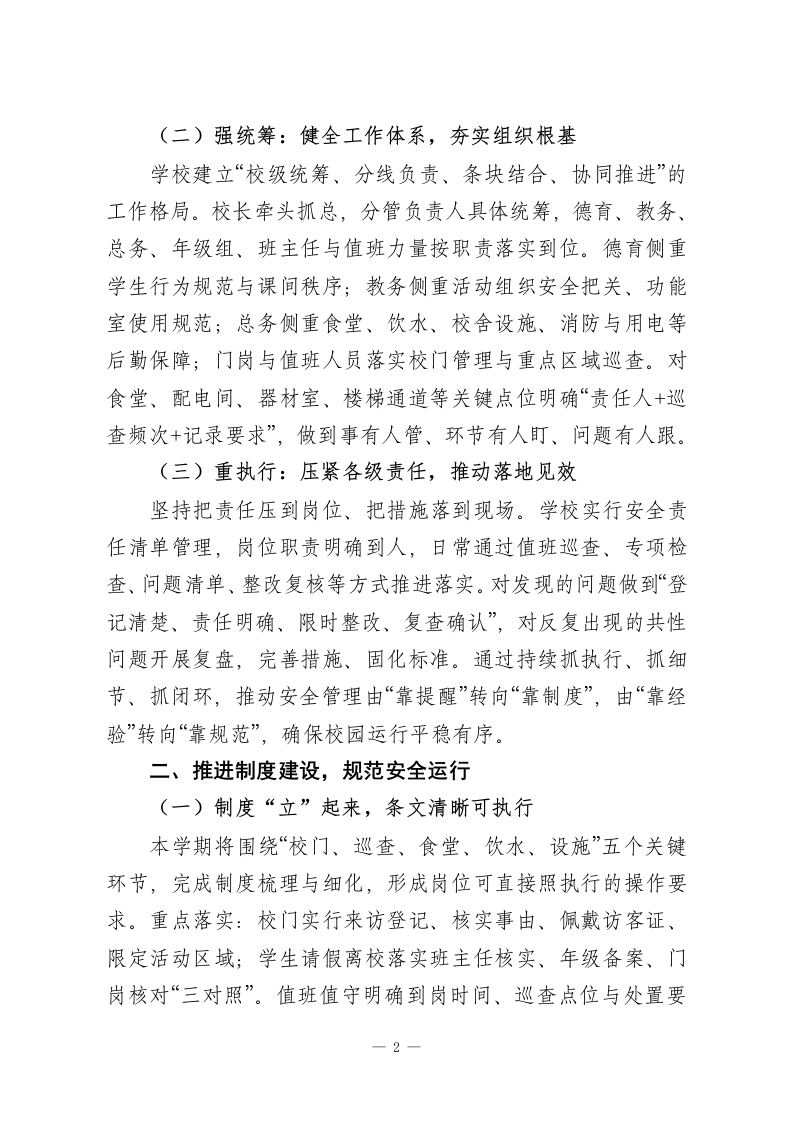 2026年春季学期学校安全工作计划守好一校之安,护好一日之常纪录片《了不起的工程中国桥》启示我们,越是复杂的系统,越离不开标准、流程与复核;越是关键的环节,越需要把风险想在前面、把细节抓到末梢。校园安全同样如此。从来不是“临时起意”的结果,而是建立在科学统筹、严密组织、精细管控与反复校核之上。学生在校学习生活涉及食堂、饮水、设施、用电、通道、活动组织等多个链条,任何一个环节疏漏都可能影响秩序与保障。本学期将围绕组织统筹、制度运行、重点部位防控、后勤保障、安全教育、应急处置与协同联动等方面,系统推进安全管理工作,推动从“提醒式管理”向“标准化运行”转变,切实守牢校园安全底线。一、加强组织领导,构建高效机制(一)定方向:明确主责主业,统筹谋划在前本学期安全工作坚持“预防在前、管理在常”的思路,把安全要求融入学校日常运行。学校结合春季特点和校园实际,明确重点关注七个方面:校门出入与访客管理、课间与活动秩序、消防通道与用电用气、食堂食品与饮用水、校舍设施与体育器材、上下学交通秩序、突发情况处置与信息报送。围绕这些重点,形成“月度关注点+周常提醒+日常巡查”的推进方式:月月有主题、周周有提示、天天有落实,确保方向清晰、重点聚焦、不偏不散。