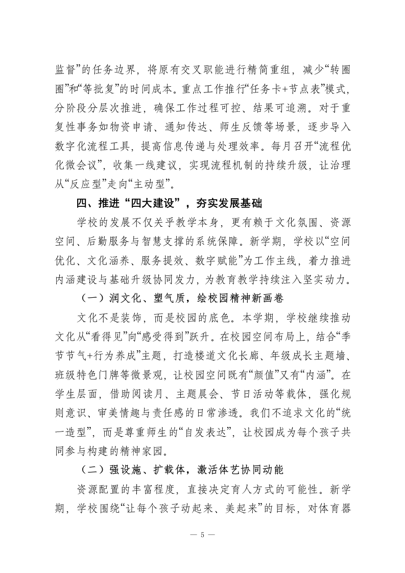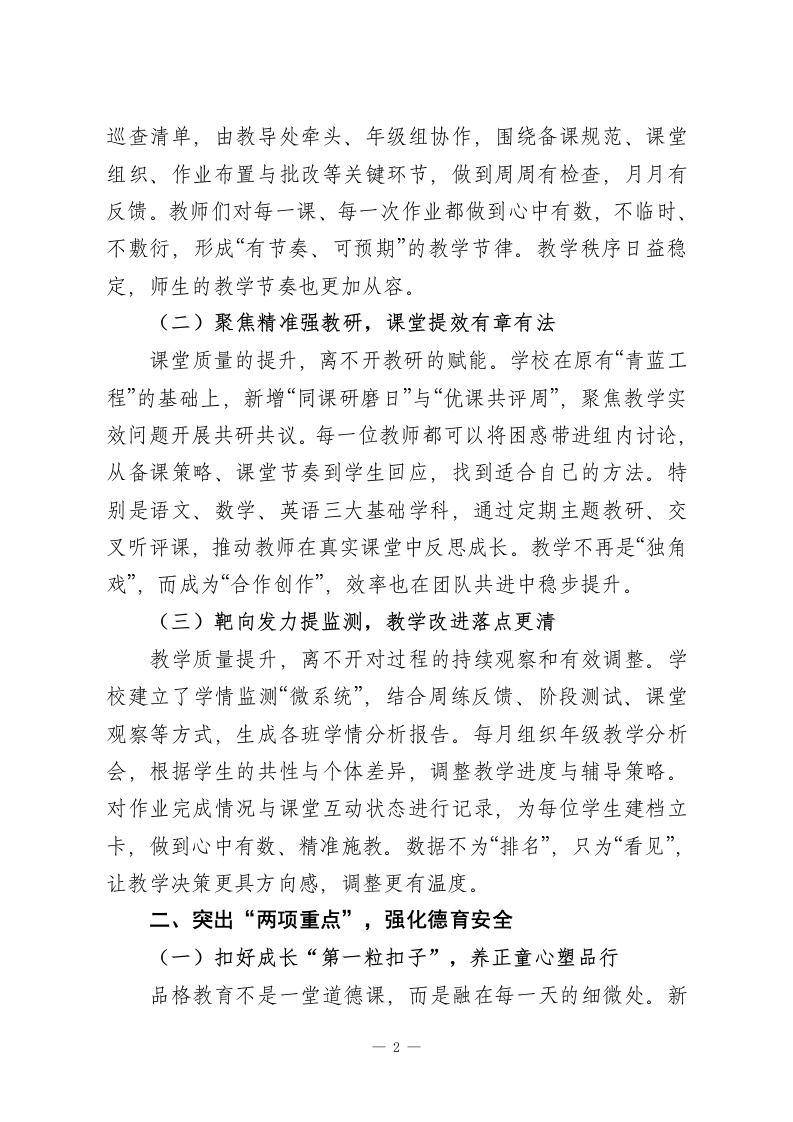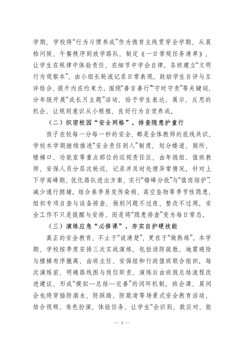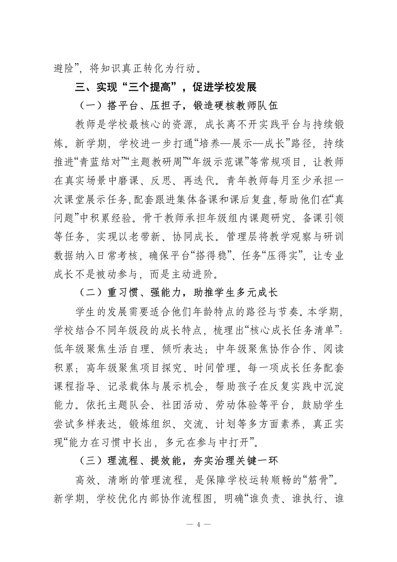 2026年春季学期学校全面工作计划凝心聚力开新局,携手共进谱新篇一、围绕“一个中心”,提升教学质量二、突出“两项重点”,强化德育安全三、实现“三个提高”,促进学校发展四、推进“四大建设”,夯实发展基础五、深化“五育融合”,培育未来栋梁六、强化“六项保障”,确保计划落实新故相推舒画卷,丹青妙手向翠峰。2026年春季学期,是学校承前启后、提质增效的重要阶段。站在“双减”深化、核心素养落实、五育融合推进的新背景下,学校坚持以学生全面发展为根本,以课堂提质、队伍建设、管理优化、资源统筹为重点任务,围绕“内涵建设+系统提升”双轮驱动,持续提升办学质量与育人效能。本学期,学校将以更清晰的目标、更务实的举措、更温暖的视角,谋实事、抓落实、见成效,全力构建更加高效协同、充满活力、富有人文温度的教育生态,努力办好每一节课、关注每一个人、成就每一份成长。现将本学期工作计划梳理如下:一、围绕“一个中心”,提升教学质量(一)立规明责抓常规,教学节奏更稳更实新学期,我们坚持“稳字当头、实字落地”,从教学常规入手,推动日常教学向规范化、细致化迈进。学校细化每周教学1