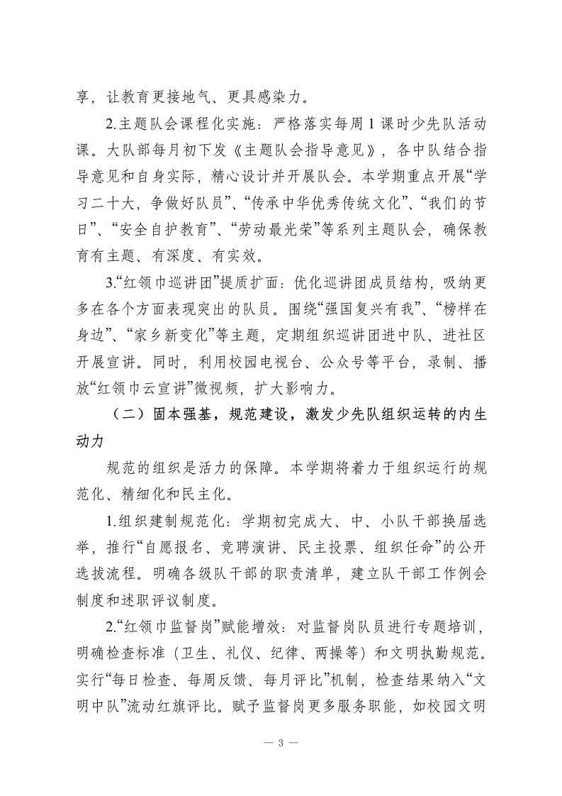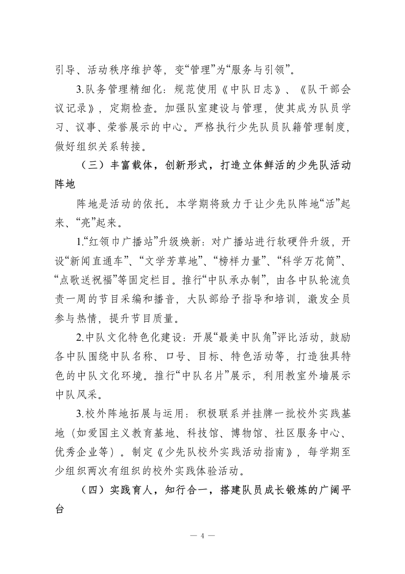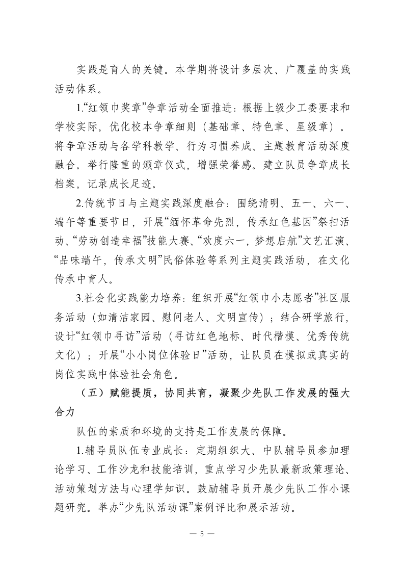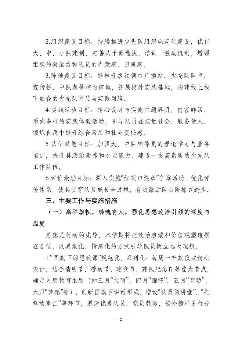 2026年春季学期学校少先队工作计划:龙马精神传薪火奋蹄扬鞭谱新篇征程万里风正劲,重任千钧再出发。新学期,我校少先队工作将秉持“为党育人、为国育才”的初心使命,聚焦培养担当民族复兴大任的时代新人。我们将以增强少先队员光荣感为核心,以夯实组织建设为基础,以深化政治启蒙和价值观塑造为主线,以丰富实践活动为载体,着力构建方向正确、内容鲜活、队员喜爱、成效显著的少先队工作新格局,团结、教育、引领广大少先队员努力成长为德智体美劳全面发展的社会主义建设者和接班人。一、指导思想以关于少年儿童和少先队工作的重要论述为根本遵循,全面贯彻落实《中共中央关于全面加强新时代少先队工作的意见》精神。坚持组织教育、自主教育、实践教育相统一,持续强化少先队员的思想政治引领。本学期,我们将围绕立德树人根本任务,结合重大节日、纪念日及时代主题,系统规划少先队活动,规范组织建设,创新工作方法,提升辅导员专业素养,努力推动学校少先队工作实现高质量发展,让红领巾事业焕发新的生机与活力。二、工作目标1.政治引领目标:通过规范化、系列化的仪式教育和主题队日活动,持续深化爱国主义、集体主义、社会主义教育,引导少先队员听党话、跟党走,筑牢红色根基。一1
