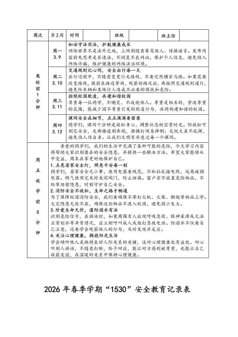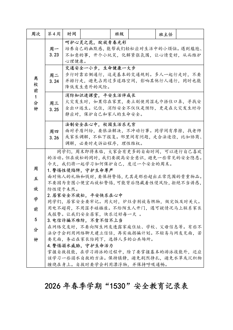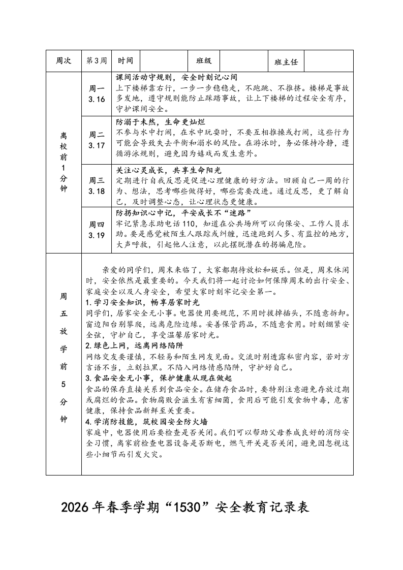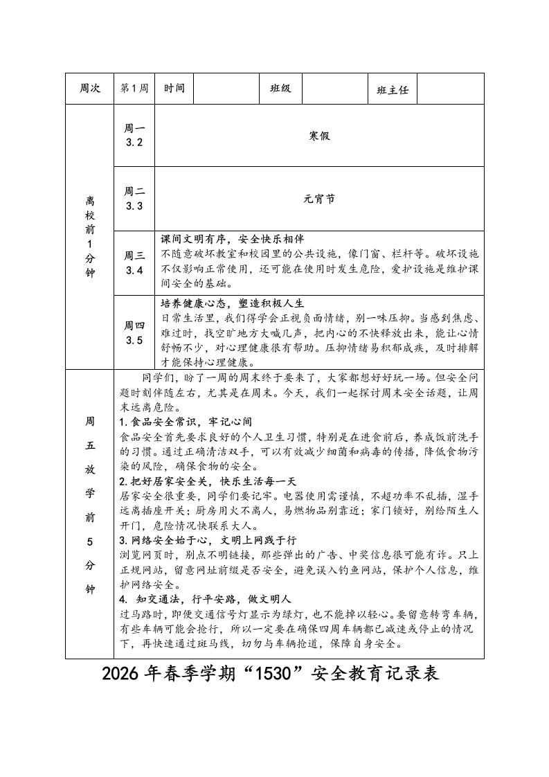 2026年春季中小学“1530”安全教育记录周备注/上课天次时间周周二周三周四周五周六周日数3天开学报13.2-3.6寒假元宵节1分钟1分钟5分钟周未周末道23.9-3.131分钟1分钟1分钟1分钟5分钟周末周末5天33.16-3.201分钟1分钟1分钟1分钟5分钟周末周末5天43.23-3.271分钟1分钟1分钟1分钟5分钟周末周末5天53.30-4.31分钟1分钟1分钟1分钟30分钟清明清明假期假期5天清明4.6清明64.6-4.10放假1分钟1分钟1分钟5分钟周末周末放假74.13-4.171分钟1分钟1分钟1分钟5分钟周末周末5天84.20-4.241分钟1分钟1分钟1分钟5分钟周末周末5天劳动劳动5.1劳动节94.27-5.11分钟1分钟1分钟30分钟劳动节假节假节假放假劳动105.4-5.8劳动1节假节假分钟1分钟1分钟5分钟周末5.4-5假9日调休115.11-5.151分钟1分钟1分钟1分钟5分钟周末周末5天125.18-5.221分钟1分钟1分钟1分钟5分钟周末周末5天135.25-5.29假期1分钟1分钟1分钟5分钟周末周末5天146.1-6.51分钟1分钟1分钟1分钟5分钟周末周末5天156.8-6.121分钟1分钟1分钟1分钟5分钟周末周末5天端午端午端午166.15-6.191分钟1分钟1分钟30分钟假期假期假期4天176.22-6.261分钟1分钟1分钟1分钟5分钟周末周末5天186.29-7.31分钟1分钟1分钟1分钟5分钟周末周末5天7.6-101分钟1分钟1分钟1分钟5分钟周末周末5天2026年春季学期“1530”:安全教育记录表