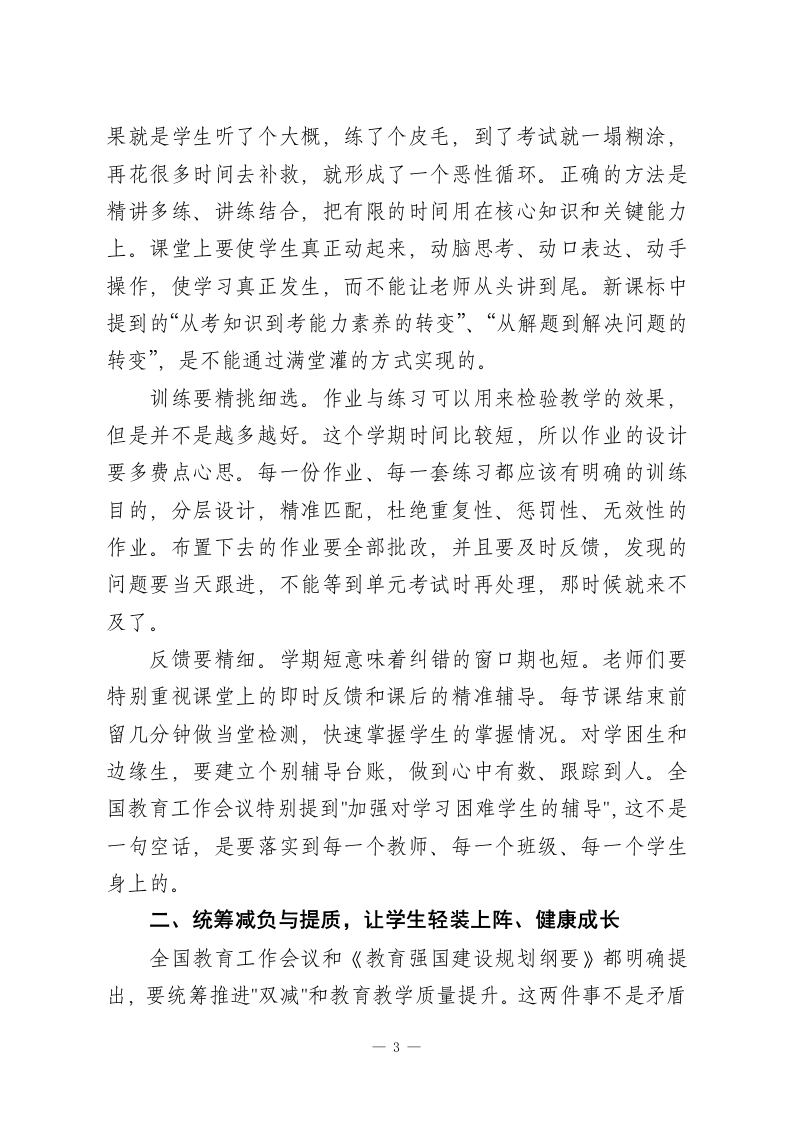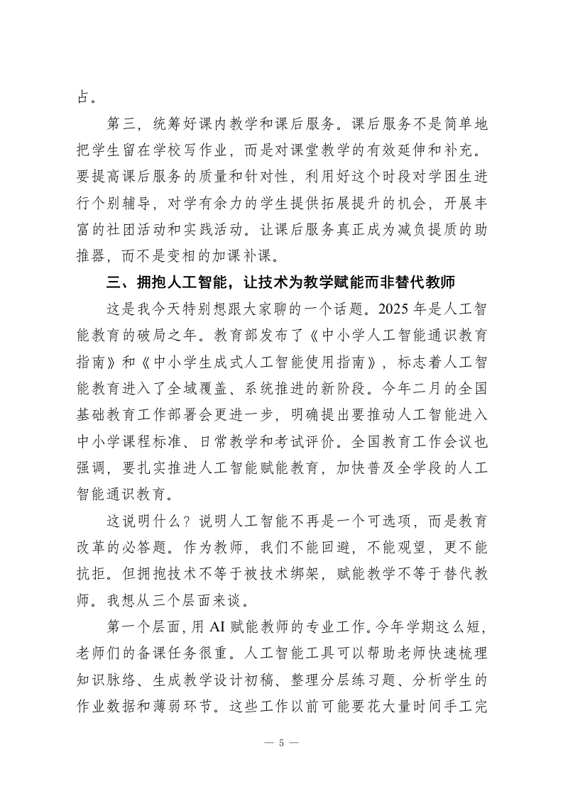26年春季开学教职工大会校长讲话:不能把压力转嫁给学生!80天、5大任务、3条红线!大家好,新春伊始,万象更新。祝大家新年快乐、新学期工作顺利。今天召开新学期教学工作会议,对大家起到收心动员的作用,同时布置工作任务。在正式谈论工作之前,我想先跟大家说明一下、公开一下我的账目。今年的春季学期和往年不同。由于闰月的原因,春节来得比较晚,大多数学校的开学时间都在三月初,暑假的时间基本没有变化,因此这个学期有效教学的时间被大大缩短,实际授课时间不到八十天。对于毕业班的学生而言,中考、高考的时间不会因为开学推迟,留给我们的准备时间更短了。这是今年最大的现实,也是我们必须面对的挑战。同时也要看到更大的背景。2026年是“十五五”开局之年,也是教育强国建设三年行动计划承上启下的关键一年。今年一月份的全国教育工作会议确定了八项重点工作,“攻坚”被当作全年教育工作的主旋律。二月初,全国基础教育重点工作部署会提出了扩优提质、课间15分钟、每天2小时综合体育活动、人工智能进课堂、中考改革有序推进、规范管理巩固年等具体要求,每一项都和我们日常的教学密切相关。学期时间短、任务繁重、要求严格,这就是我们所处的情