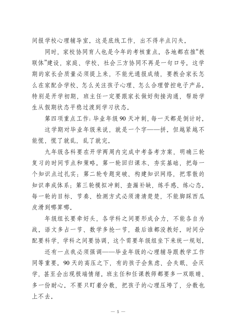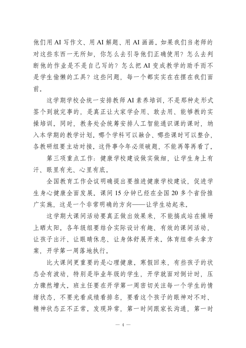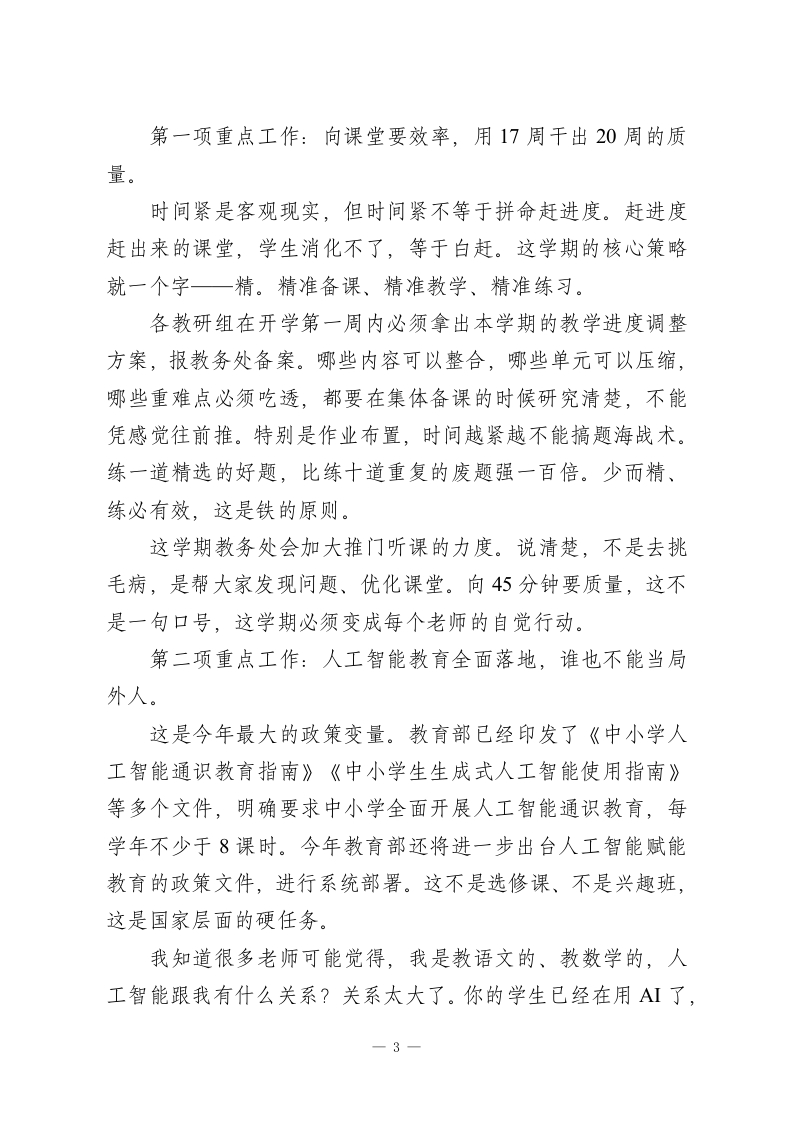 26年春季学期全体教师会讲话:1个开局年、4项重点工作、90天倒计时,一天都耗不起各位老师:大家好!先说句实在话,看到大家今天精精神神地坐在这里,我心里是踏实的。一个学校,散了一个假,人心能迅速拢回来,这本身就是一种战斗力。年过完了,今天坐到这里,我们就得把状态切回来。我今天不讲套话,就跟大家掏心窝子说说这个学期到底怎么干。先跟大家交个底一这个学期的时间,真的不够用。咱们3月初才正式开学,比往年晚了将近两周。但暑假放假时间不会推迟,中间还有清明、五一、端午三个假期要扣掉,算下来实际有效教学时间大概只有17周左右,比上学期少了将近三周。对毕业年级来说更紧迫,中考就在6月下旬,满打满算也就90天出头。这还不算各种模考、体育测试、实验考试占用的时间。与此同时,2026年是“十五五”规划的开局之年,也是教育强国建设三年行动计划承上启下的关键之年。今年1月份全国教育工作会议刚刚开完,释放了一系列新信号、新要求。上面的任务在加码,我们的时间在缩水,这就是这学期的基本面。形势摆在这里了,在讲具体工作之前,我先把两条底线跟