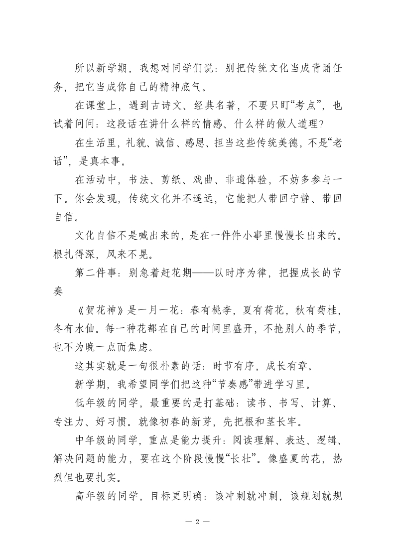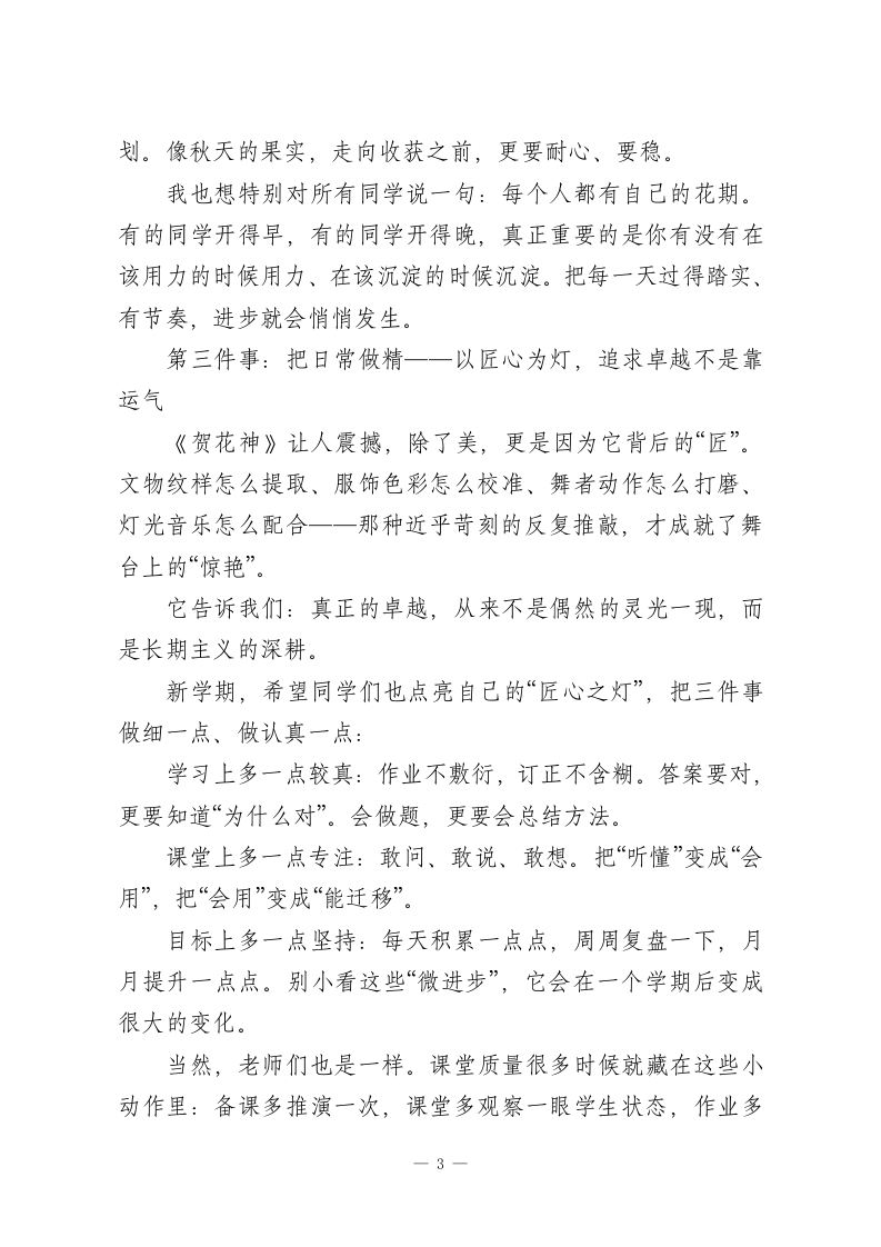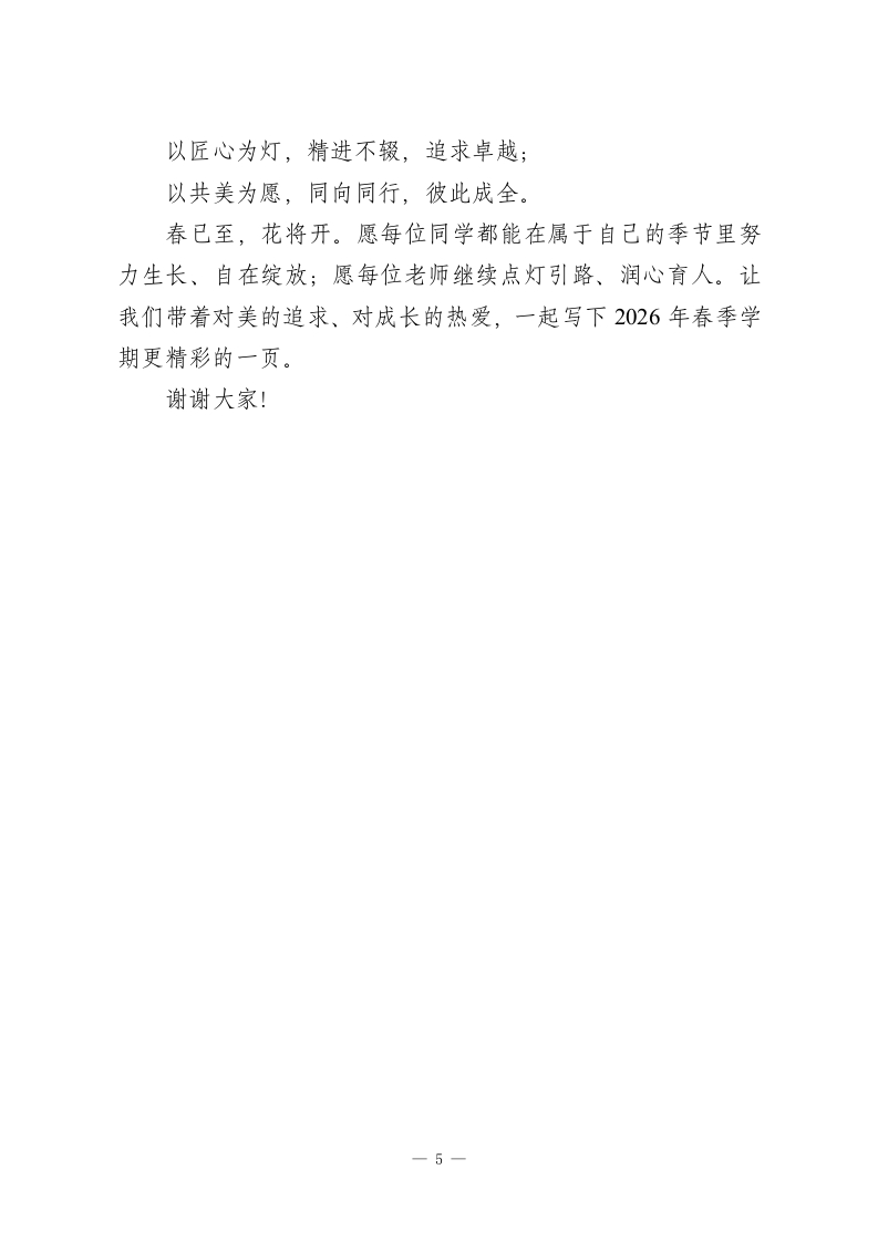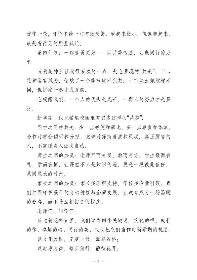 2026春季开学典礼,校长讲话:从《贺花神》说起,在春天里生长尊敬的各位老师、亲爱的同学们:大家上午好!春风一来,校园就有了新的气息。刚过完春节,我们带着年味儿的余温、也带着对新学期的期待,又在这里见面了。这个春节,很多人对央视春晚的《贺花神》印象很深。它不是那种“热闹一下就过去”的节目,而是越看越有味道一一以故官的“白玉月令组佩”为灵感,把十二月令、二十四节气、十二花神的意境,用“一月一人一景、一花一态一观”的方式慢慢铺开。节目里那种四季更迭、生命流动的节律感,特别打动人。我今天不打算讲太多大道理,就想借《贺花神》这个美的作品,提炼四点启示,送给大家当作新学期的“开学礼物”。四个关键词:文化、时序、匠心、共美。听着文雅,其实都很“落地”,跟我们的学习、工作、成长每天都有关。第一件事:把根扎稳一以文化为根,守住传承的脉《贺花神》最打动人的地方,是它对传统文化的那份尊重和认真。节目不是简单“借用”古风元素,而是扎扎实实地依托故宫院藏文物,把十二月令、节气、花神背后的文化意味,一点点通过舞台语言呈现出来。尤其是“缺失玉佩缓缓归位、十二块玉佩最终拼合圆满”的设计,很有象征:文化的传承不是一句口号,是一代一代人把碎片拼回完整,把记忆续上,把精神接力。一1