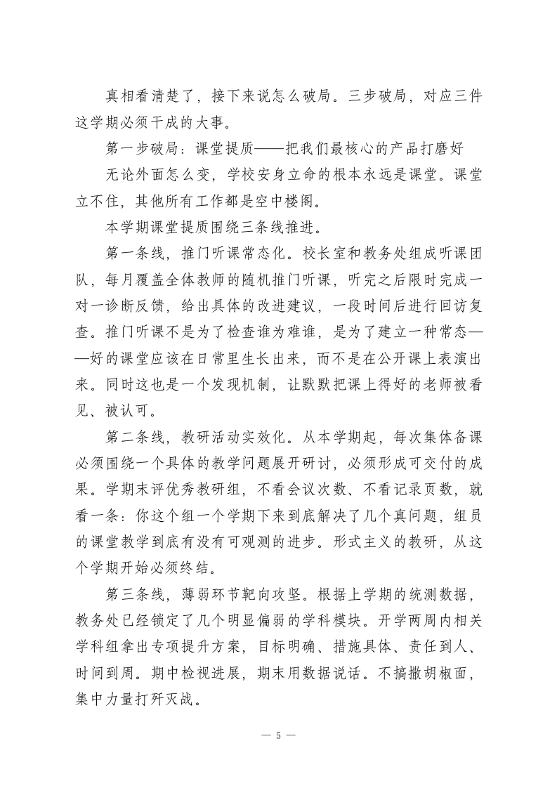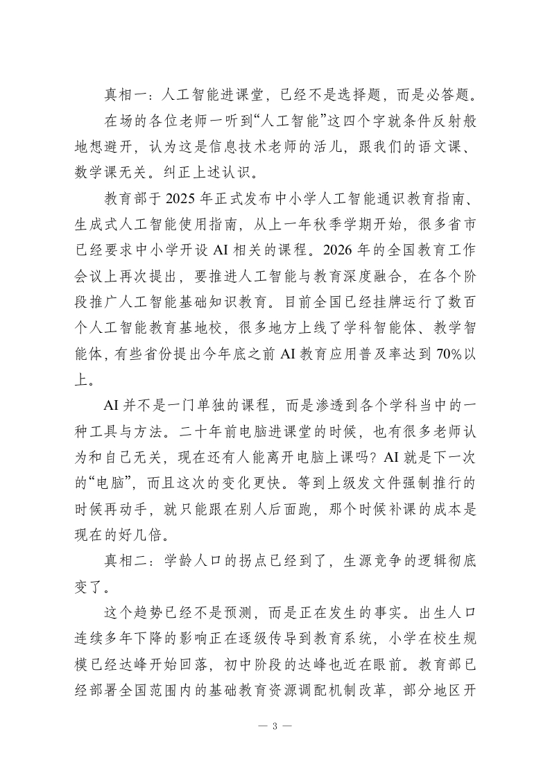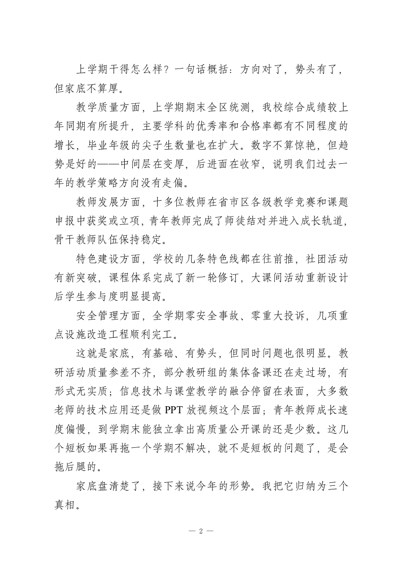 2026春季开学教职工大会校长讲话:1条主线、3个真相、3步破局,这篇太清醒了各位老师:大家好。寒假结束,新学期开始,按照惯例开全体教职工大会。今天不讲套话,就跟大家掰开了说三件事:我们的家底到底怎么样,今年的形势到底发生了什么变化,这个学期我们具体干什么。争取四十分钟以内讲完,不耽误大家做开学准备。开讲之前先定一个调。如果让我用一个词概括今年全校工作的总基调,我选“清醒”。2026年是“十五五”规划的开局之年,也是教育强国建设三年行动计划推进的关键节点。全国教育工作会议刚开完,信号非常密集一一人工智能赋能教育全面提速,教育评价改革动真格,学龄人口下降带来的资源重组已经启动。外面的变化很快,快到如果我们还在用去年的思路干今年的事,就一定会被甩在后面。清醒不是悲观,更不是唱衰。恰恰相反,只有清醒地看见问题,才能准确地找到出路。盲目乐观和盲目焦虑一样有害,我们需要的是看清楚形势、认清楚自己、想清楚路径,然后一步一步踏踏实实地干。这就是今年全校工作的一条主线:保持清醒,向前走。在展开三个真相和三步破局之前,先用几分钟时间盘一盘我们的家底。