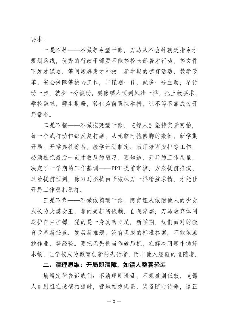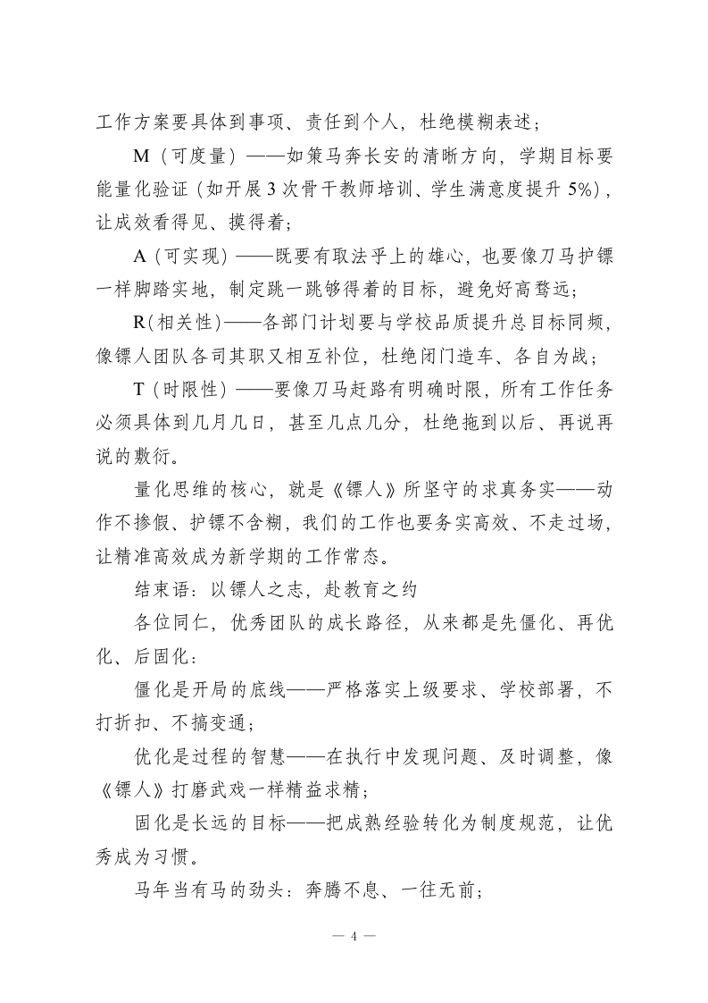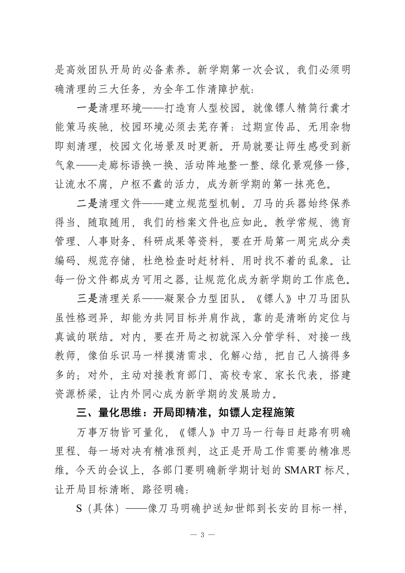 2026春季新学期第一次行政班子会议,校长引用电影《镖人》精彩发言:策马开新局,护镖启新程亲爱的各位行政同仁:春来潮涌东风劲,策马扬鞭启新程。今天,我们召开2026春季新学期第一次行政班子会议,这既是节后收心、凝聚共识的动员会,更是明确方向、部署任务的定盘星。马年新春的年味尚未散尽,但教育人的责任与使命已催促我们即刻启程。上学期末我们明确了部分工作要求,经过寒假的沉淀与新学期一周的筹备,成效值得肯定,但暴露出的落实差距、细节短板,更需我们在开局之初就正视破解。新学期、新起点,我们当以开局就是决战,起步就是冲刺的姿态,扛起管理责任。马年春节档热映的武侠电影《镖人》,让我们看到了以镖为命、以实为基的坚守一一刀马一行穿越大漠戈壁,凭真功夫护镖、靠硬担当破局,这份护镖人的初心与韧性,正是我们教育管理者最需要的精神底色。今天,我以三种思维为纲,与大家共勉,愿我们以镖人之志、龙马之力,共同筑牢学校发展的护城河。一、抢跑思维:开局即抢滩,如镖人探路先行《镖人》中刀马护送知世郎的征程,从不是等危险降临才拔刀,而是未出发先探路、未遇敌先布局,这正是“明者远见于未萌”的开局智慧。新学期第一次会议,就是要明确抢跑的核心