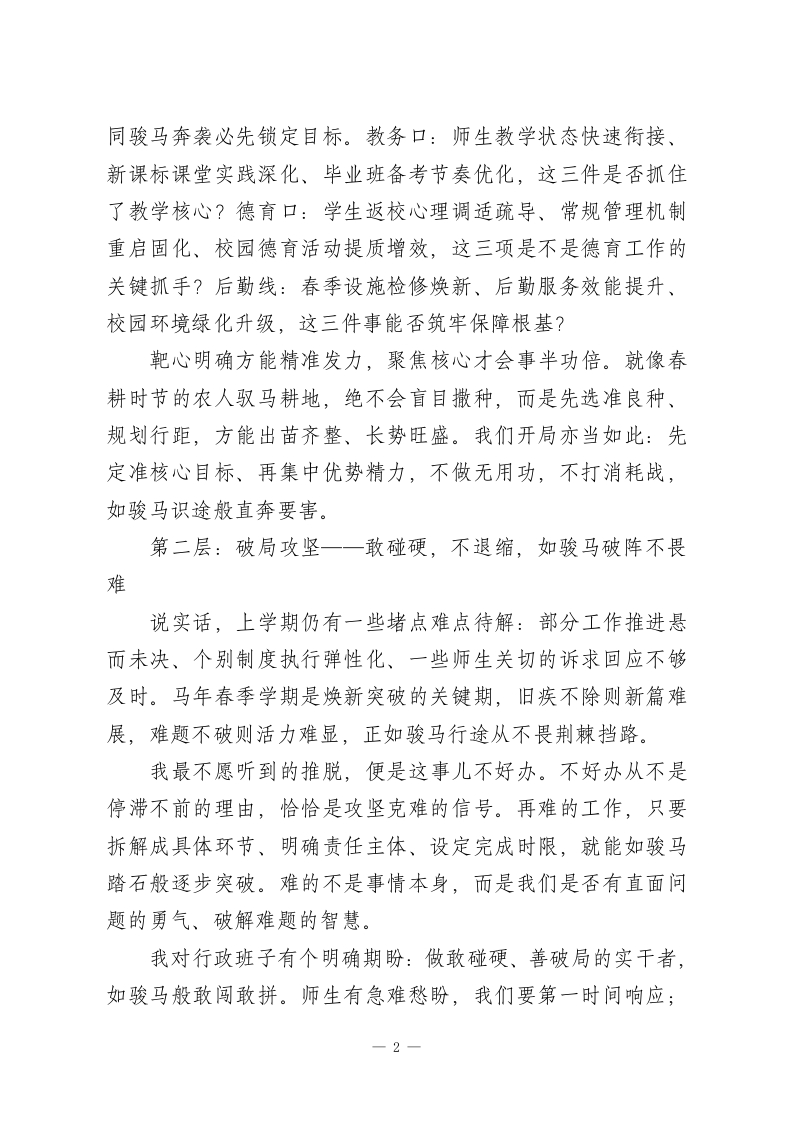 2026春新学期第一次行政班子会,校长讲话:携手把新学期的各项工作推向新高度各位行政同仁、各位主任:大家早上好!甲辰马年春启新程,恰是马蹄踏春、奋楫争先的时节。新学期首次行政班子相聚,校园里新芽萌发、生机盎然,师生们带着新春的朝气与龙马精神重返校园,步履轻快、意气风发。今年是2026马年,我总深深感触:马象征着奋进、执着与协同,教育恰是一场需如骏马般笃行不怠的播种,新学期便是凝心蓄力、破土生长的关键起点。既然要并肩如马群般奔袭向前、播撒希望,我们必须先厘清核心命题一一这片“成长田”,该如何如骏马耕地般耕得深、如伯乐相马般种得准、如马到成功般长得旺?今天不谈虚话套话,就围绕深耕马年春季新学期之路,与大家分享四层感悟。第一层:定准靶心一一明重点,不分散,如骏马识途不迷向春季开学往往面临“复苏式忙碌”:师生状态收心归位、学期计划落地启幕、新课标深化推进、毕业班冲刺备考,稍有疏忽就会陷入“样样都抓却样样不精”的困境一一看似脚步不停,实则核心任务推进滞后,精力被繁杂事务牵扯。在此明确要求:各位主任务必于3个工作日内,锁定分管条线新学期最关键的3件事,不贪多求全,只求精准发力,如1