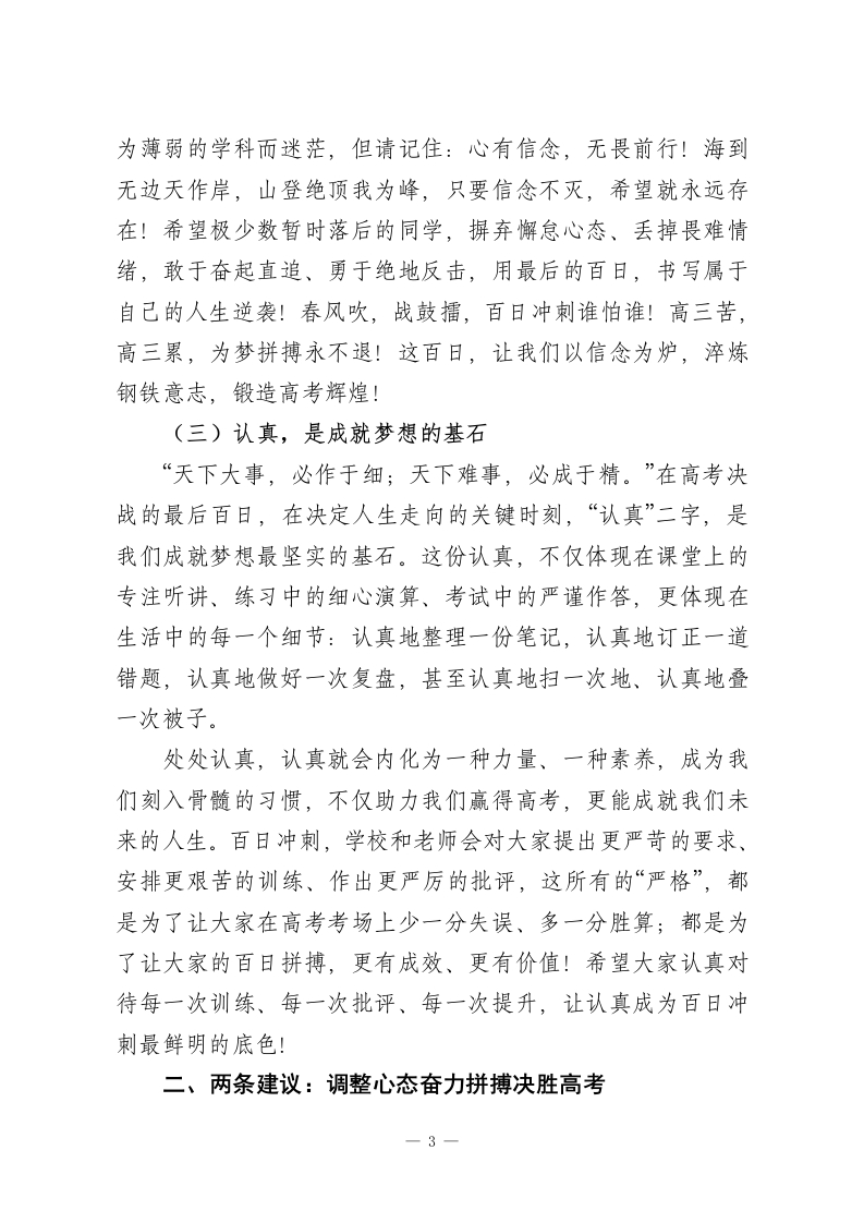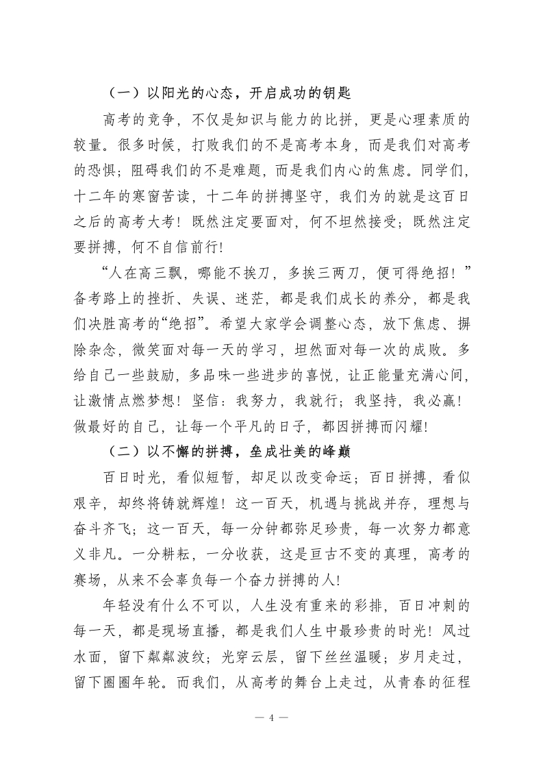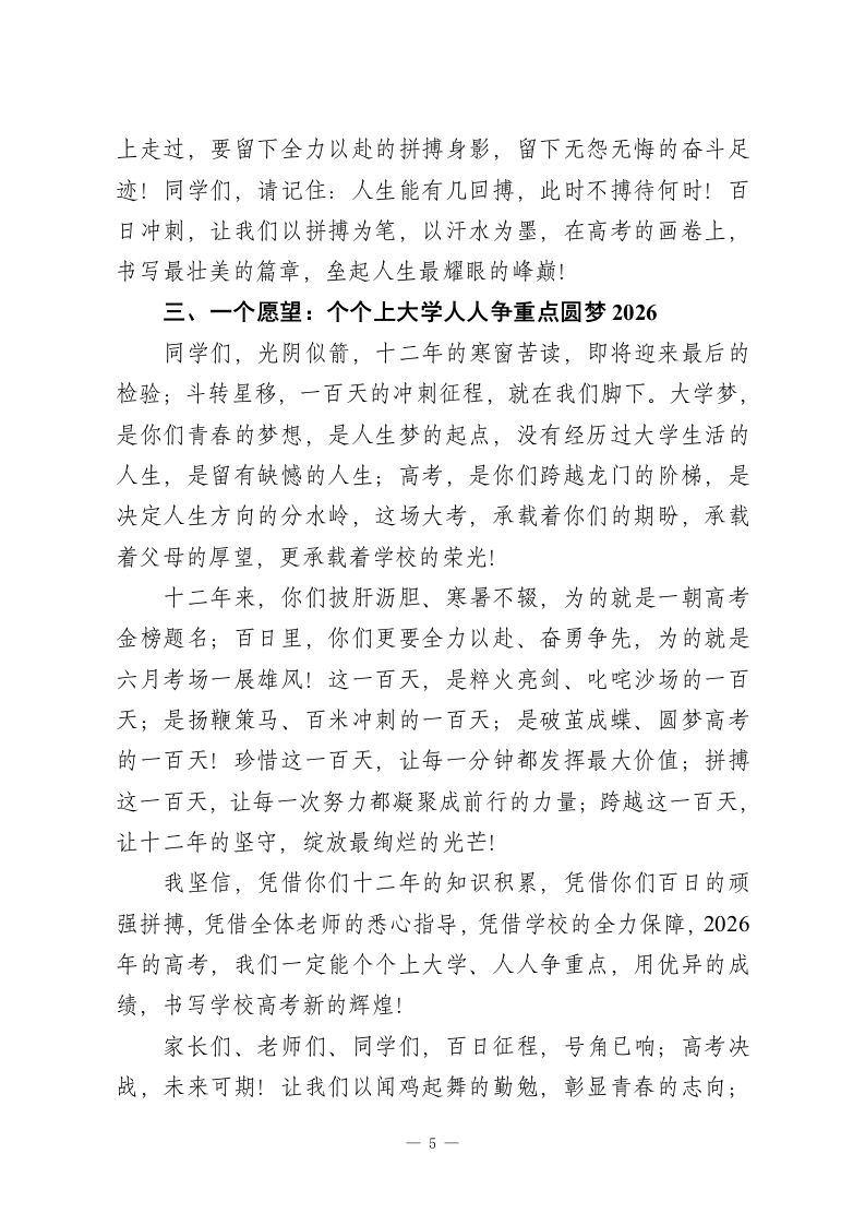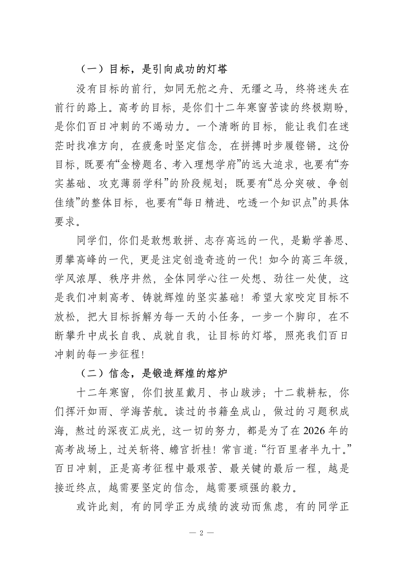 2026届高三百日冲刺誓师大会高中校长讲话:与汝同行战百日,同心筑梦赢高考家长们、老师们、亲爱的同学们:大家好!春潮澎湃启新程,百日鏖战铸辉煌。踏着2026年春日的脚步,迎着高考决战的号角,今天,我们齐聚一堂,隆重举行2026届高三百日冲刺誓师大会!这是一场凝聚力量的动员会,是一场砥砺斗志的鼓劲会,更是一场奔赴梦想的誓师会!在此,我谨代表学校,向为孩子成长默默付出的各位家长表示衷心的感谢!向深耕讲台、陪伴冲刺的全体高三教师致以崇高的敬意!向即将奔赴高考战场、奋力拼搏的每一位高三学子,致以最热烈的祝福和最坚定的期许!同学们,百日倒计时的钟声已然敲响,高考的战鼓就在耳畔。此刻,我能读懂你们心中的紧张与忐忑,更能感受到你们眼中的坚定与期盼;能体会到你们十二年寒窗苦读的坚守,更能理解你们直面人生大考的勇气。作为你们的校长,在这百日冲刺的关键征程上,我就是你们备战高考的参与者,与你们并肩作战、朝夕相伴;就是你们努力冲刺的坚强后盾,为你们遮风挡雨、保驾护航;就是你们决胜千里的谋划者,为你们精准导航、助力圆梦!今天,我想围绕百日备考,和大家分享三点想法、两条建议,许下一个共同的愿望,愿我们同心同德、全力以赴,用百日拼搏,书写人生华章!一、三点想法:锚定方向凝心聚力夯实根基—1