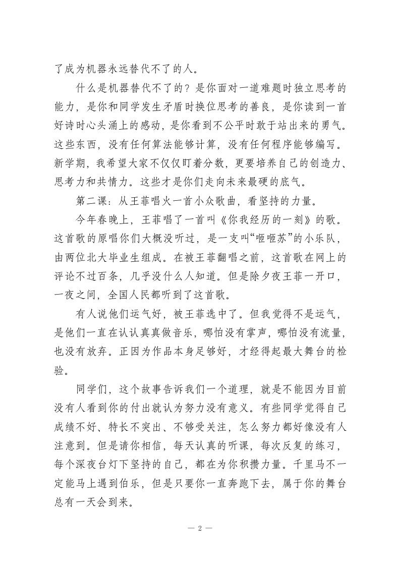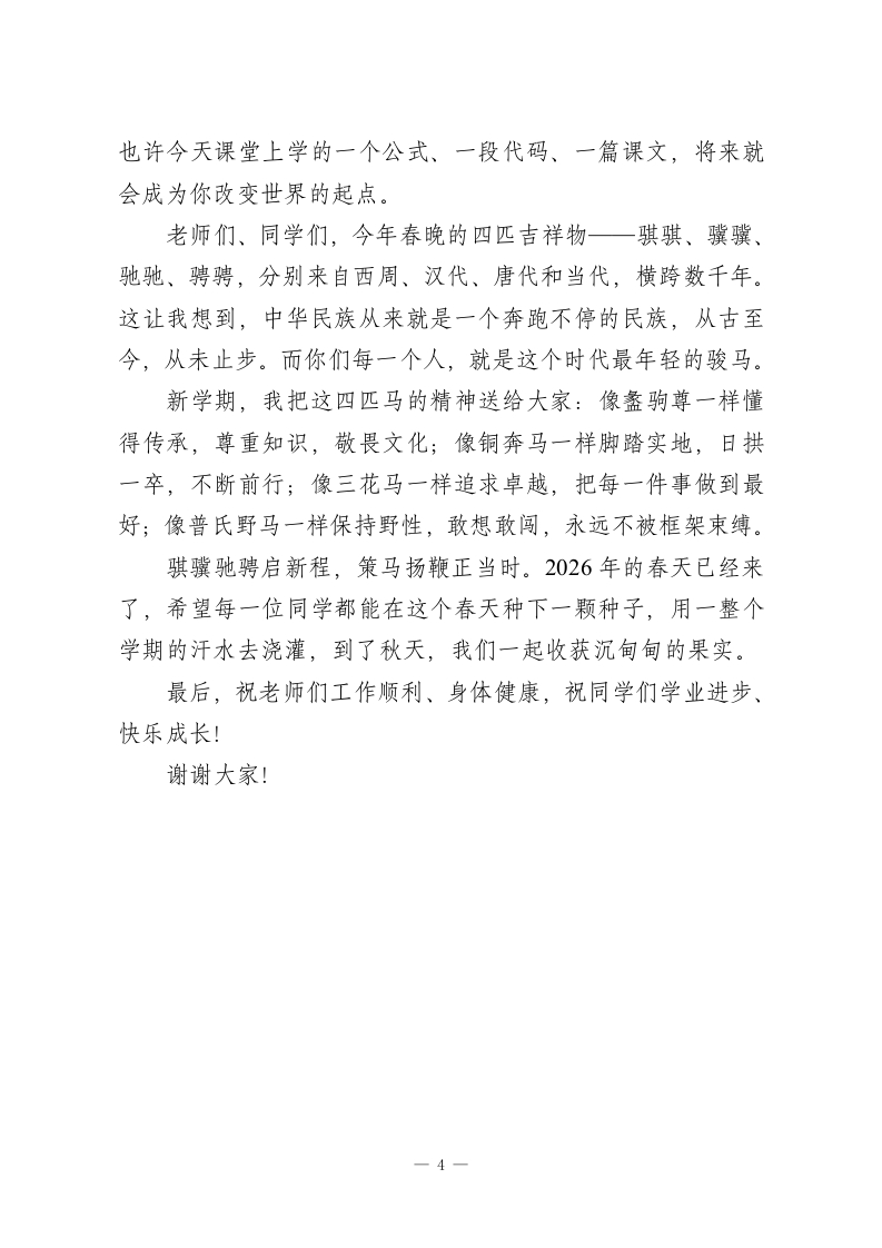2026马年春季开学典礼校长讲话:春晚里藏着最好的开学第一课亲爱的老师们、同学们:大家好!春风送暖,万象更新。带着春节的喜庆和团聚的温暖,我们又回到了熟悉的校园。在此,我代表学校向全体师生致以新学期最诚挚的问候,祝大家马年大吉,万事如意!几天前的除夕夜,相信大家和家人一起看了春晚。今年春晚的主题叫“骐骥驰骋,势不可挡”,我觉得这八个字,送给我们新学期的每一位同学,再合适不过了。新学期就是一条新的赛道,我希望大家都能像骏马一样,蹄疾步稳,奔赴自己的远方。今天站在这里,我不想讲太多大道理,我想借春晚里的几个画面,给大家上新学期的“开学第一课”。第一课:从机器人打武术,看我们到底该学什么。去年蛇年春晚,穿着花棉袄扭秧歌的机器人惊艳了全国。今年马年春晚,这群机器人又升级了,不光能跳舞,还能打武术、参与语言类节目,动作整齐划一,甚至能和演员实时互动对话。短短一年,变化就这么大。同学们,这说明什么?说明人工智能的进化速度远远超出我们的想象。也许再过几年,很多重复性的、标准化的工作,机器都能做,而且做得比人还好。那我们读书到底是为了什么?我想告诉大家,读书不是为了变成一台更高级的机器,而是为1