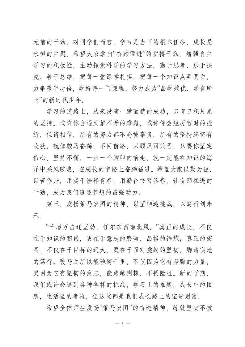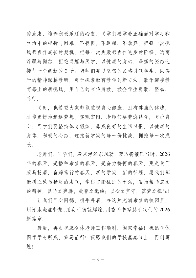2026年春季开学典礼校长讲话:策马扬眉立远志,奋蹄笃行创未来尊敬的老师们、亲爱的同学们:大家上午好!春风送暖,草木蔓发;骐骥踏春,万象更新。在这生机盎然、充满希望的美好时节,我们告别2026年新春的团圆与喜悦,重返书香满园的校园,共同开启春季学期的崭新征程。在此,我谨代表学校,向全体师生致以最诚挚的新春祝福和热烈的开学问候!祝老师们马年大吉、工作顺遂、桃李芬芳,祝同学们龙马精神、学业精进、快乐成长回望过去的一段时光,全校师生同心同德、锐意进取,在教育教学的沃土上深耕不辍,在成长成才的道路上携手并肩。我们见证着学校的点滴进步,感受着彼此的温暖陪伴:老师们坚守三尺讲台,以爱育人、以智启人,用专业与坚守诠释教育初心;同学们勤学善思、笃行奋进,用汗水与努力书写青春答卷。校园里的每一份收获,都凝聚着全体师生的辛勤付出;每一点进步,都彰显着我们凝心聚力、奋勇争先的精神风貌。这份并肩前行的温暖,这份砥砺奋进的力量,也将成为我们新学期勇毅前行的坚实根基。2026年是农历丙午马年,在中华传统文化中,马是奔腾、奋进、坚韧、担当的象征,它代表着一往无前的勇气,脚踏实地的实干,以及志存高远的追求。值此新学期启航之际,我借马年的美好寓意,结合三个饱含期许的关键词,向全体师生提1