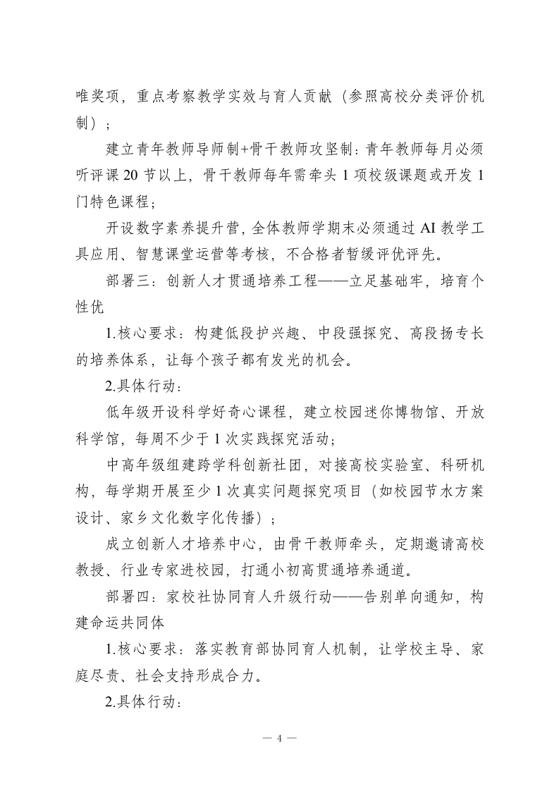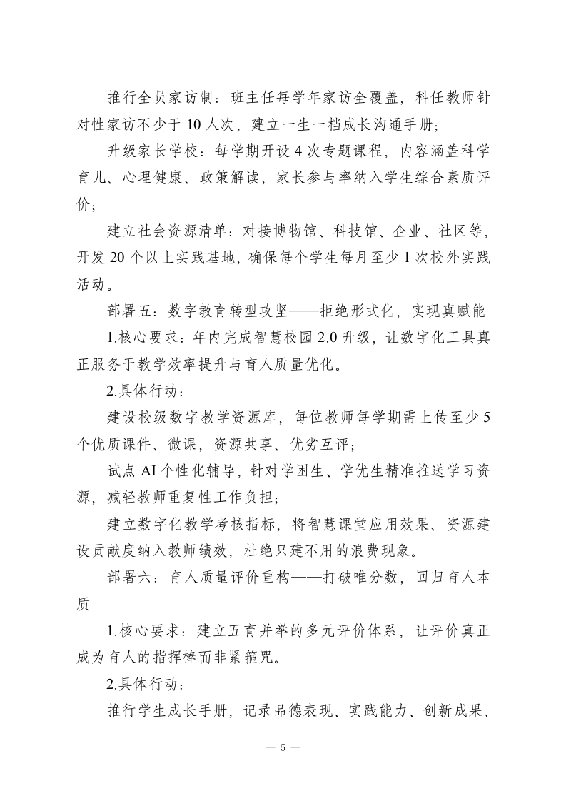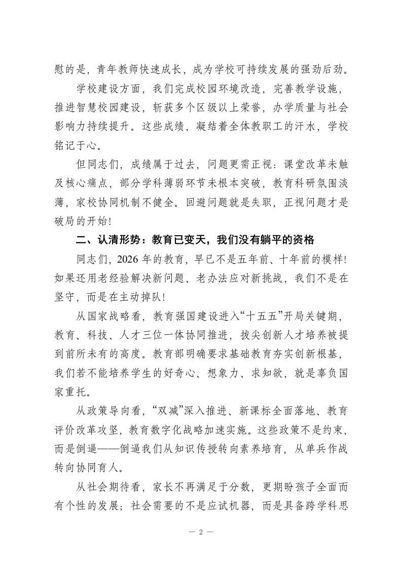 2026年春季开学教职工会议,校长讲话:以改革之剑破局,以实干之力育人各位老师、同志们:金蛇辞旧岁,骏马迎春来。经过一个充实而又短暂的寒假之后,我们又回到了熟悉的校园里,一起迎接2026年春季学期的新开始。我代表学校领导班子,给全体教职工送上马年的美好祝福,对假期中坚守岗位、默默奉献的同志表示衷心的感谢!刚刚过去的马年春节,大家走亲访友、陪伴家人,想必都得到了身心休整与情感滋养。但此刻重返校园,我们的身份已从家人切换为教育人一一肩上扛起的,是立德树人的使命,是家长的期盼,更是时代赋予的责任。新学期,新起点,今天我重点讲三个部分:总结过去,认清方向,走好脚下之路。一、回顾过去一年:每一寸付出都值得被看见刚刚过去的2025年,是我校历史上极不平凡的一年。全体教职工齐心协力、攻克难关,交出了一份沉甸甸的成绩单:教育教学方面,我们以质量为核心,推进课堂改革、贯彻新课标理念,课堂生态持续改善。各年级期末检测稳步上升,区域统考多学科位次前移,毕业年级模考成绩显著提升,非毕业年级合格率、优秀率同步增长。这背后,是每位老师昼夜备课的坚守,是教研组反复磨课的集体智慧。教师发展方面,一批教师在各级竞赛、论文评比、课题研究中崭露头角:多位教师斩获市级以上优质课奖项,多篇论文在省市级刊物发表获奖,多个课题顺利开题结题。尤其值得欣1