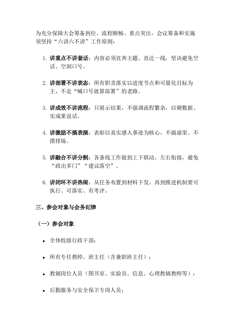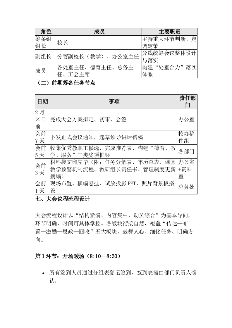 2026年春季开学全体教职工大会活动方案一、活动背景与目的2026年春季新学期正式开启,这是全面贯彻党的二十大精神和新时代教育高质量发展任务的关键阶段。站在新起点,面对教学任务集中、评估检查密集、改革推进多线并发的形势,学校各项工作面临前所未有的挑战与压力。从“基础教育优质均衡”的外部要求,到“双减”“三新”落实、“一老一小”导向深化、高中招生压力叠加、学生心理健康问题凸显等内部复杂变量,学校必须实现有衔接、有支撑、有序推进的全面统筹。新学期教职工大会,不仅是新学期工作的“发令枪”,更是形成共识、提振士气、压实责任的重要组织形式。办好一次务实高效、直击重点、触动人心的职工动员会,是确保开学工作启动顺、责任任务落地真实、师生状态调整及时的关键一步。会议将坚持“一条主线、两个导向、三个聚焦、四大目标”总体思路:,一条主线:即紧扣“党建引领一教育提质一队伍驱动”这条战略主线谋部署。·两个导向:以问题为导向、以发展为导向,做到应剖必剖、应讲必讲。。三个聚焦:聚焦任务分解、聚焦流程落位、聚焦标准提升。。四大目标:统一思想、厘清任务、明确分工、形成合力。二、工作原则与总体设计