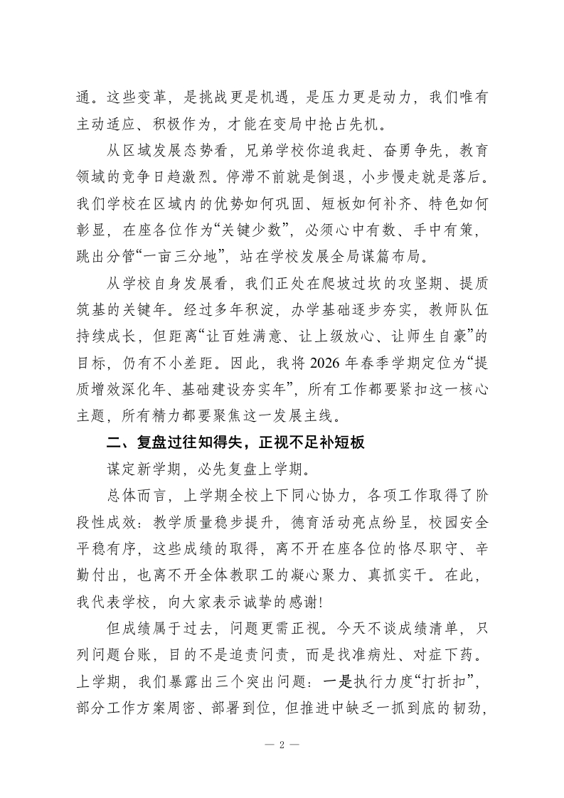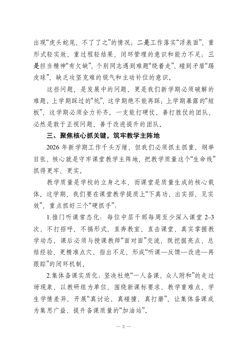 2026年春季新学期开学前中层干部会议,校长讲话:龙马扬鞭启新程,实干担当提质效各位中层干部:大家好!丙午马年春启新章,寒假的余温尚未散尽,新学期的号角已然吹响。今天,在全体教职工大会之前,我们这支核心团队率先聚首,既是收心归位的“碰头会”,更是凝心聚力的“动员会”,目的就是把思想统一起来、把方向校准起来、把任务明确下来,以龙马精神的昂扬姿态,为2026年春季新学期各项工作开好局、起好步。今天,我想围绕五个核心方面,与大家坦诚交流、深入交底。一、看清大势明方向,拉高站位谋全局开学前夕,我一直在思考一个问题:2026年新学期,我们要以怎样的姿态破局、以怎样的举措提质?答案,既要立足校内的实际,更要放眼外部的变局。从宏观教育格局看,新课标实施进入深化期,核心素养的落地不再是“选择题”而是“必答题”,必须贯穿课堂教学、作业设计、评价反馈的全链条;“双减”政策持续走深走实,校外培训的“补位空间”不断压缩,家长对学校教育的期待值、依赖度达到新高度;教育评价改革蹄疾步稳,“重实绩、强内涵、看质量”的导向愈发鲜明,那些重形式、轻实效的“表面文章”已然行不