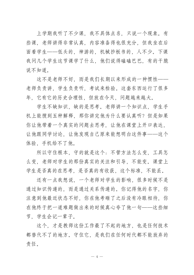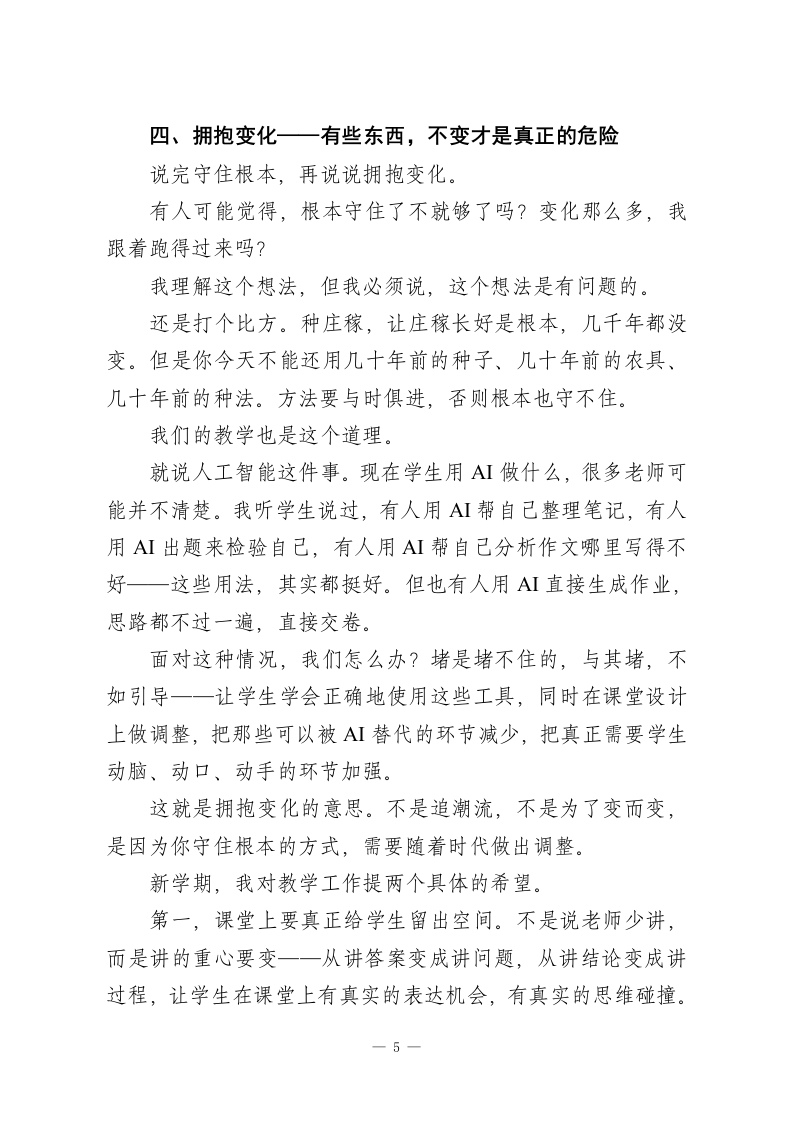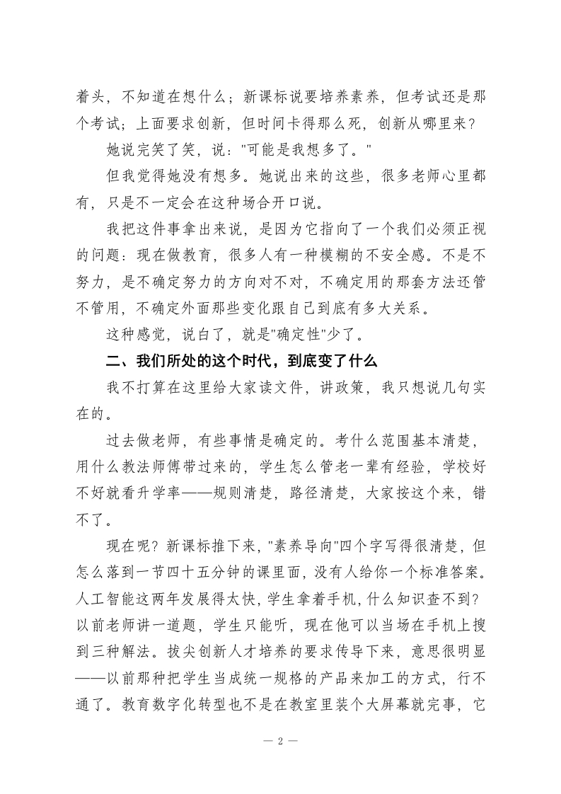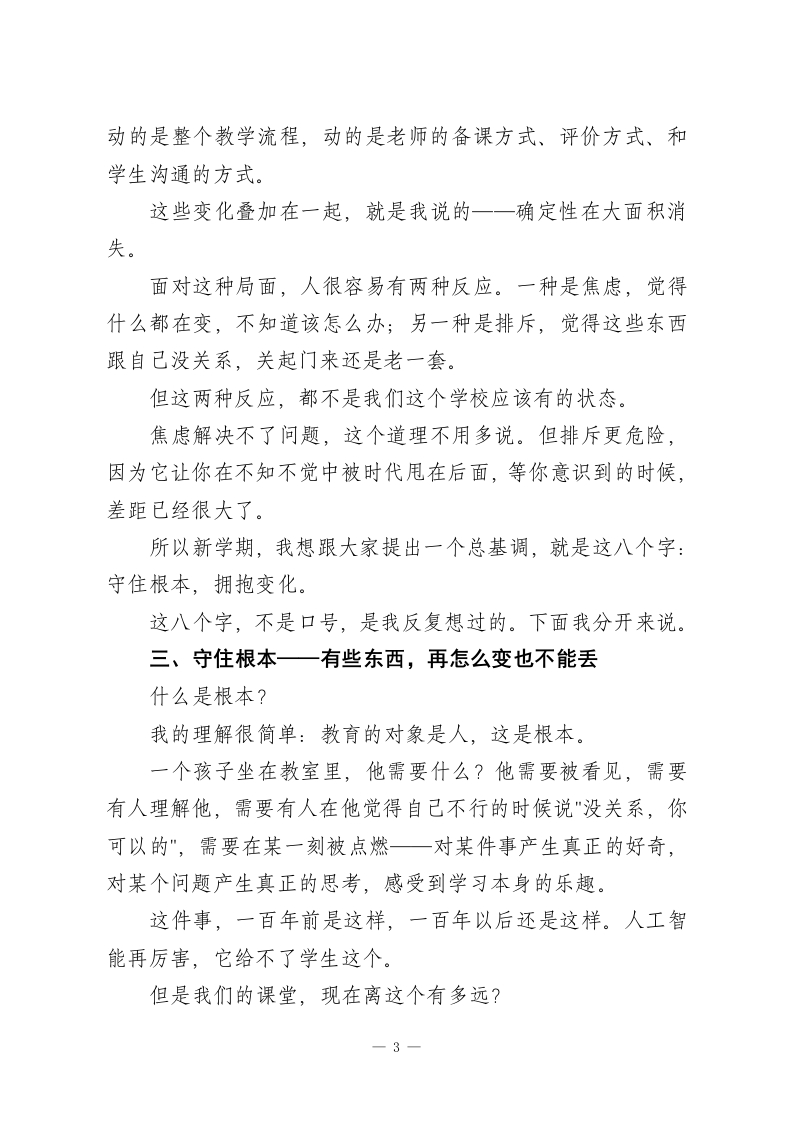 2026年春季学期教职工大会上,校长讲话:这一年,我们靠什么站稳脚跟?各位老师、各位同事:大家好!春节刚过,年味儿还没完全散,大家就都回来了。我知道有些老师家还在外地,有些人假期根本没怎么歇一一改卷的、备课的、处理各种事情的,都有。所以开场我先说一句:辛苦了,真的辛苦了。每年这个时候,我都要想一想,今天这个会到底要说什么。布置任务要说,工作安排要说,这些少不了,等会儿各部门都会跟大家对接。但在那些之前,我想先跟大家聊一个根本的问题一2026年,我们靠什么站稳脚跟?带着这个问题,我想跟大家说一些真心话。一、先从一个真实的场景说起上学期期末前,我在办公室里约了几位老师单独谈话,不是谈成绩,就是聊聊近况。其中有一位老师,教了将近二十年书,各方面口碑都很好,我们聊着聊着,她说了一句让我印象很深的话。她说:"校长,有时候我站在讲台上,会忽然冒出一个念头我在干什么?”我当时愣了一下,问她什么意思。她解释说,不是不想干,是有时候真的不确定自己做的这些事情还有没有意义。学生低1