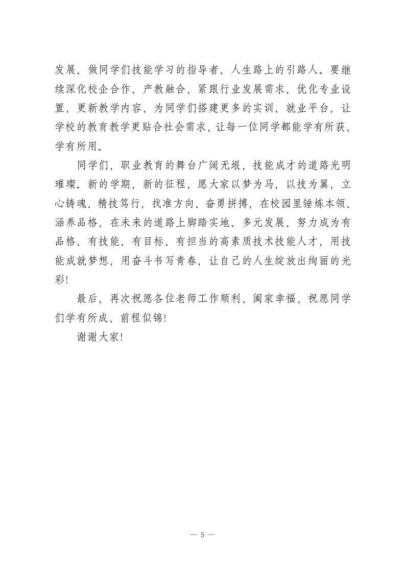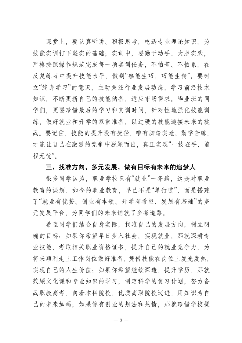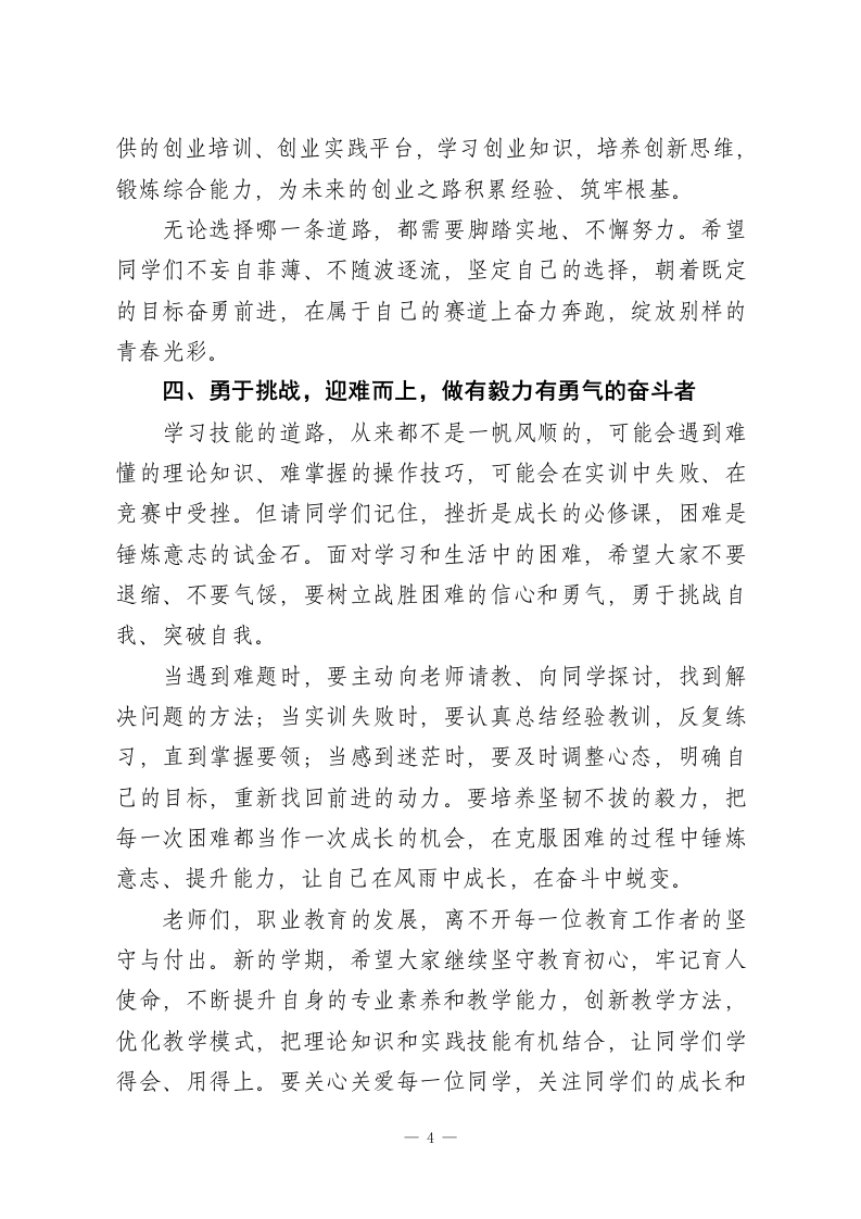 2026年春季学期开学典礼职教校长讲话:精技笃行筑根基,多元发展向未来老师们、同学们:大家上午好!灵蛇辞旧岁,金马踏春来。在这万物复苏、生机盎然的美好时节,我们告别寒假、重返校园,共同开启2026年春季学期的崭新征程。首先,我代表学校校委会,向全校师生致以最诚挚的新春祝福和新学期的美好期许!祝各位老师工作顺利、桃李芬芳,祝同学们学有所成、前程似锦,也祝愿我们的学校在新的一年里蒸蒸日上、再创佳绩!回望过去的一学期,全校师生同心同德、真抓实干,在教育教学、技能实训、升学就业、校园建设等各个方面都交出了亮眼的答卷:技能竞赛中,同学们屡获省、市级奖项,尽显职教风采;升学考试中,毕业班学子不负众望,多名同学考入心仪的本科院校,实现学历提升;校企合作持续深化,一批优秀毕业生顺利走上工作岗位,用技能站稳脚跟;校园里,各类技能文化活动有声有色,同学们的综合素养不断提升。这些成绩的取得,离不开每一位老师的辛勤耕耘、悉心指导,更离不开每一位同学的刻苦钻研、不懈努力。职业教育是国民教育体系和人力资源开发的重要组成部分,是培养高素质技术技能人才、促进就业创业、推动产业升级的重要途径。如今,职业教育迎来了前所未有的发展机遇,社会对技术技能人才的需求日益迫切,拥有一技之长的职教生,正1