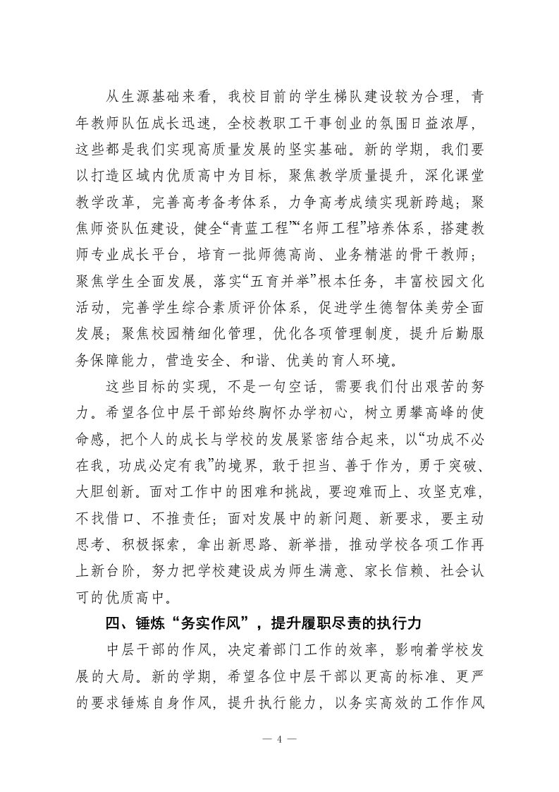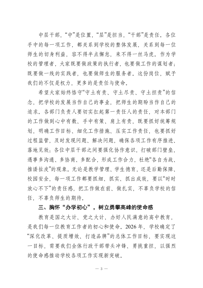 2026年春季学期开学行政工作收心会议高中校长讲话:守责笃行强担当,凝心聚力促发展各位中层干部:大家上午好!春启新程,实干为要。今天我们召开2026年春季学期开学第一次行政工作会议,既是收心归位、部署工作的动员会,也是凝心聚力、加压奋进的攻坚会。回首2025年,学校在教育教学质量、师资队伍建设、校园品牌打造、学生全面发展等方面均取得了阶段性突破,高考各项指标稳步提升,学科竞赛屡创佳绩,校园特色建设初见成效,这些成绩的取得,离不开全校教职工的共同努力,更离不开在座各位中层干部的勇挑重担、履职尽责。中层干部是学校发展的中坚力量,是连接学校决策与一线执行的桥梁纽带,更是推动学校各项工作落地落实的关键抓手。学校的办学理念、发展规划、工作部署,最终都要通过各位转化为具体的行动、实际的成效。2026年是“十五五”规划开局的关键之年,也是学校深化教育改革、提质增效升级的攻坚之年,面对教育强国建设的纵深推进、新高考改革的持续深化,以及社会各界对优质高中教育的更高期待,学校发展迎来了新的机遇,也面临着新的挑战。站在新的起点,如何抢抓机遇、破解难题,推动学校教育教学工作再上新台阶,关键在管理,核心