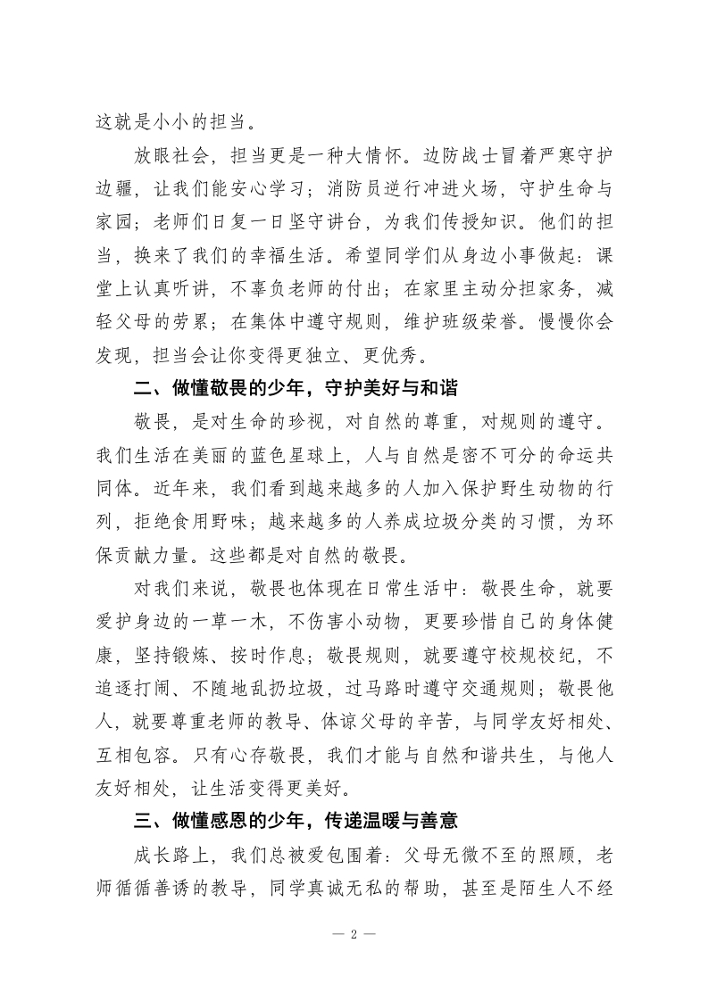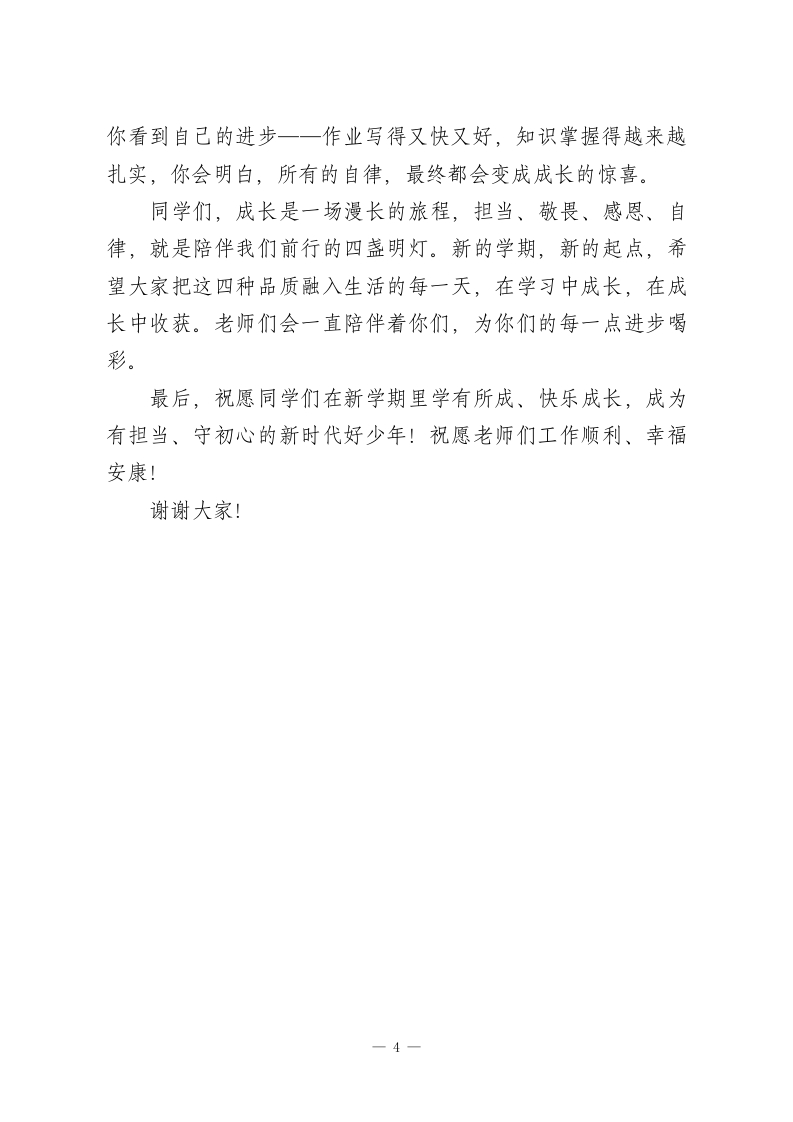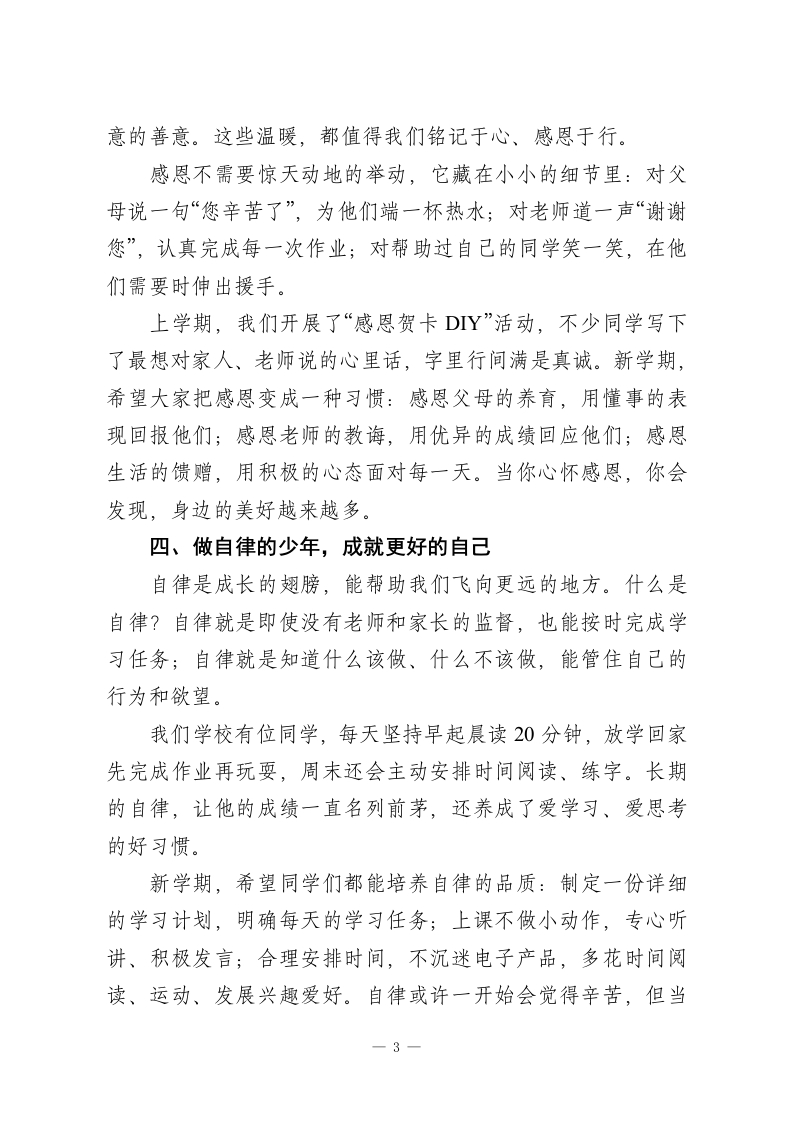 2026年春季学期小学校长思政第一课:做有担当、守初心的新时代好少年亲爱的老师们、同学们:大家上午好!春回校园,万物复苏。在这充满希望的2026年春季学期,我们迎来了新学期的思政第一课。思政课是滋养心灵、塑造品格的重要课堂,今天,我想和大家聊聊“成长”这个话题一一在新时代的浪潮中,我们该如何成为有担当、守初心、能成长的好少年。过去的一年,我们见证了太多温暖与力量:航天人接续探索浩瀚宇宙,让中国空间站持续绽放光彩;科研工作者深耕实验室,攻克一个又一个技术难题;身边的志愿者们默默奉献,用行动温暖社区、守护校园。这些榜样用实际行动告诉我们:担当不是一句口号,而是融入日常的责任;成长不是孤军奋战,而是与时代同频、与他人同行。新学期,希望每一位同学都能朝着这四个方向努力,成为更好的自己:一、做有担当的少年,扛起责任与使命担当是什么?对我们小学生来说,担当是认真完成每一次作业,是主动捡起校园里的垃圾,是看到同学有困难时伸出援手,是对自已的学习和行为负责。还记得2025年夏天,我们学校组织“校园绿植养护”活动,不少同学主动认领绿植,每天按时浇水、记录生长情况,哪怕周末也不忘叮嘱家长帮忙照看,最终让校园里的绿植枝繁叶茂。1