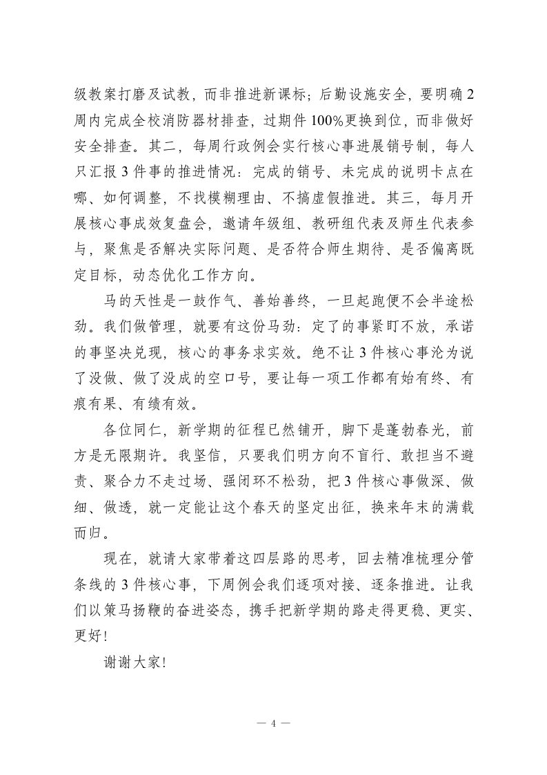 2026年春季学期行政班子会议,校长讲话:最核心的3件事,只要3件!各位行政同仁、各位主任:大家早上好!农历马年春启新程,恰是马蹄踏春催奋进的时节。新学期首次行政班子相聚,窗外春光正好,校园里师生的步履渐频、笑语渐浓。每次开学,我总生出一种感触:开学从不是简单的时间节点,而是一场凝心聚力的集体出征。既然要并肩启程,我们必先厘清一个核心问题一一这条路,该如何走得稳、走得实、走得远?今天不谈空泛道理,就围绕走好新学期之路,与大家分享四层心得。第一层:看清脚下路—明方向,不盲行开学最初两周,最易陷入忙而无序的困境:条线计划要落地、师生状态要调适、安全隐患要排查、上级部署要承接,千头万绪容易让人脚不沾地却成效不明一一忙了一整天,回头细数,却道不清核心事推进了多少。在此明确要求:各位主任务必于本周内,梳理出分管条线新学期最核心的3件事,不求面面俱到,但求精准聚焦。教务口:课程表无缝衔接、新课标关键节点落地、毕业班备考节奏精细化,这三件是否直击核心?德育口:学生返校心理调适与疏导、常规管理机制重启固化、重点学生跟踪帮扶闭环,这三项是不是德育工作的重中之重?后勤线:设施设备安全排查闭1