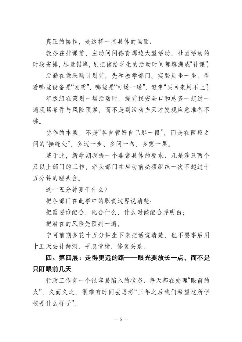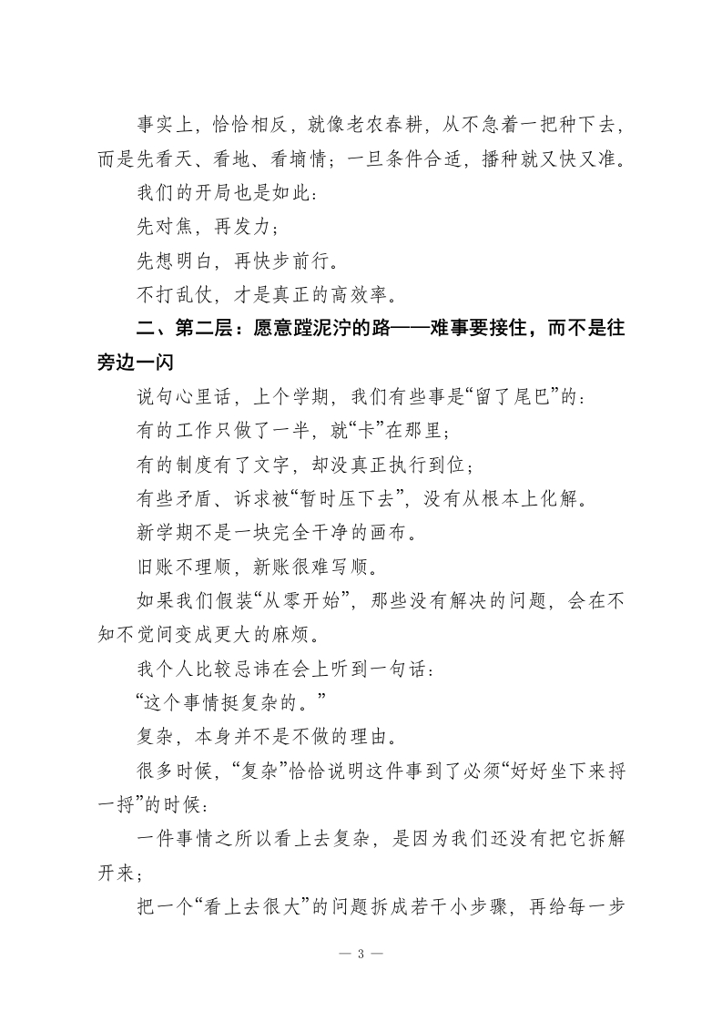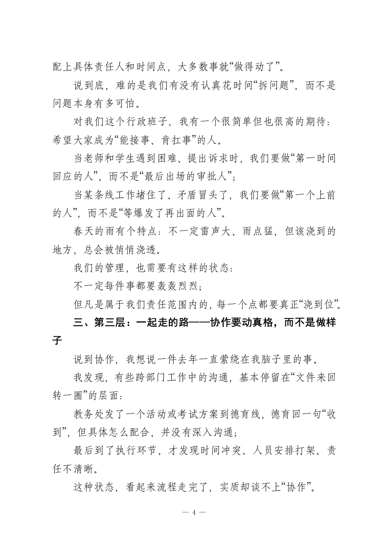2026年春季学期行政班子会议:忙而不乱、难事敢接、协作动真,三句约定!各位行政同仁、各位主任:早上好,新年好!马年春到校园,脚步声和笑声让这片地方又鲜活了起来。今天是新学期行政班子第一次正式“集结”,透过窗子往外看,树梢已经泛绿,操场上渐渐热闹起来。每到这个时候,我都会特别强烈地感受到:开学,绝不只是日历上的一个日期,而是我们这一支队伍整装再出发的起点。既然是一次“集体出发”,那有一个问题,必须要先想清楚这条路,我们要怎么走?今天我不想做一份“工作任务清单”的朗读者,而是想跟大家聊一聊,我们作为这所学校的行政骨干,如何把接下来的路走稳、走顺、走远。我想用“四层路”来和大家一起对一对方向。一、第一层:看清脚下的路一一一开始就要想明白,而不是先乱跑每个学期开头的两周,对行政来说是“最忙乱”的时段之一:各处室的工作计划要落地;老师、学生的状态要调整;校园安全隐患要全面排查;上级的新政策、新检查安排也会陆续下达。在这样的环境下,我们很容易陷入一种状态:1