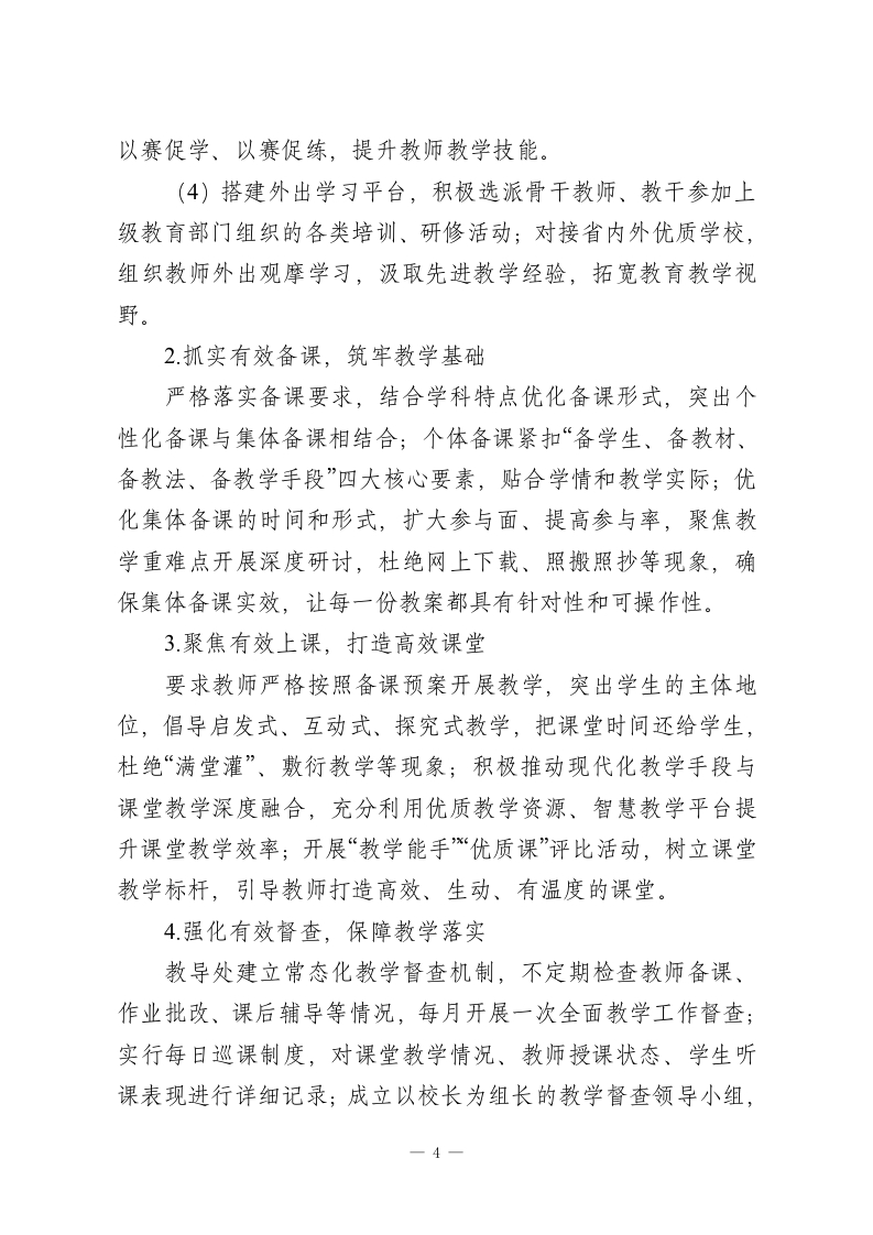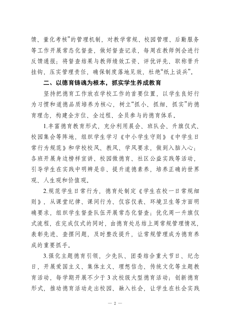 2026年春季学期学校工作思路:精耕细作提质效,凝心聚力攀新高2026年春季学期是学校提质增效、内涵发展的关键阶段,为进一步夯实办学基础、优化管理体系、提升教育教学质量,推动学校各项工作再上新台阶,结合教育发展新形势和学校办学实际,特制定本学期六条工作思路,明确工作方向、聚焦工作重点、狠抓工作落实,确保学校发展行稳致远。一、以精细化管理为核心,筑牢办学发展根基精细化管理是提升学校办学质量的重要保障,本学期将以制度建设和执行力提升为抓手,推动学校管理规范化、科学化、高效化。1.严格规范办学行为,全面落实上级教育主管部门关于办学行为的各项规定,坚守教育初心,恪守办学底线,做到依法办学、依规治校。2健全完善制度体系,对学校教学管理、学生管理、后勤管理、安全管理等各项工作进行全面梳理细化,结合学校发展实际修订和出台相关制度文件,让各项工作有章可循、有规可依,实现管理全覆盖、无死角。3深化校际联动交流,主动对接区域内优质兄弟学校,加强学习交流与合作,借鉴先进管理经验和办学模式,结合本校实际优化完善制度体系,让制度更贴合学校发展、更具实操性和实效性。4.强化制度执行落地,建立“专人负责、分项督查、及时反一1