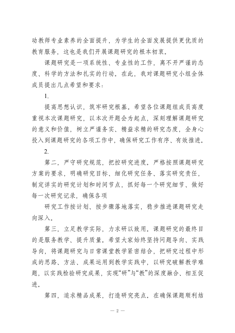 2026年春季学期学校课题开题会校长讲话:以课题研究赋能教育高质量发展各位领导、各位老师:大家上午好!今天,我们齐聚一堂,隆重召开学校课题开题会,共同见证我校教科研工作迈出新的步伐。首先,我谨代表学校全体师生,向莅临本次会议指导课题研究工作的各位领导表示热烈的欢迎和衷心的感谢!你们的到来,既是对我校教科研工作的肯定与支持,更能为我们的课题研究指明方向、保驾护航。教育科研是立校之本、强师之基,更是推动教育教学高质量发展的核心动力。一直以来,我校始终坚持走“科研兴校、质量立校、科研强师”的发展道路,将教科研工作摆在学校发展的重要位置,不断完善教科研管理制度,搭建教师专业成长平台,鼓励全体教师立足教学实际、聚焦教学难题,积极开展课题研究和教学探索。在全校教师的共同努力下,我校教科研工作取得了可喜的成绩,多位教师的教研论文、教学设计、教学成果在省、市级评比中斩获佳绩,一批青年教师在教科研实践中快速成长,为学校教育教学质量的稳步提升奠定了坚实基础」本次开题的课题,是我校教师立足新课标理念、结合教学实际精心申报的研究成果,选题紧扣当前教育教学改革的核心方向,贴合我校课堂教学的实际需求,兼具实践性、针对性和创新性。课题的研究,既有助于我们破解教学中的实际难题,优化教学方法、提升教学效率,更能以研促教、以研促学,推1