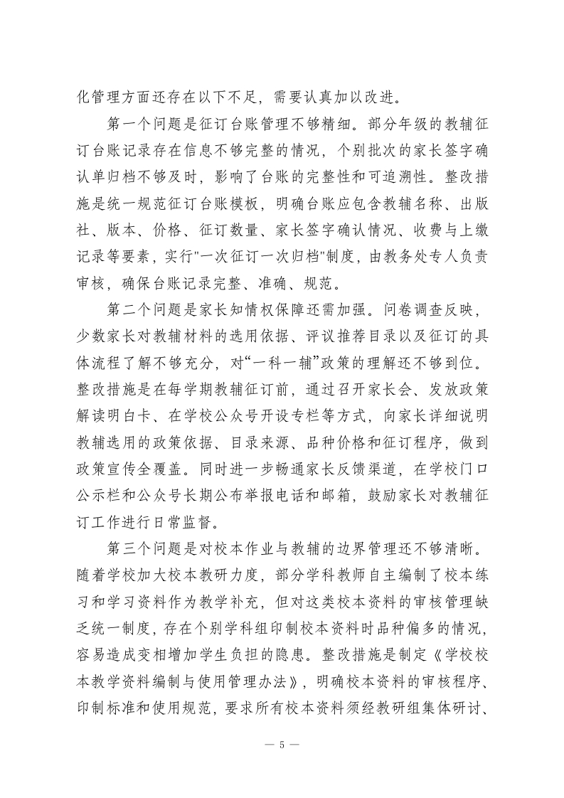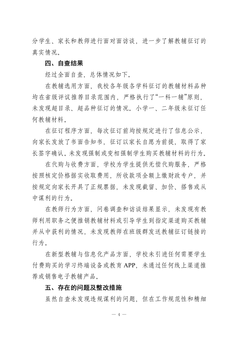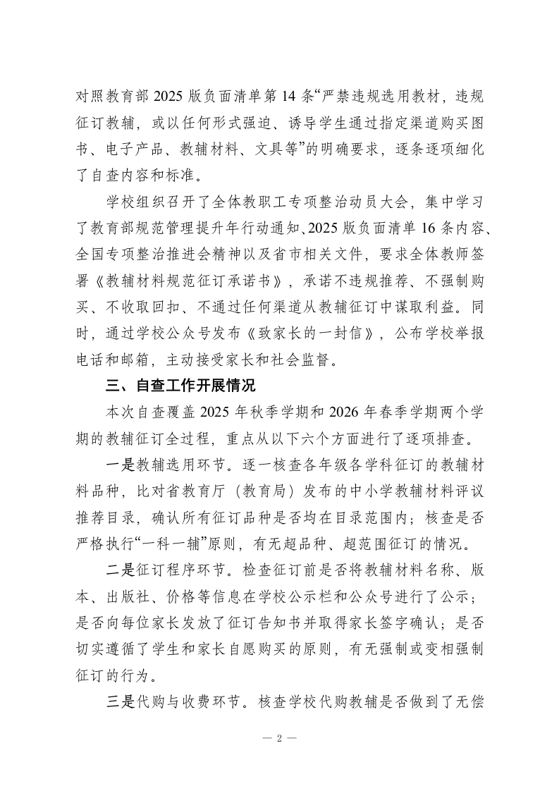 2026年中小学征订教辅谋利问题专项整治自查报告为深入贯彻落实教育部《关于开展基础教育规范管理提升年行动的通知》及《基础教育规范管理负面清单(2025版)》精神,认真落实2025年7月全国中小学深化“校园餐”专项整治和开展利用征订教辅购买校服谋利等问题专项整治推进会部署要求,按照省(市、区)教育局关于征订教辅谋利问题专项整治工作的统一安排,我校高度重视、迅速行动,对2025一2026学年教辅材料征订工作进行了全面、深入的自查自纠。现将有关情况报告如下。一、学校基本情况我校是一所公办九年一贯制学校(或:完全小学/初级中学/完全中学),现有教学班XX个,在校学生XX人,在编教师XX人。学校始终坚持立德树人根本任务,严格落实国家和省市关于规范办学的各项规定,致力于为学生提供公平、优质的教育服务。二、组织领导与工作部署接到上级关于开展征订教辅谋利问题专项整治工作的通知后,学校第一时间召开党政联席会议进行研究部署,成立了以校长为组长、分管教学副校长为副组长、教务主任、德育主任、总务主任、各年级组长、教研组长及家长委员会代表为成员的专项整治工作领导小组,明确了职责分工和工作时间表。学校制定了《征订教辅谋利问题专项整治工作实施方案》,1
