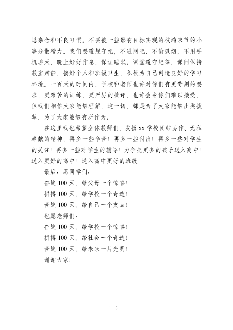 2026中考百日冲刺,初中校长动员讲话,最后向大家提出3点要求和希望各位老师、家长、亲爱的同学们:大家好!今天,我们在这里隆重召开Xx届中考百天誓师大会。首先我代表学校向百忙之中参加我们这次誓师大会的家长代表表示热烈的欢迎!向辛勤工作在教学第一线的老师们表示衷心的感谢!向刻苦学习、努力拼搏的同学们致以亲切的问候和良好的祝愿!同时也对上学期末你们取得的优异成绩表示热烈的祝贺!几年来,我校在全体师生员工的努力下,得到了跨越性发展,中考成绩一步一个台阶,教育教学质量稳步提升。2022年中考成绩创历史新高!我校366名考生,500分以上48人。今年,我们师资力量更强,学苗更好,我坚信今年的中考成绩将更加辉煌!亲爱的同学们,还有100天,严格说还有99天我们就要奔赴中考的战场!面对中考,有些同学忘我学习,即使课间也争分夺秒,每天晚上在宿舍里总能看到他们手电光下夜读的感人情景。同学们,学校也尽一切可能为你们提供良好的学习环境,尽一切可能保证你们充足的学习时间。今天就要为你们加第三节晚自习,解决你们打手电看书的不便。面对中考,父母对你们更是一次次语重心长的叮咛!老师对你们更是谆谆教诲,细心辅导!我们该如何过好这100天呢?同学们,我代表学校向大家提1